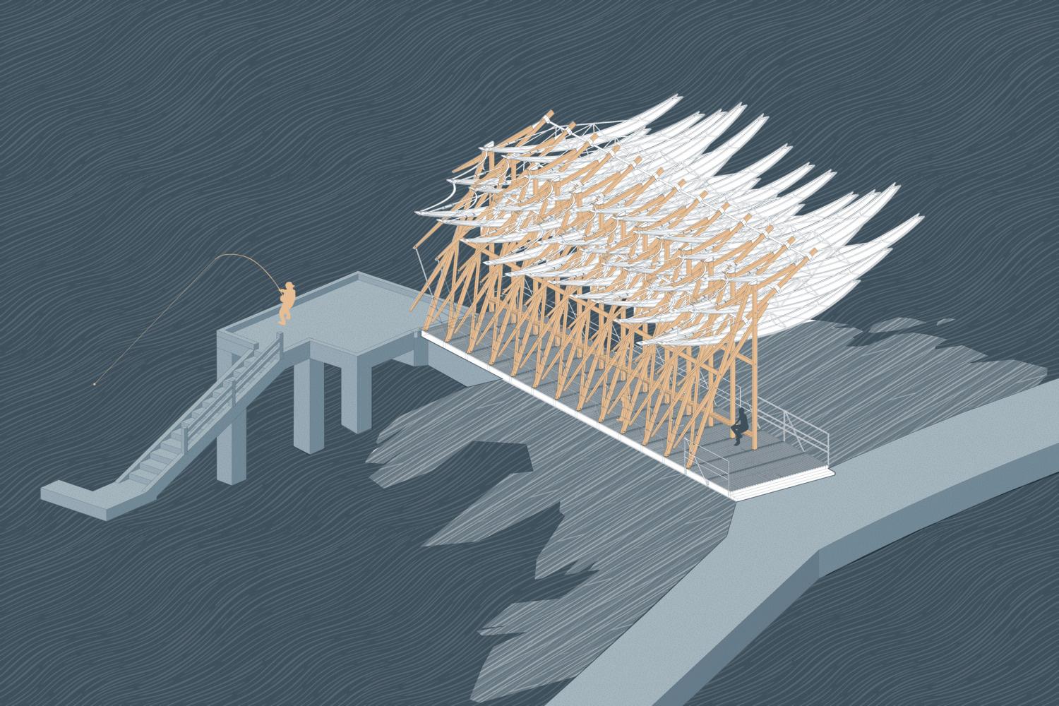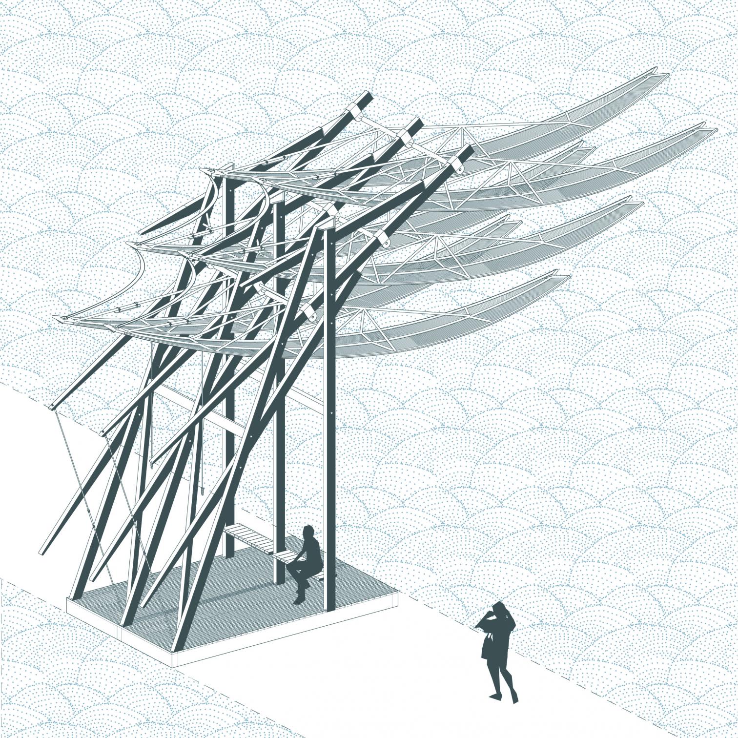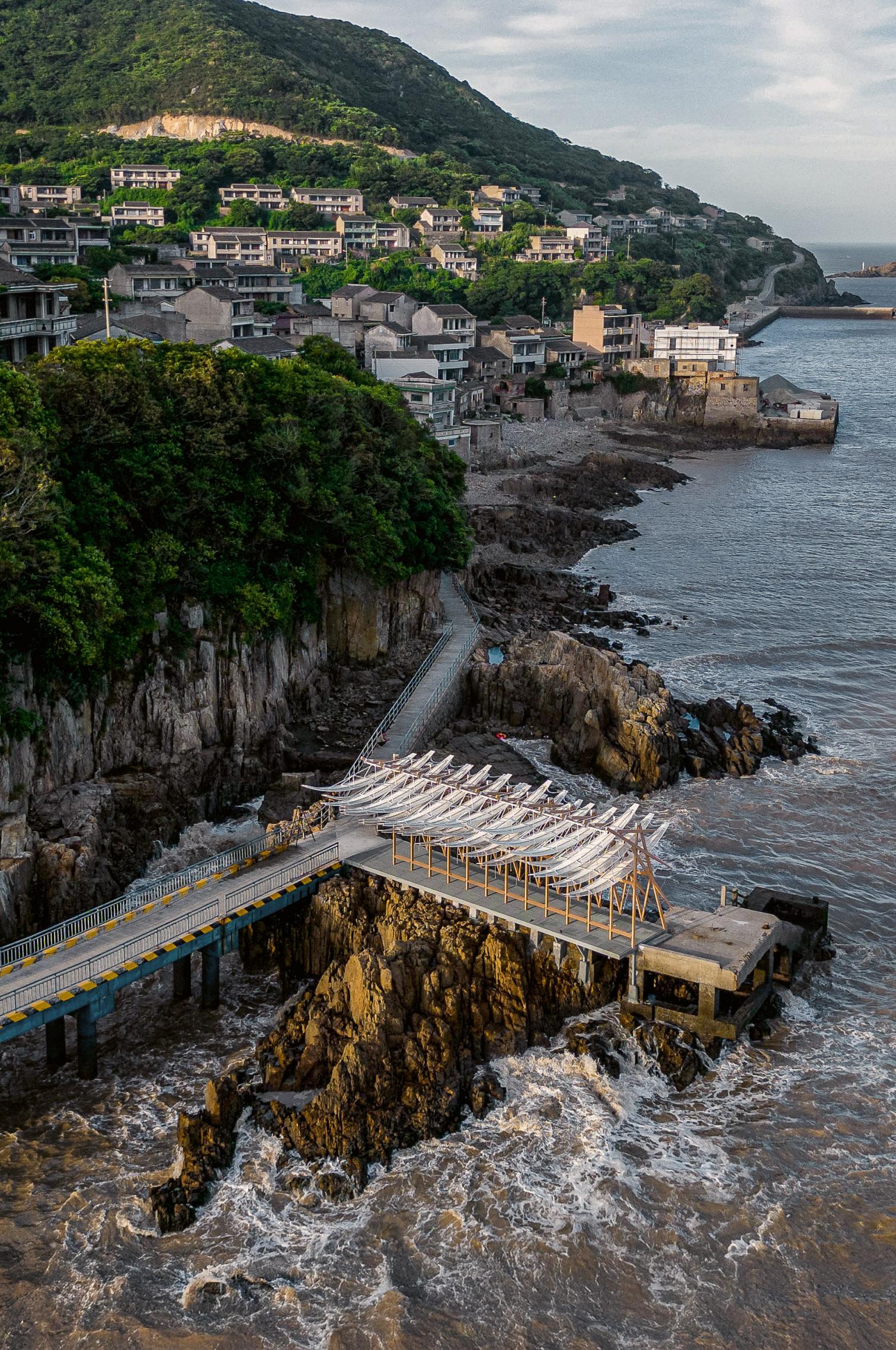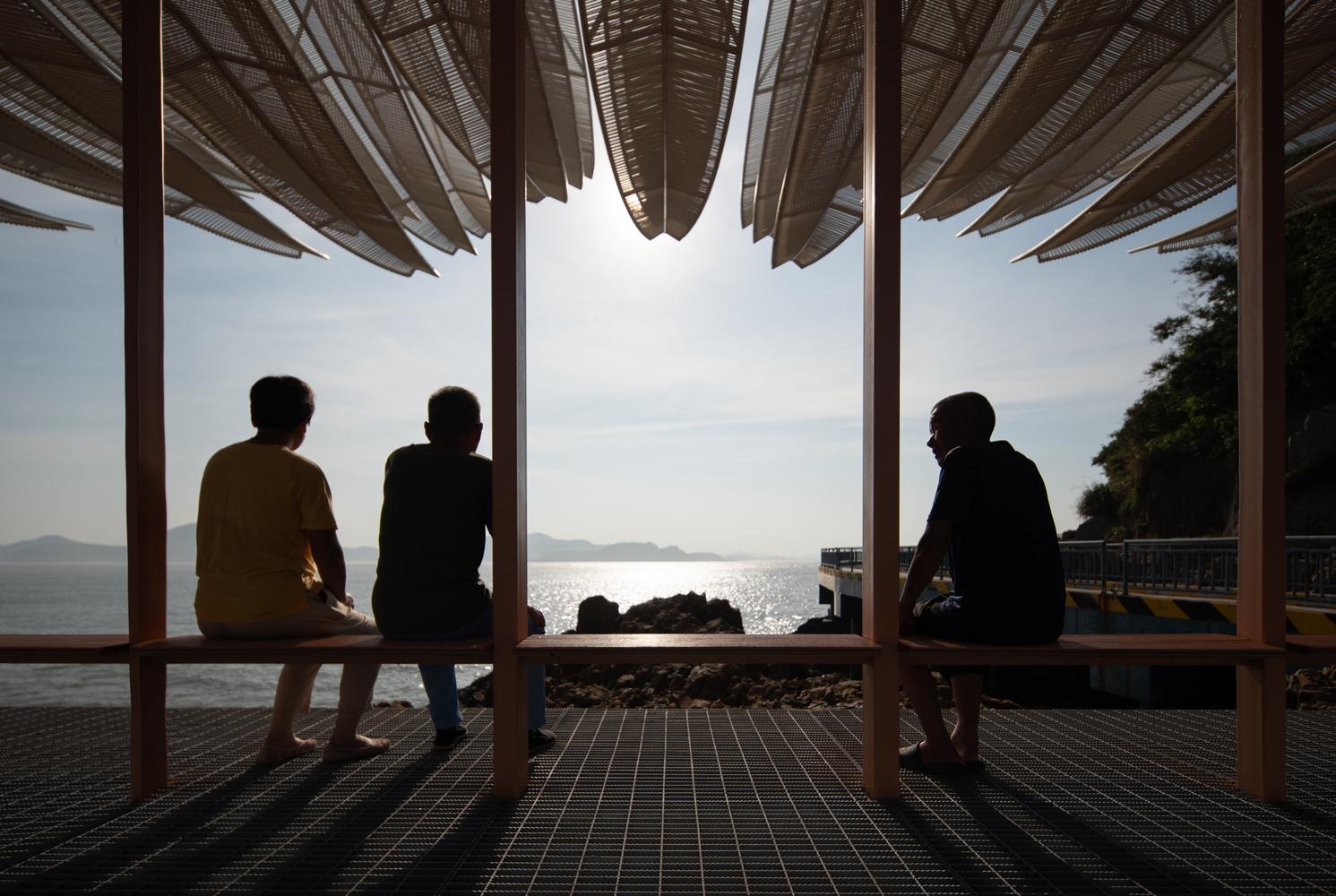 The elderly of Chaishan Island still fondly remember that its rugged coast – now only visited by the occasional ferry – was up to not long ago a thriving port, where arriving sailors were welcomed under the trees that stood at the entrance into the village. To save this image for posterity, the renovation of a defunct cargo pier has included installing a marquee with the skeletal anatomy of Theo Jansen’s kinetic ‘strandbeests,’ in which a wing of sorts flutters as it shades a lookout platform. Held up by a framework of galvanized steel treated to resist the saline atmosphere, and raised over a floor of railings that give a view of the pavilion’s anchorage to the rocks below, the roof is formed by thirty-six plastic ‘feathers’ reinforced with fiberglass, lightweight blades providing protection against ultraviolet radiation. Thanks to a system of counterweights and hinges, the mechanism is flexible, swaying gently in the sea breeze but having sufficient strength to withstand the inevitable storm, perhaps like a symbol of the headstrong memory that refuses to be blown away by the gales of time.