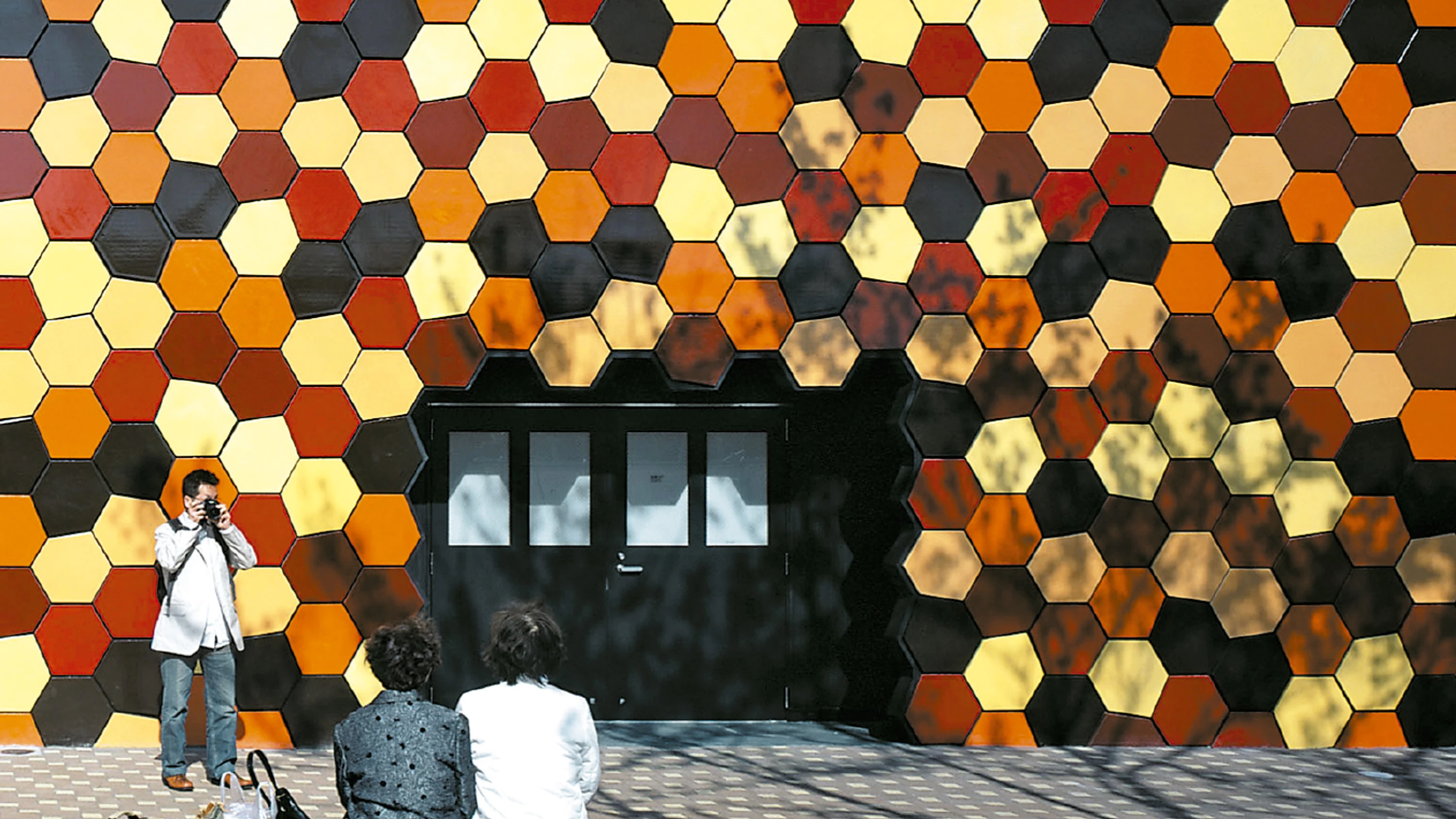 The facade wraps the volume at a distance of 1.5 meters, leaving an interstitial space that aside from performing as a porch to provide visitors with shelter while waiting in line for a long time, it also filters the light that reaches the interior, drawing inspiration from the temples of Kyoto with their use of lattices, very present in Japanese architectural tradition. For the most part the conventional geometric patterns are generated by adding uniform figures that form a pattern of greater scale. Here the challenge was to find an irregular geometry to produce a uniform pattern without repetition, something that has been achieved with six different hexagons. The pieces are connected to one another with steel profiles and adjustable bindings; once the exhibition was over, the colored hexagons were disassembled and donated to the kindergartens of Nagoya for the children to play with and to the municipalities of the region for use as garden sculptures. In this way, the material used to make them, brought from Spain, will stay in Japan for good... [+]