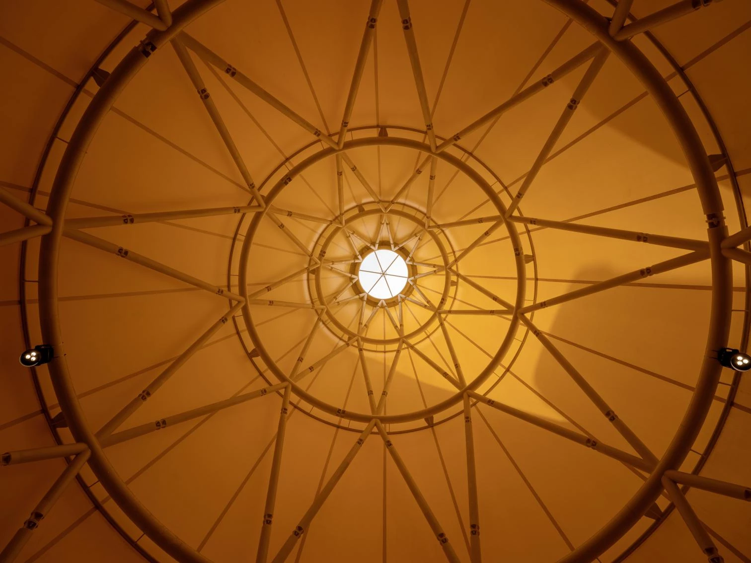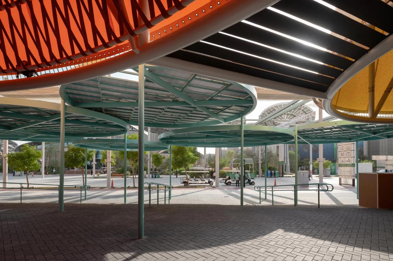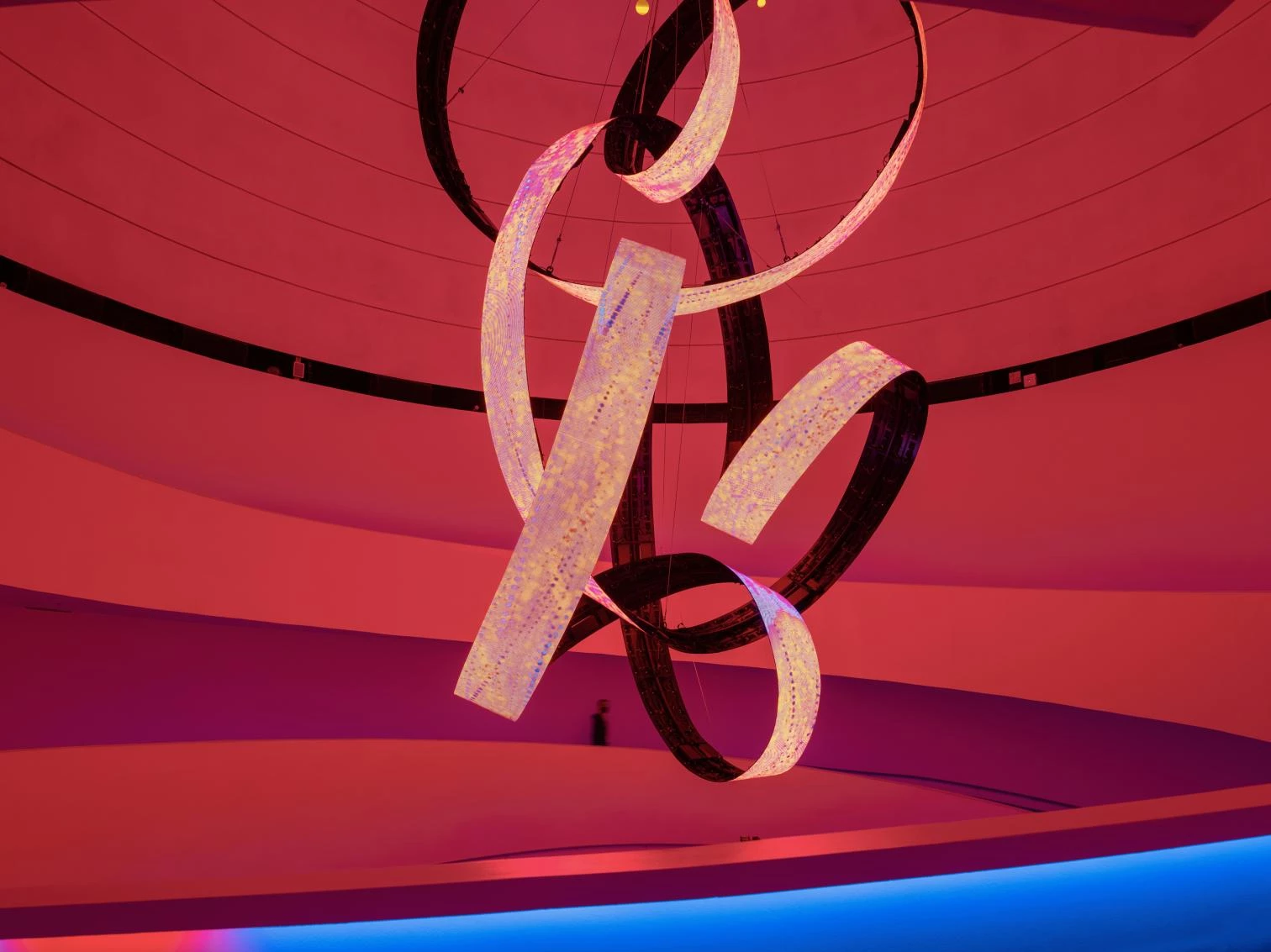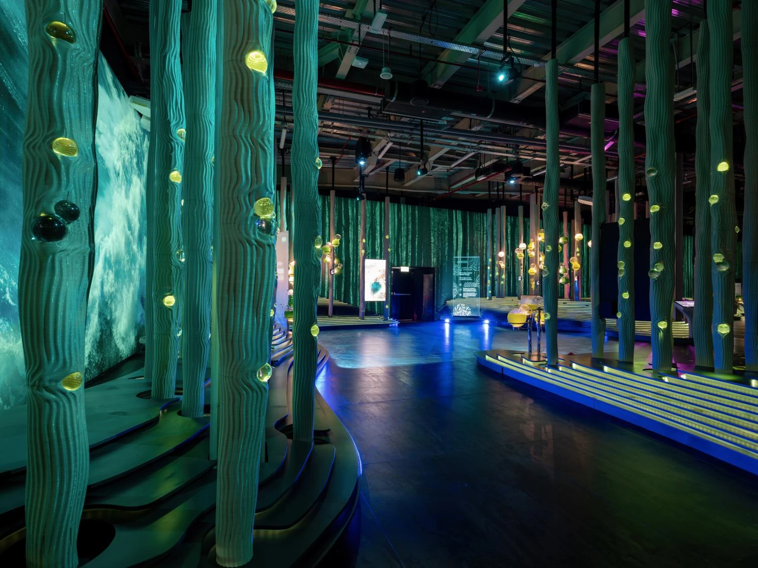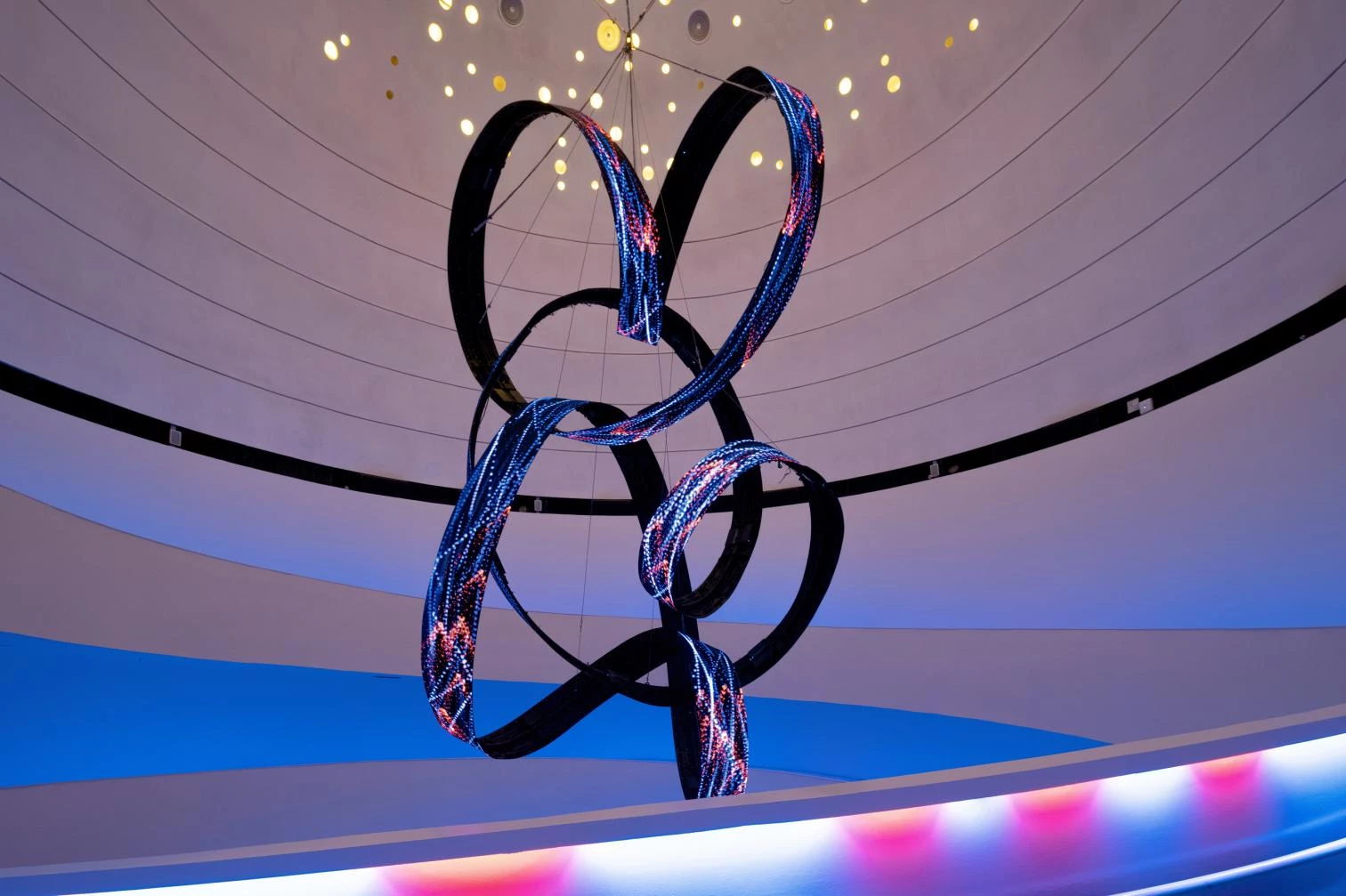 Working around the motto 'Intelligence for Life,' the pavilion features two complementary exhibitions, designed by External Reference (Carmelo Zappulla) and Onionlab (Aleix Fernández): 'Glimmers,' which presents some Spanish contributions to universal culture and our country's ties with the Arab world; and 'The Forest of Intelligence, with trees made of a CO₂-absorbing material, which explains how Spain is taking part in the 2030 Agenda for Sustainable Development. An installation by the artist Daniel Canogar, created specially for the pavilion in collaboration with the composer Francisco López, hangs in the atrium. It comprises three ribbon-like screens, tangled in loops, where audiovisual material keeps changing through the interaction of visitors.