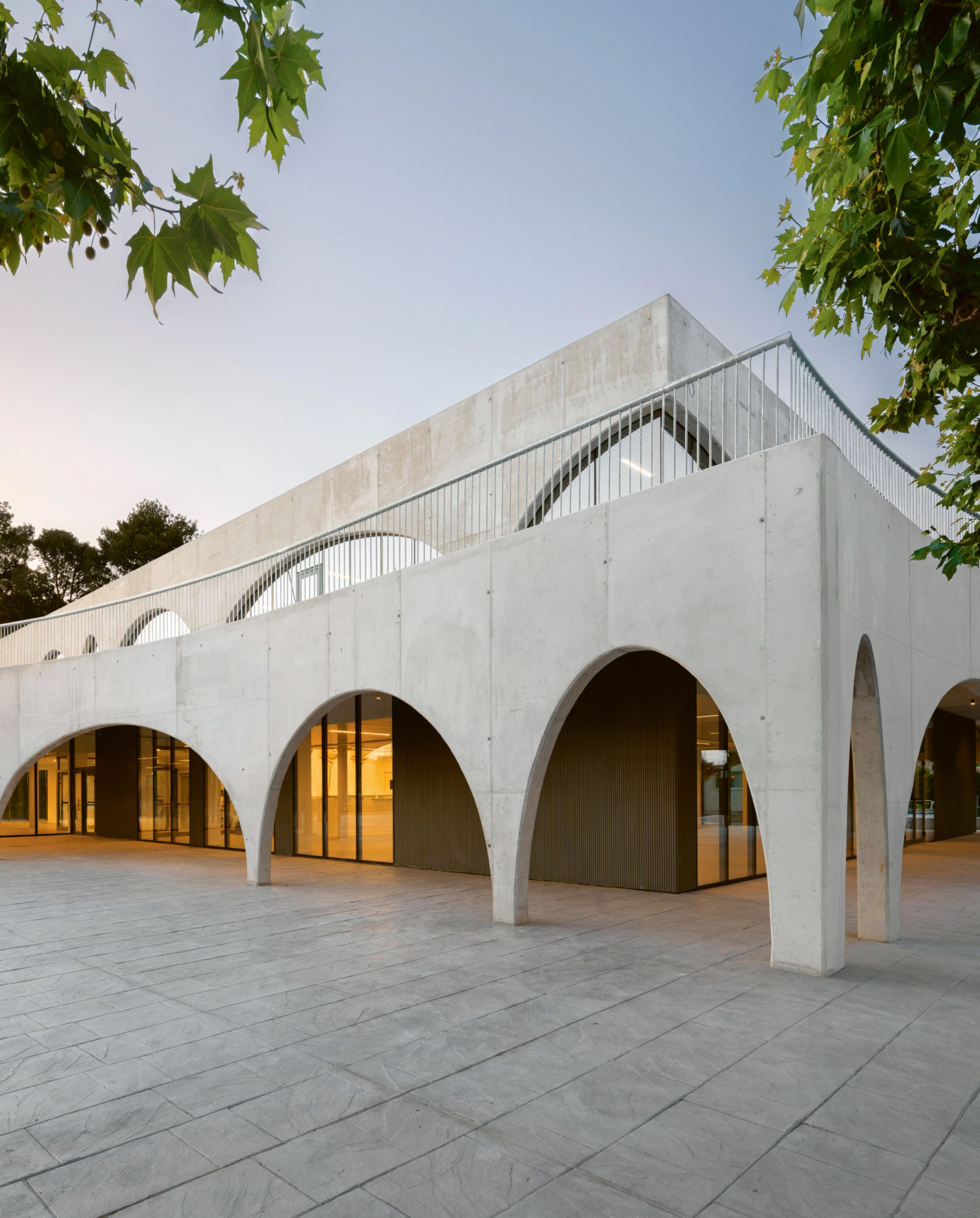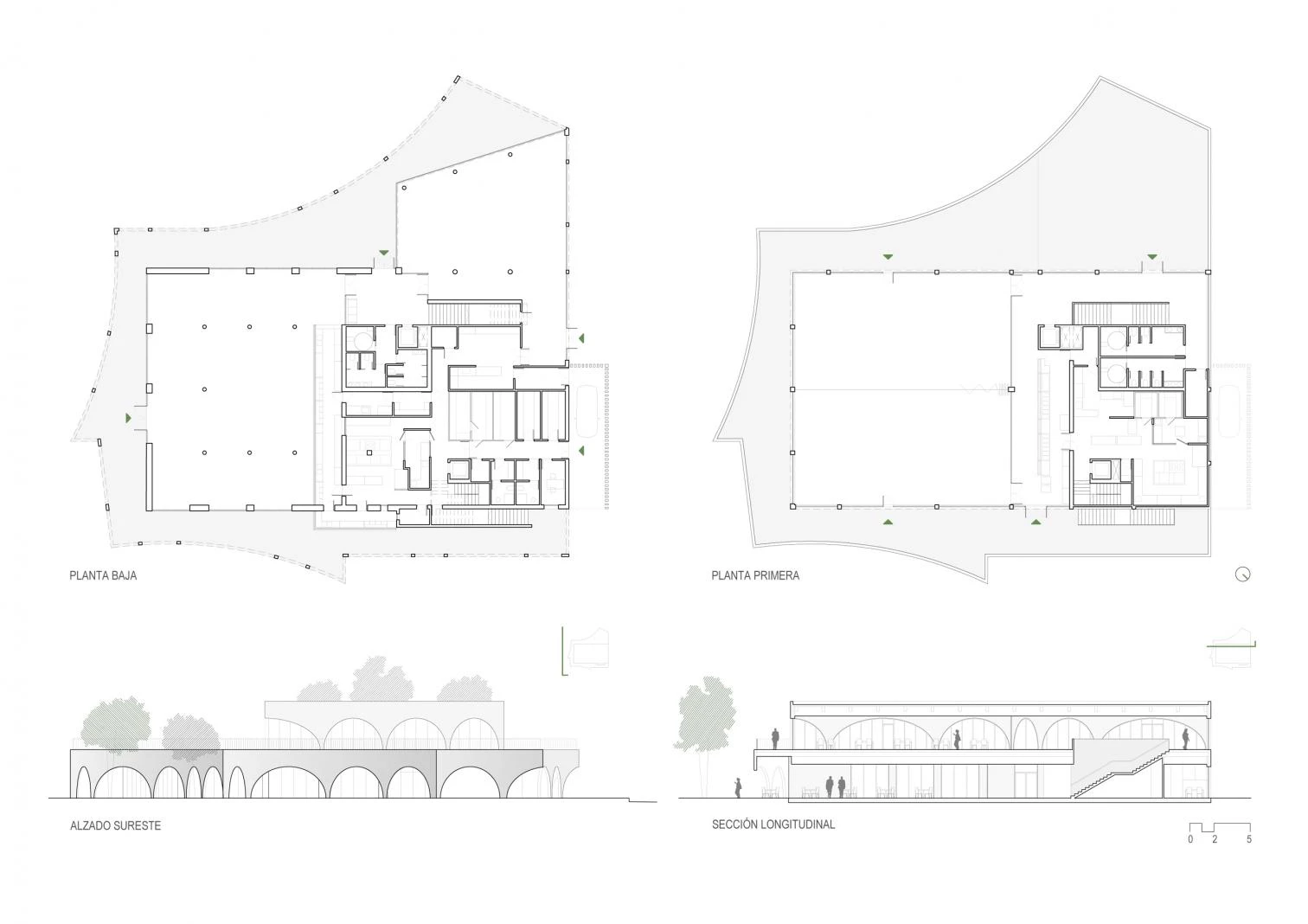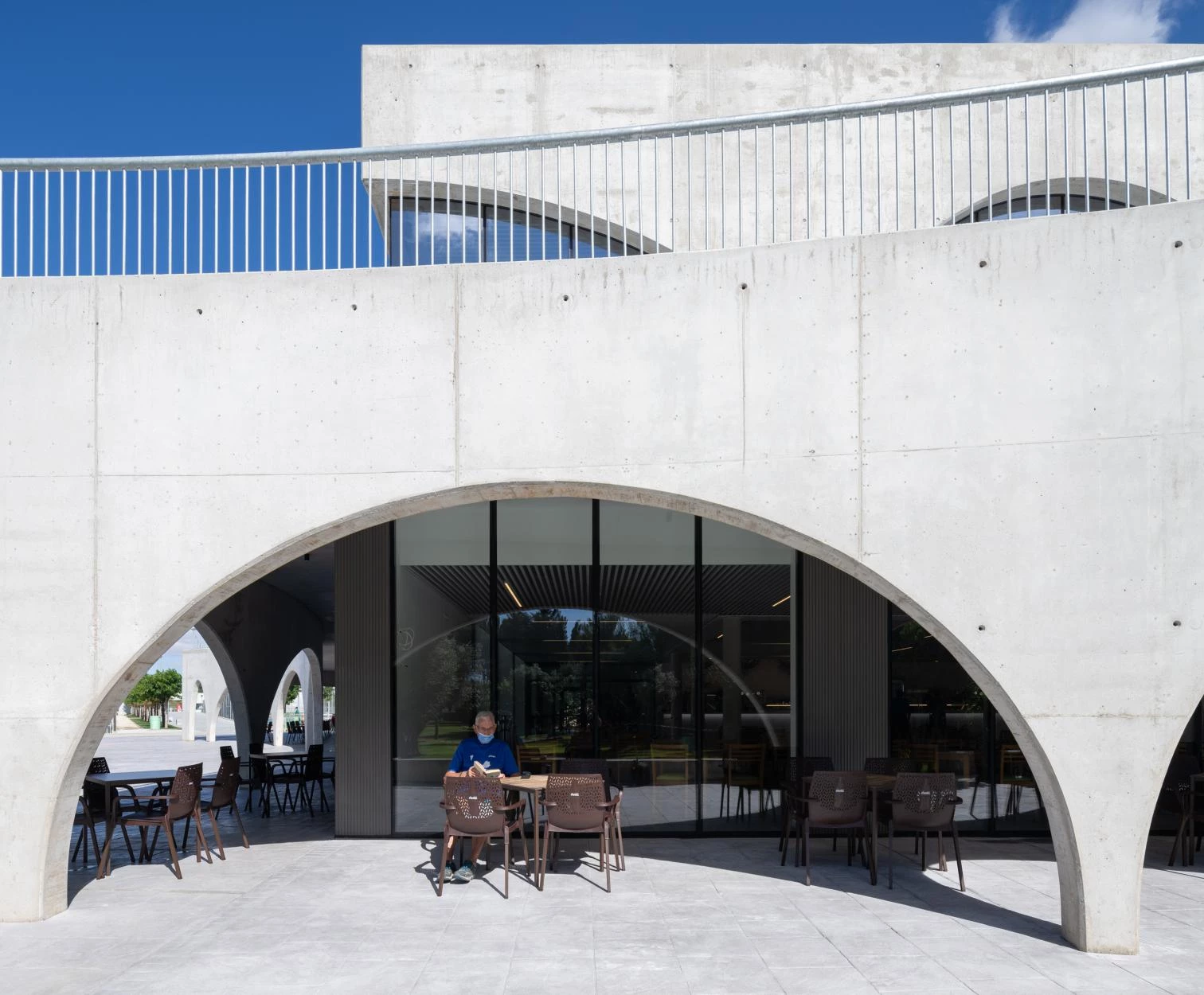 Conceived as a meeting point, the project explores the concept of pavilion surrounded by green areas. The formal proposal materializes the network of paths, which trace the movement of users. By contrast to the previous situation, whereby the original building was surrounded by pergolas for a cafeteria, the new building shapes an exterior loggia that links up with the different routes, inviting users in and favoring interaction.
