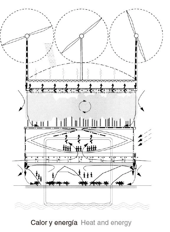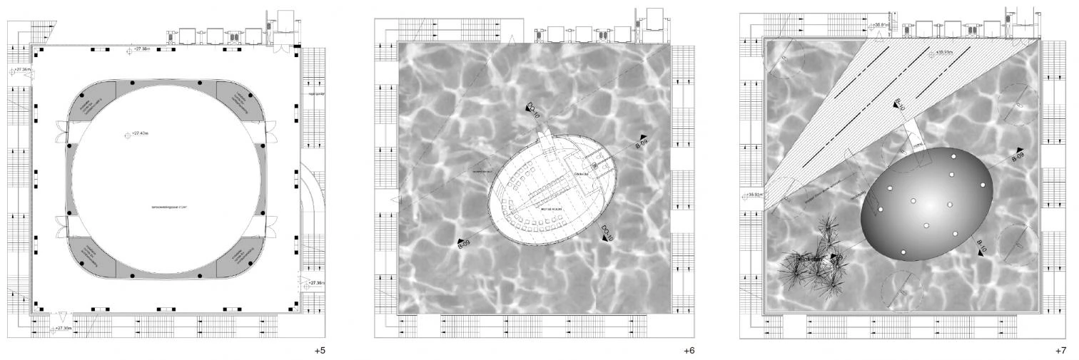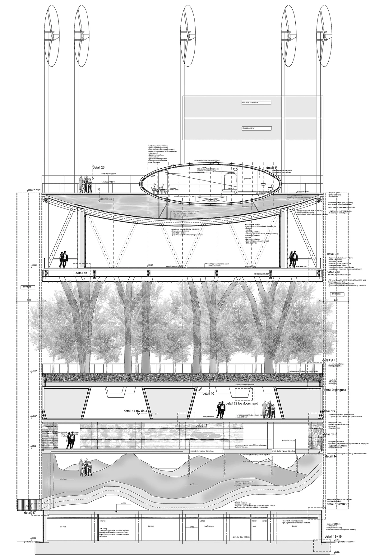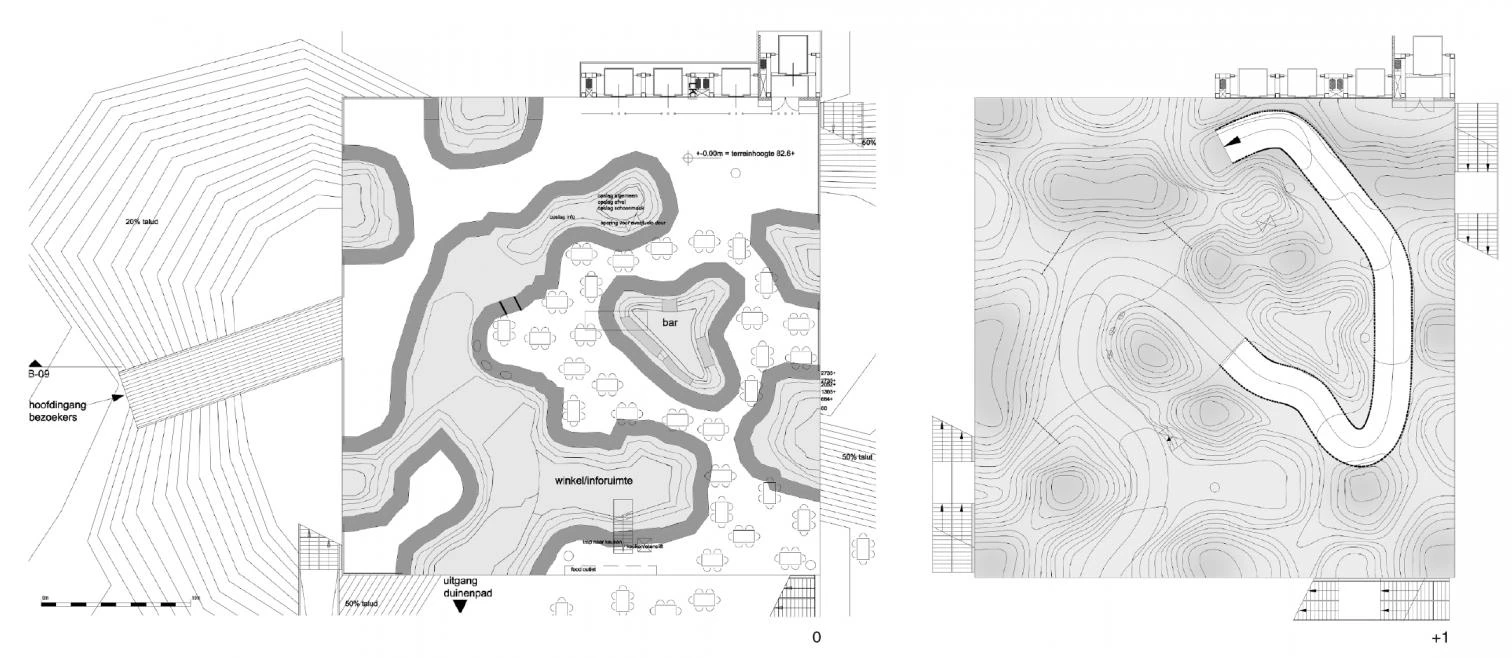The pavilion consists of stacked artificial landscapes that represent Dutch eco-systems, proposing a solution to future need for land. Through the combination of technology and nature, the building underlines the artificial aspect of the latter. In this way nature, arranged in several stacked levels, can offer more public spaces that extend the existing. The building becomes a sort of monumentalized park, and the ground level blends with the environment blurring the boundaries of the entrance. Finally, this stratification of the ecosystem not only saves space, but also makes a more efficient use of energy, water, time, and infrastructures. The density and diversity of the different functions triggers new relationships, turning the building into a symbol of contemporary culture and society.