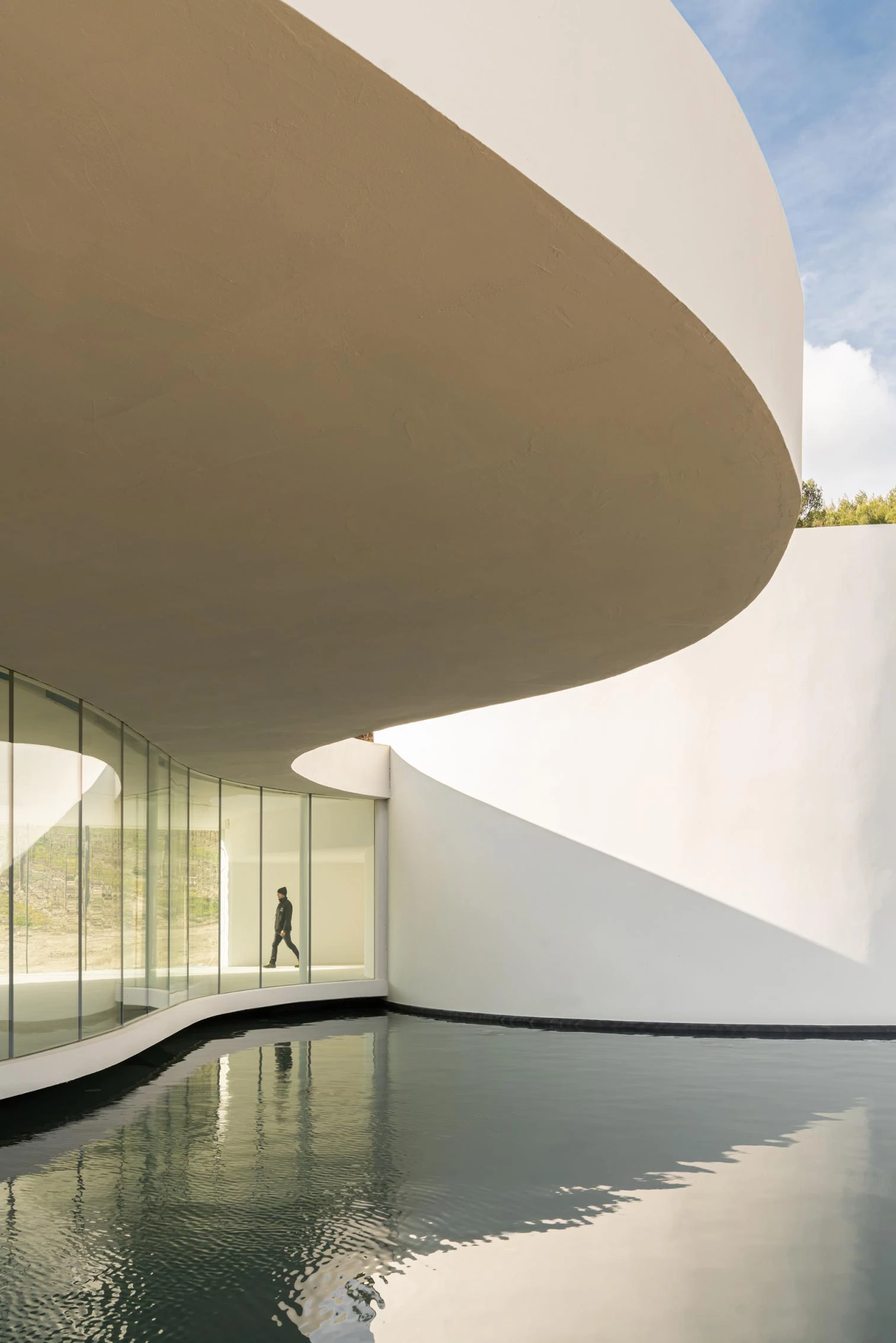 With curving lines reflected in a pool, the building contains a 380-square-meter exhibition gallery and a 140-square-meter auditorium seating an audience of 80. The project was designed in the period between 2010 to 2013, from the time Niemeyer received the invitation to build the pavilion and especially from 2011 on, after his team had made several technical visits to the site.