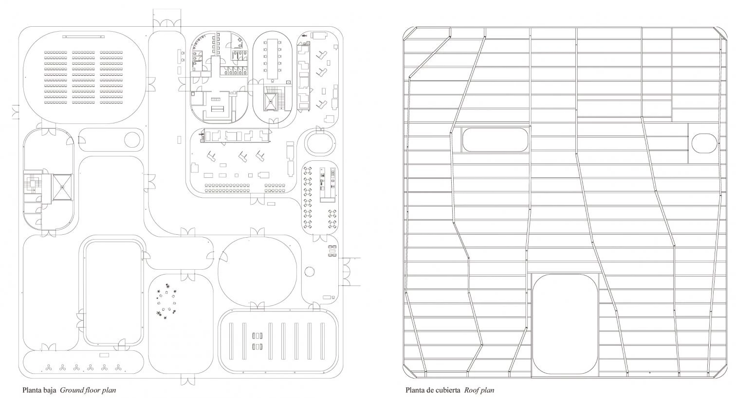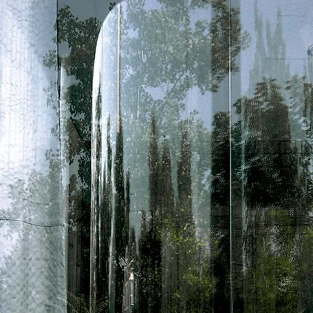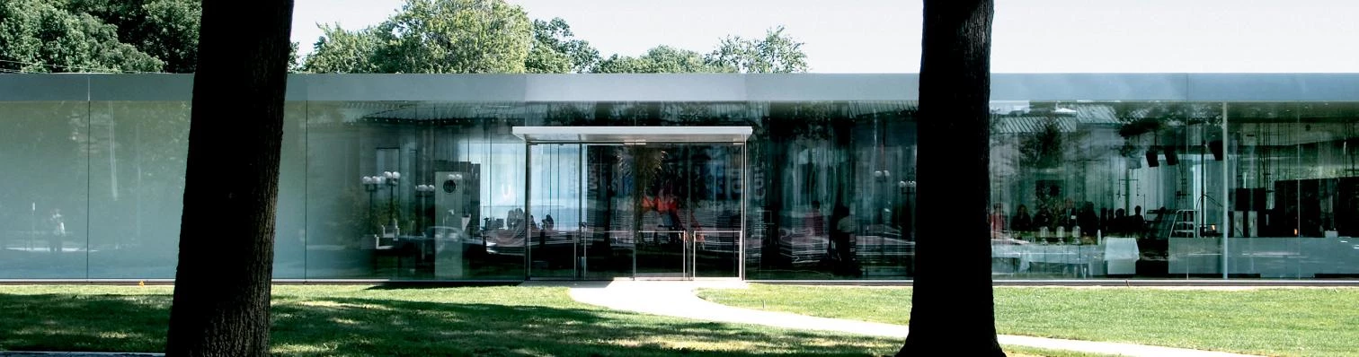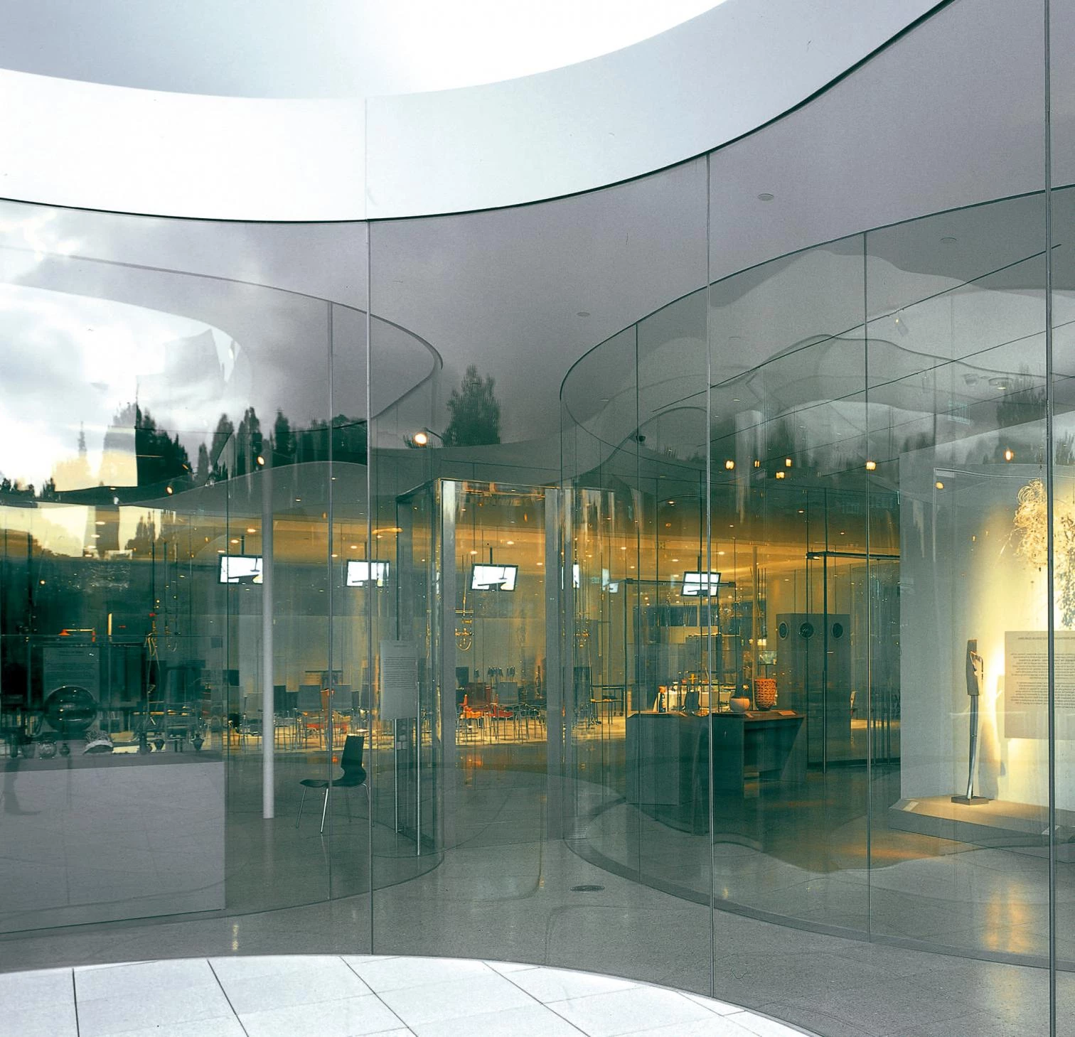The light, low-lying and deceptively simple volume in fact accommodates 7,000-squaremeters of exhibition and storage zones divided into two levels, with the exhibition area on ground floor – conceived as an open-plan space – and a didactic workshop on glass-making in the partially burrowed lower level. Based on a grid of rectangular forms, the floor plan evolved until it reached its current spatial configuration in which the exhibition halls are contained inrounded glass rooms wrapped in a secondary skin of the same material. In these panels the tempered glass – with a greenish hue – has been replaced with a clear glass that brings in the views of the landscape, which accompanies visitors throughout their visit. The continuous skin that wraps the pavilion is topped with a thin and flat roof that rests on circular-section columns, most of which are embedded within those rooms that have an opaque enclosure, and which are therefore used to display the more light-sensitive objects.