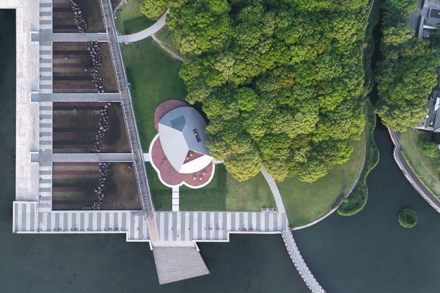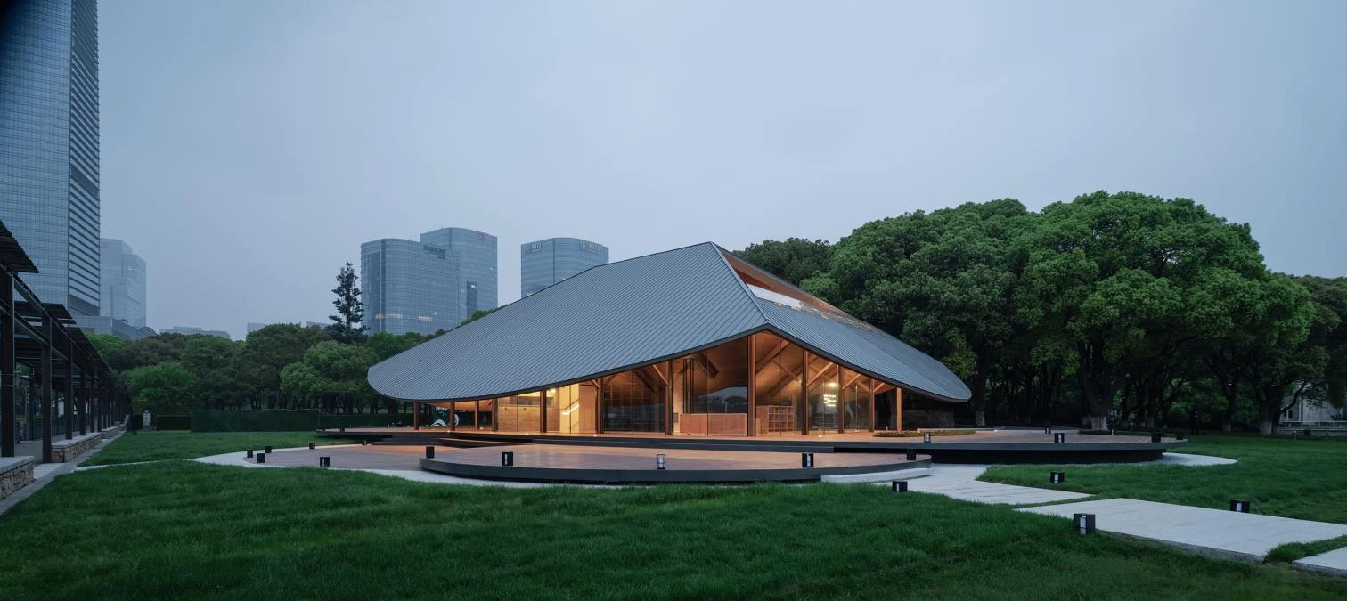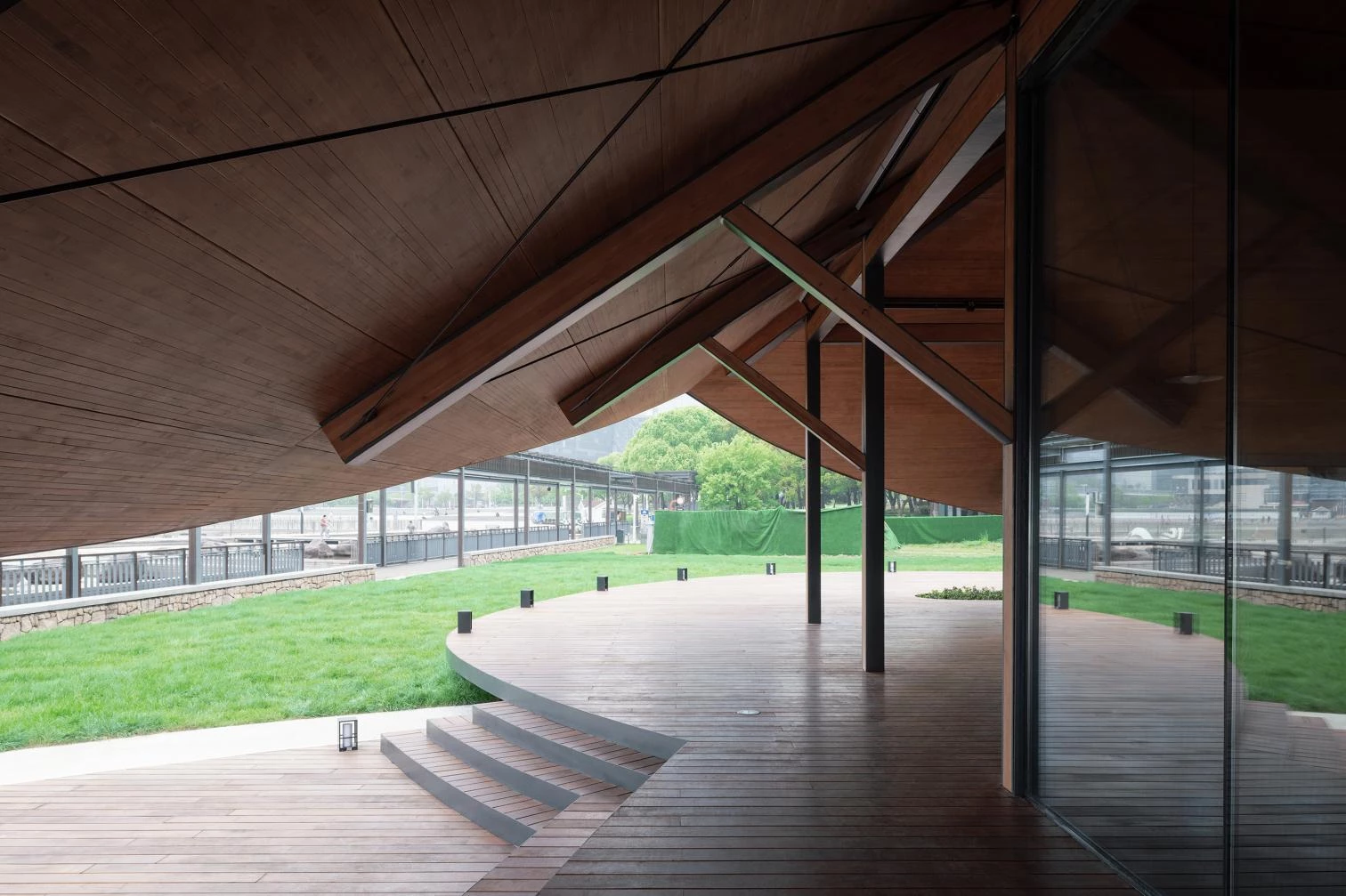 In the industrial park of the Chinese city of Suzhou, around Jinji Lake, stand five public pavilion, five of which are newly buildt and the rest are renovated. An outcome of a 2022 competition, the two-floor wooden cabin – a work of the firm Shanghái Galaxy Arch – features a café, public restrooms, and an observation deck.