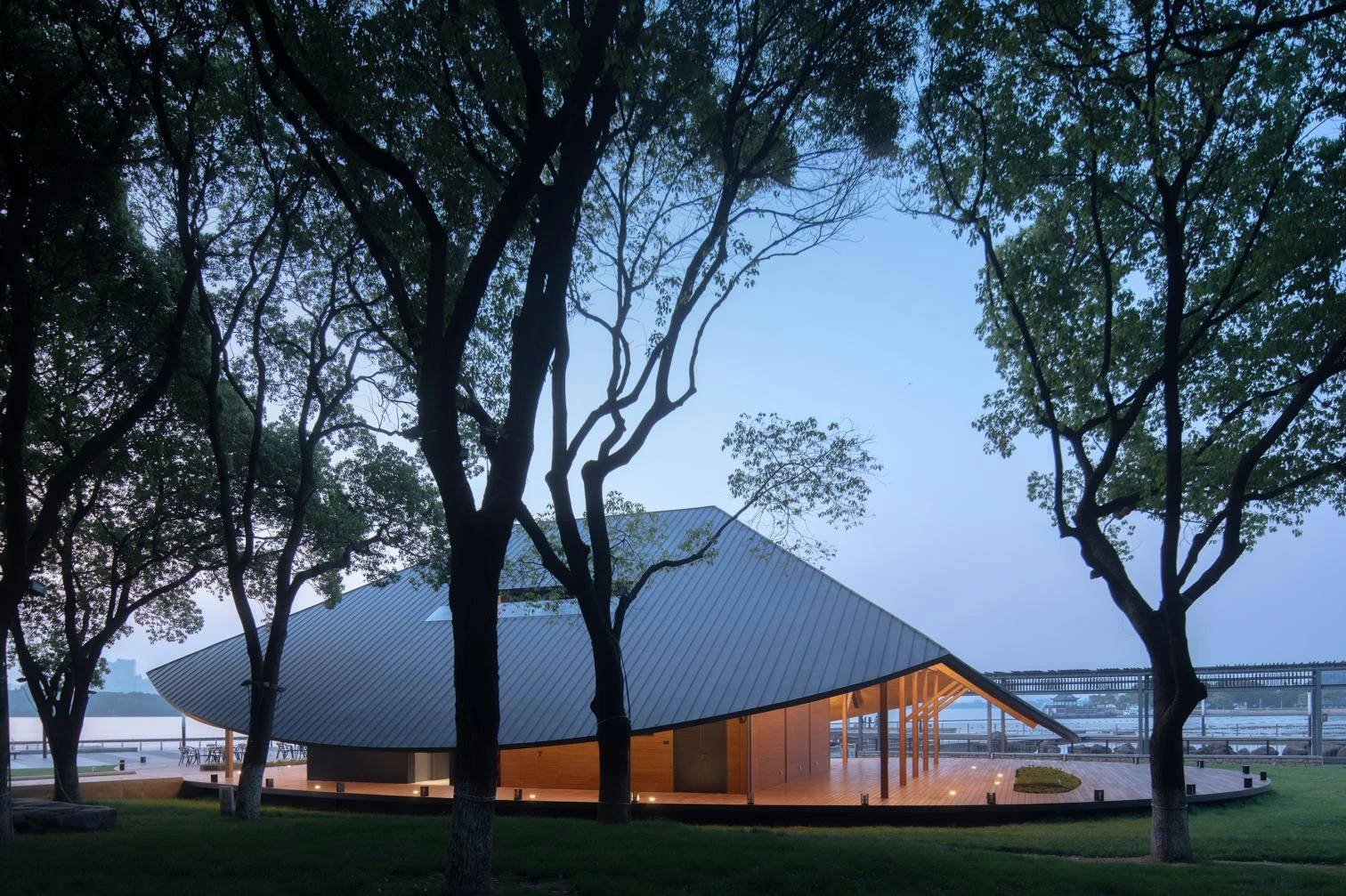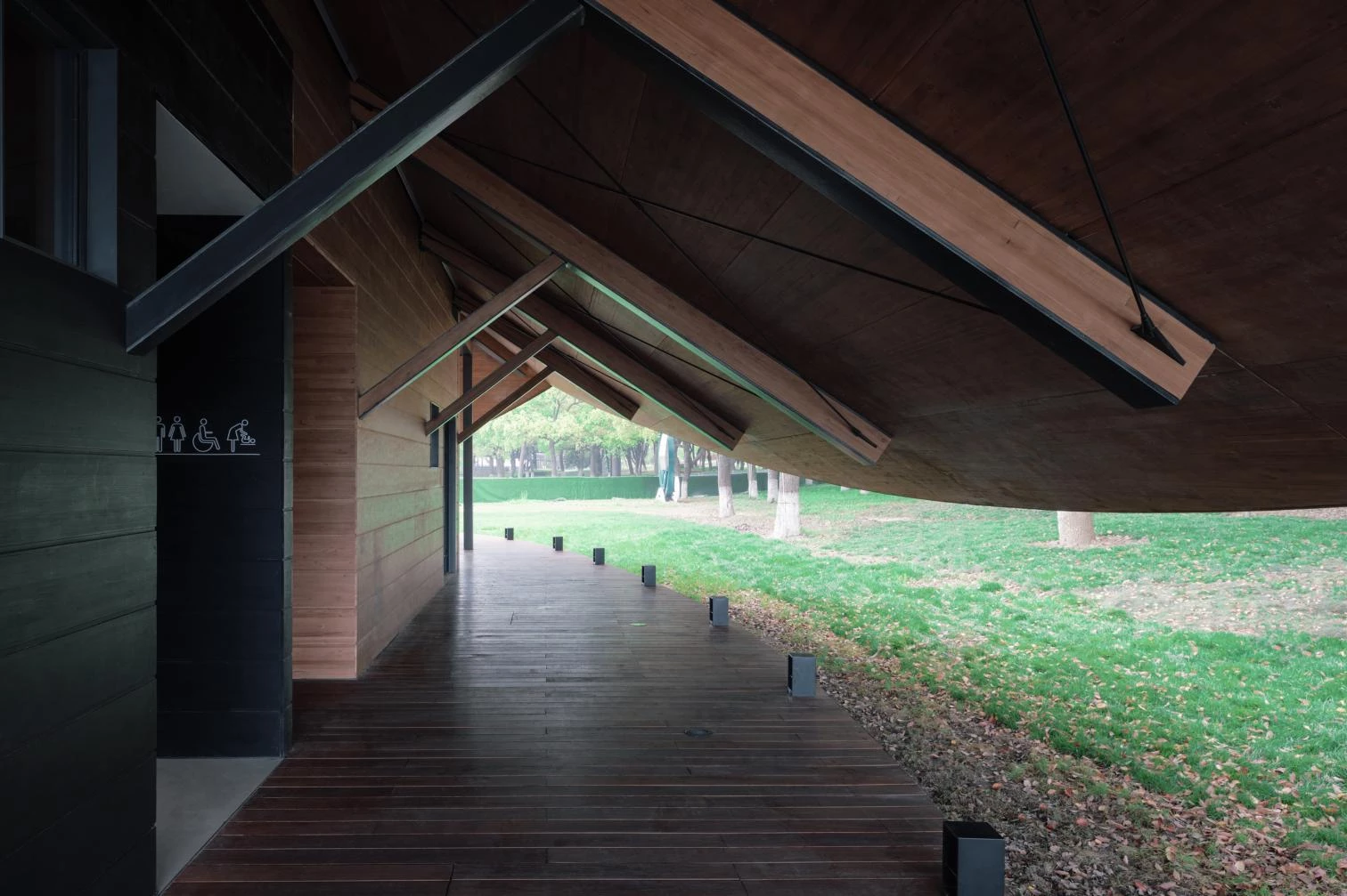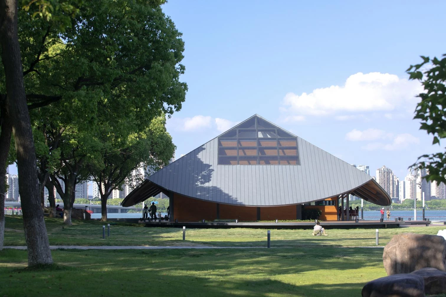 In the industrial park of the Chinese city of Suzhou, around Jinji Lake, stand five public pavilion, five of which are newly buildt and the rest are renovated. An outcome of a 2022 competition, the two-floor wooden cabin – a work of the firm Shanghái Galaxy Arch – features a café, public restrooms, and an observation deck.