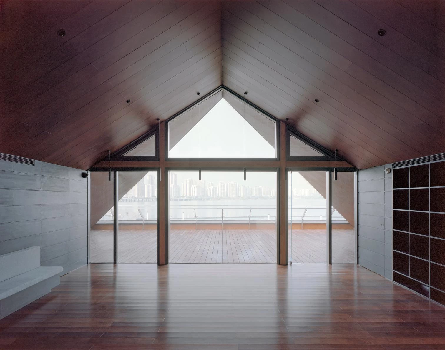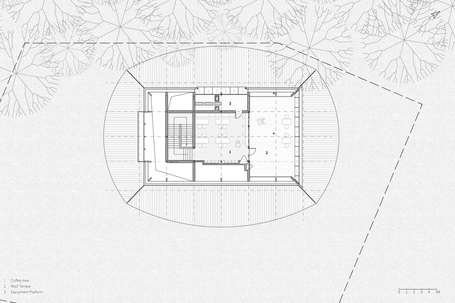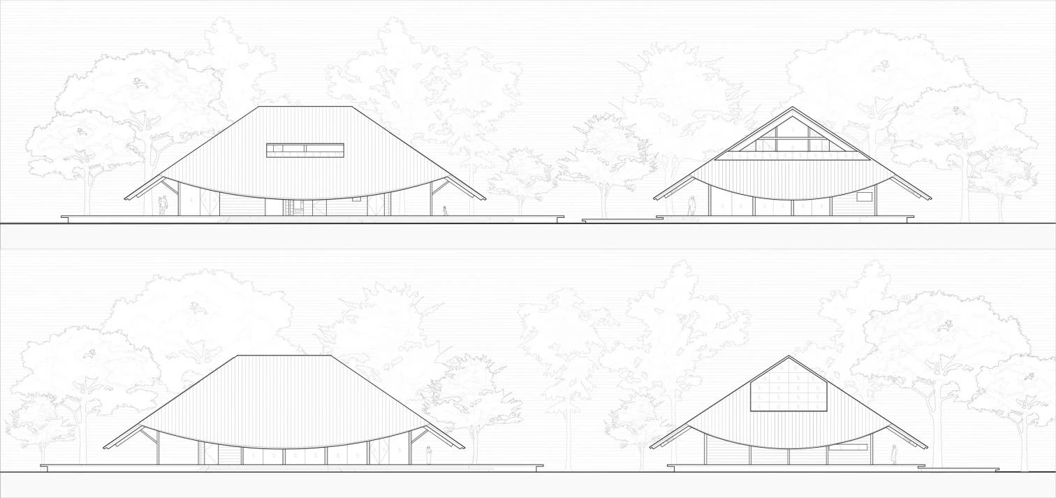 This pavilion rises on the spot of a wooden hut that was didapidated. It had been a much-used local hangout. The reconstruction combines traditional and contemporary design elements. With a structure of wood and steel, the new cabin – all of 400 square meters – has a metal roof, the corners of which curve upward gently to form the entries. The main accessways are on the east and south sides, and there is a secondary entrance on the north, via a ramp. The building rises on tiered platforms that provide seating while preventing flood when it rains hard. The wooden platforms strike up a dialogue with the eaves, echoing the ripples on the lake.
