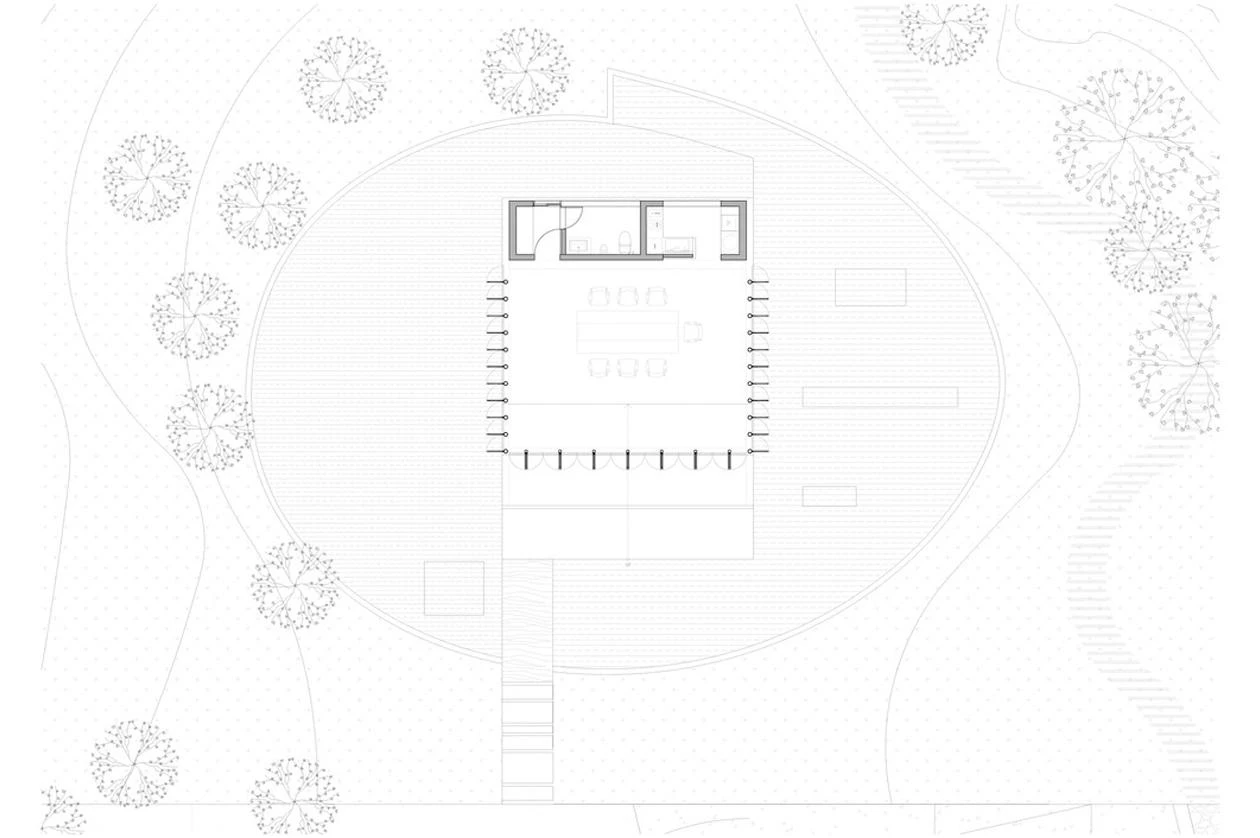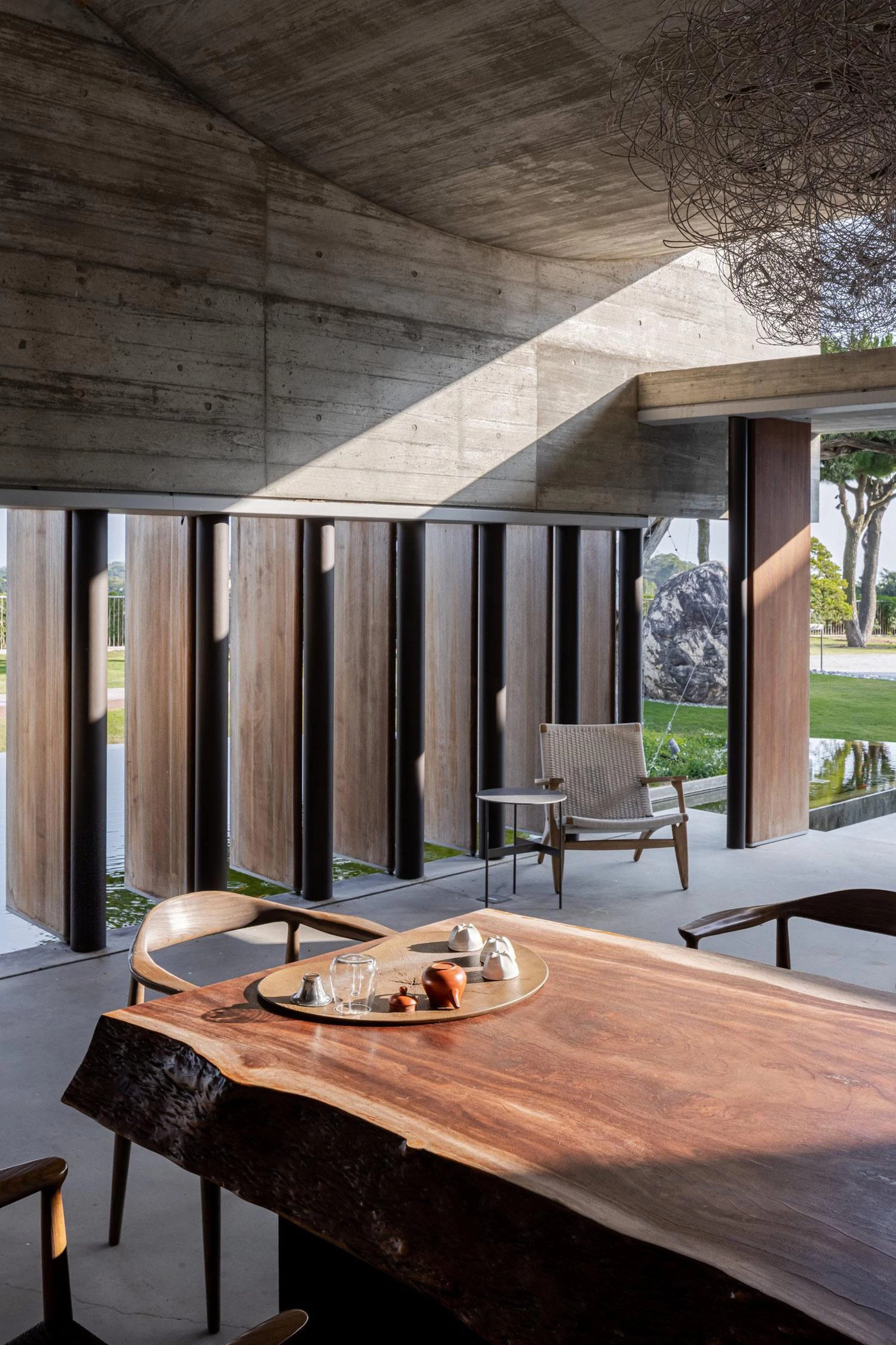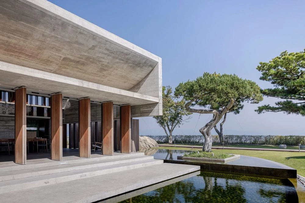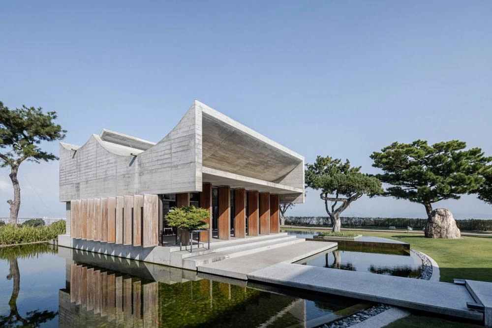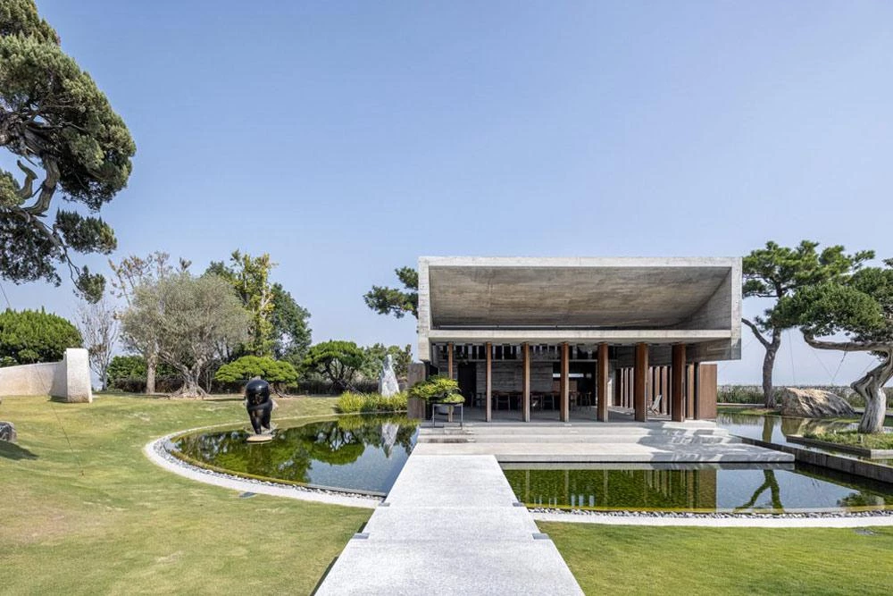 Located high on a hill of the county-administered city of Changhua, this sculptural building of concrete is surrounded by an oval-shaped pond. The project took off from the client’s request for thermal comfort without artificial air conditioning systems. The curving staggered roof facilitates control of airflows inside, as do the pivoting doors of Burmese Teak wood, which also bring in sunlight. The vertical dislocation produced between the roof’s curved plates and the horizontal plate that covers the front platform lets the sun shine on the tea table during the coldest season. The pavilion rises like an island in the middle of the pond, elevated 60 centimeters over the water level on the east side and 30 on the west. The level changes on the pond allow for a natural water flow, increasing the relative humidity in the air that flows into the space when it is hot.