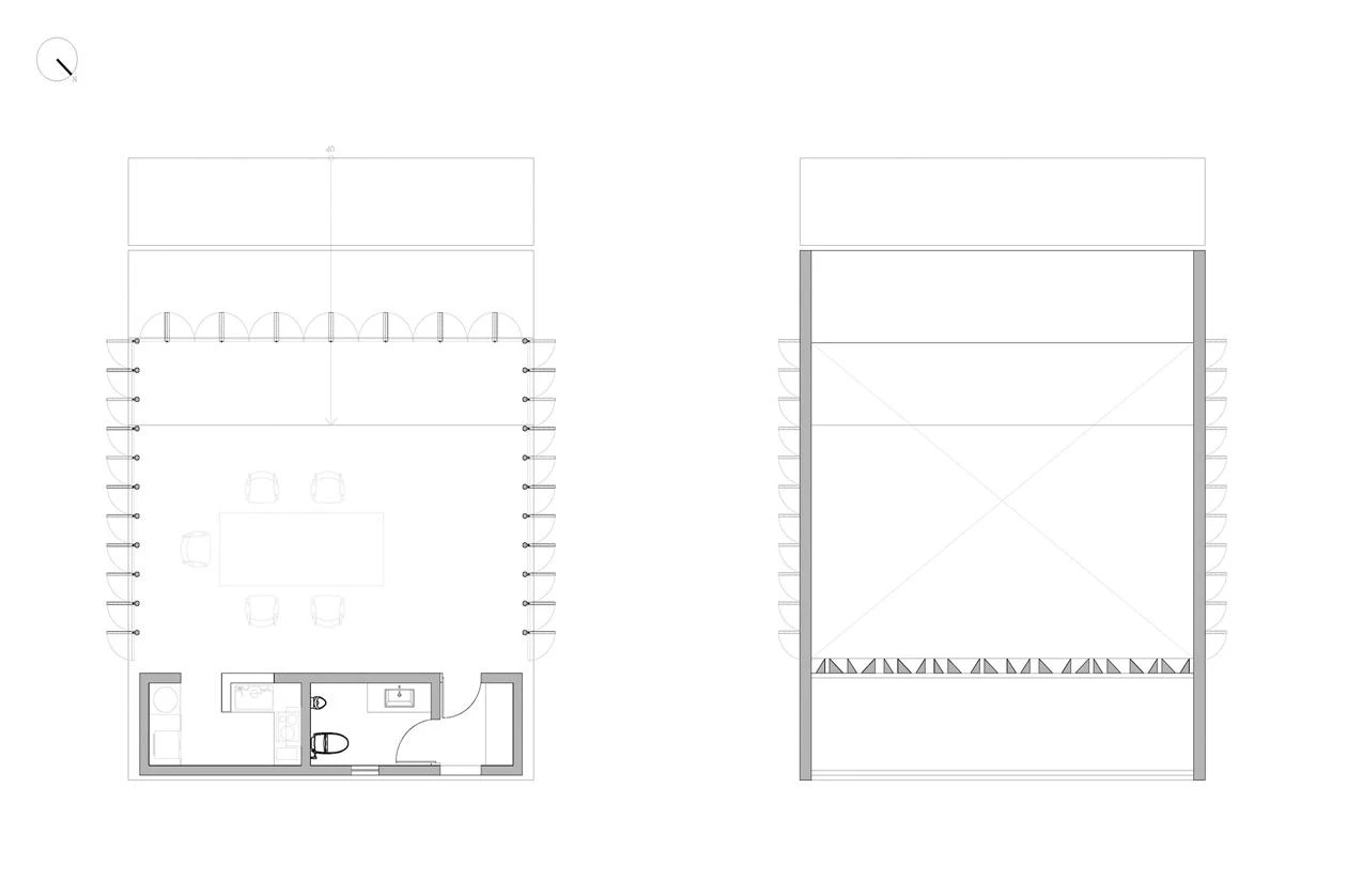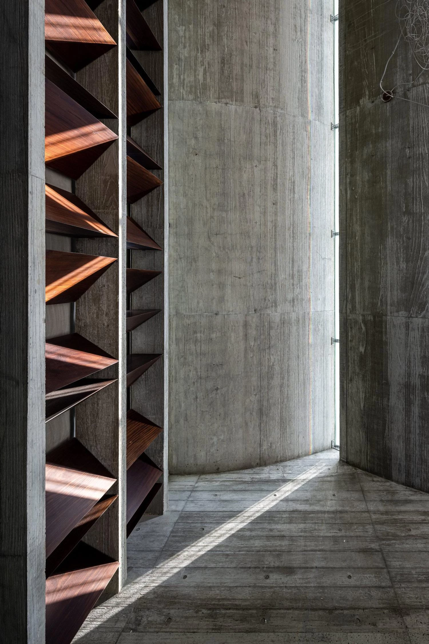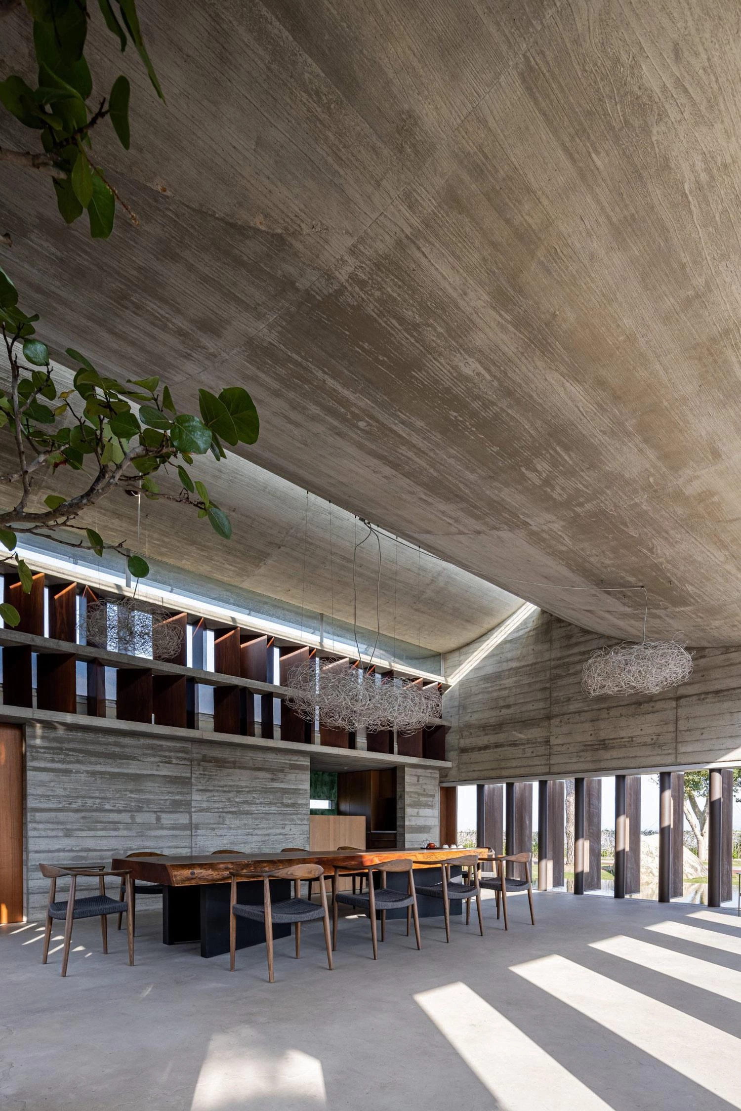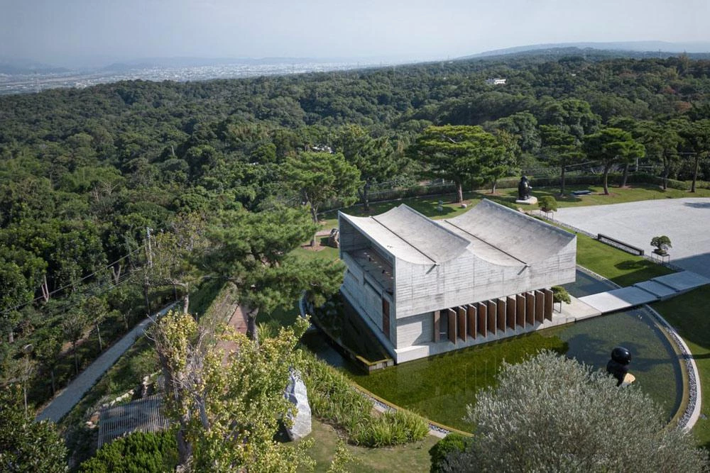 Located high on a hill of the county-administered city of Changhua, this sculptural building of concrete is surrounded by an oval-shaped pond. The project took off from the client’s request for thermal comfort without artificial air conditioning systems. The curving staggered roof facilitates control of airflows inside, as do the pivoting doors of Burmese Teak wood, which also bring in sunlight. The vertical dislocation produced between the roof’s curved plates and the horizontal plate that covers the front platform lets the sun shine on the tea table during the coldest season. The pavilion rises like an island in the middle of the pond, elevated 60 centimeters over the water level on the east side and 30 on the west. The level changes on the pond allow for a natural water flow, increasing the relative humidity in the air that flows into the space when it is hot.