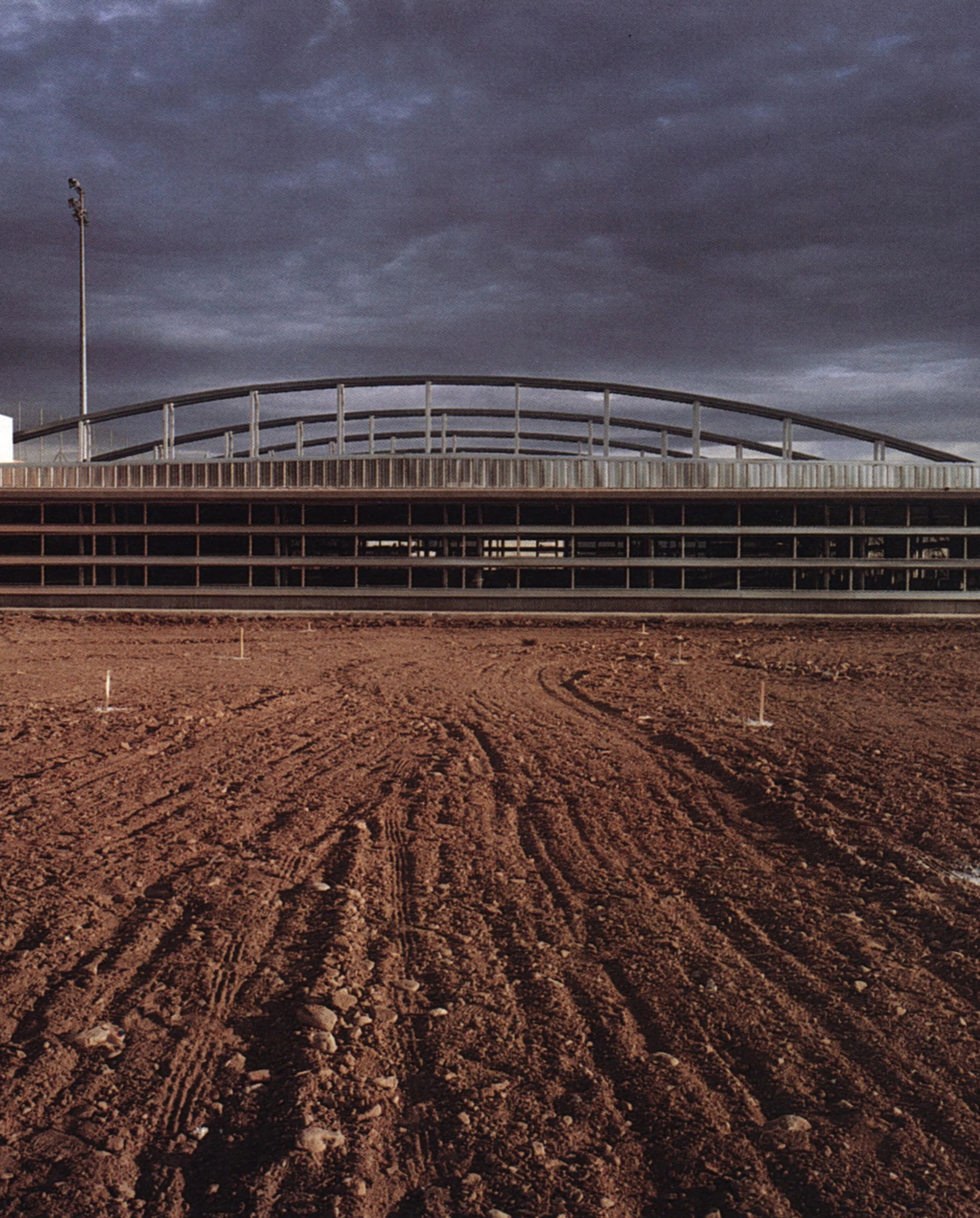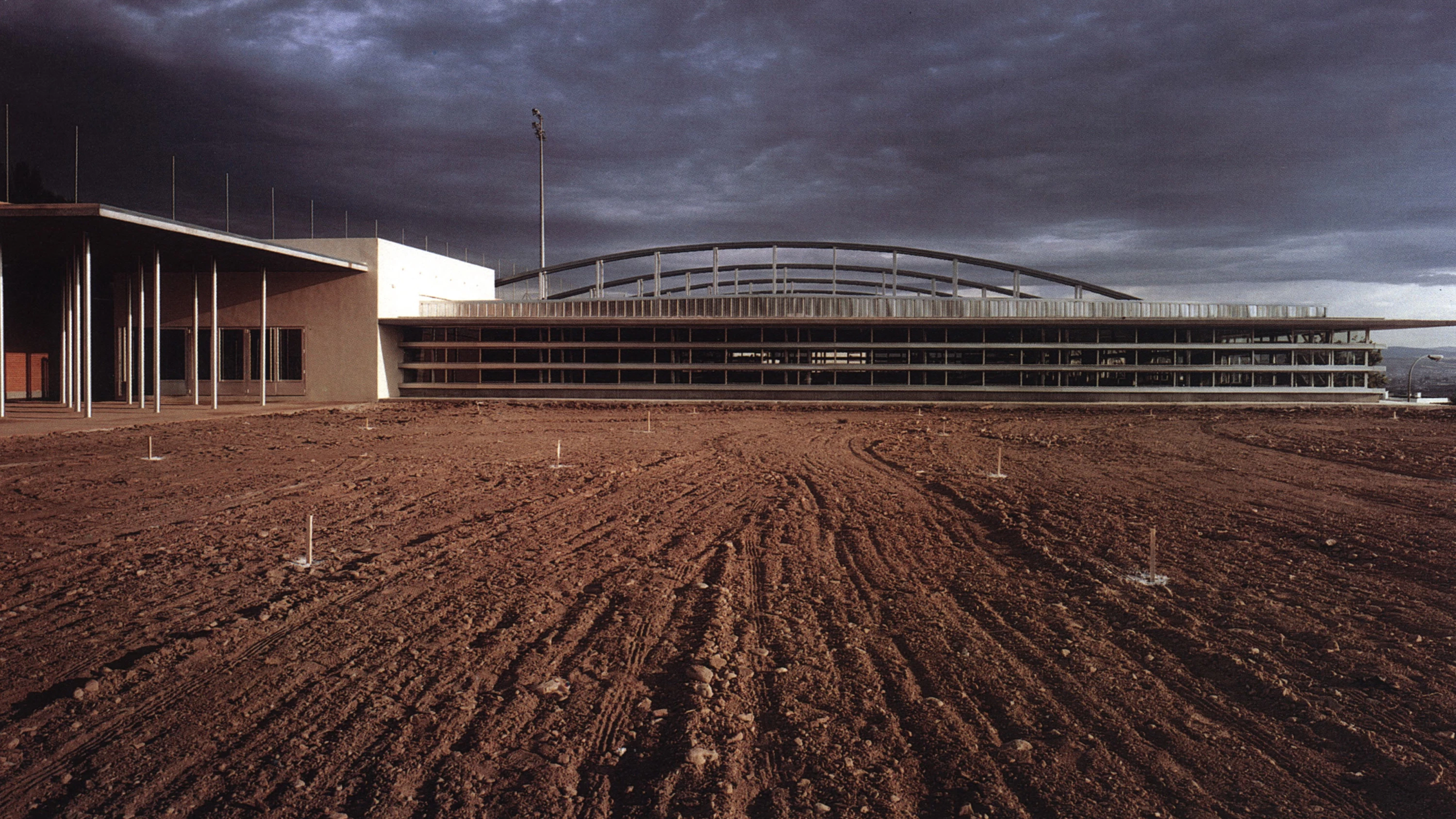 El volumen del pabellón se entierra frente a la Cartuja, se envuelve con el lugar excavando la tierra, de la que sobresale la altura suficiente para que la claridad penetre en el espacio interior a través de la banda transparente que rodea el paralelepípedo. La entrada tiene lugar desde una ‘parata’ modelada como plaza de acceso y mirador de la ciudad. En planta, el edificio se resuelve en dos franjas que acogen, respectivamente, el graderío sobre los vestuarios y la pista deportiva. Esta sencillez se extiende a otros aspectos de su imagen, severa pero con gestos rotundos como el traslado al exterior de los cinco arcos que soportan la fina cubierta plana que cobija la pista deportiva... [+]