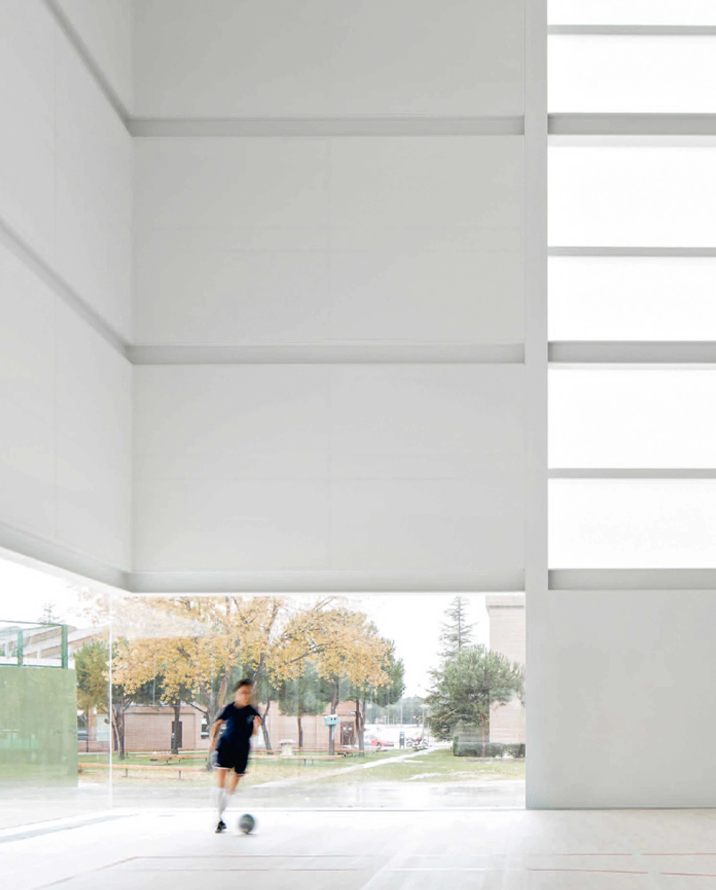 The sports hall is designed as a lightweight piece, with a translucid glass enclosure and light GRC panels, in contrast to the more enclosed pieces of the classroom building and low-rise volume. In the sports hall the facade orientations are assessed and differentiated, so the facades of the south dihedron, more exposed to sunlight, are clad with light prefabricated GRC panels, while those of the north dihedron are wrapped with translucid glass. Along the southwest facade a clear glass band emphasizes the relationship of the building with the central plaza of the campus. This same mechanism of transparency is repeated on the northeast facade onto the upper courtyard. The objective is to establish a visual relationship between the plaza and the sports court, so that the southwest facade of the classroom building becomes the backdrop of the whole complex.