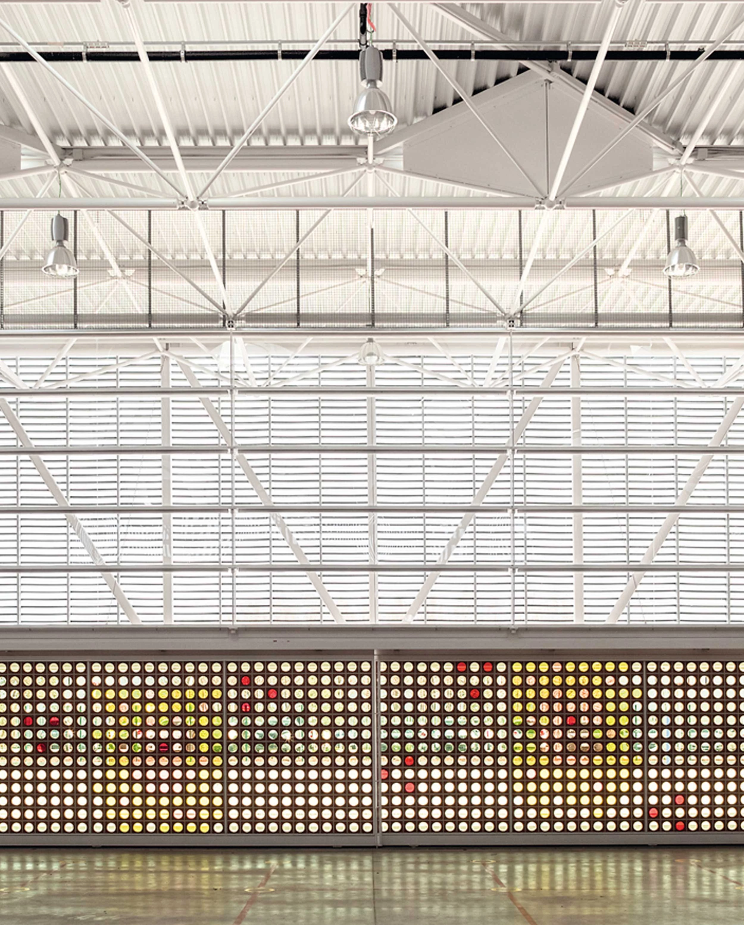 The sliding element built with ceramic pieces addresses the relationship between the interior and the exterior; the abstract pattern of the stained glass of the doors engages in dialogue with the roof’s triangular forms.