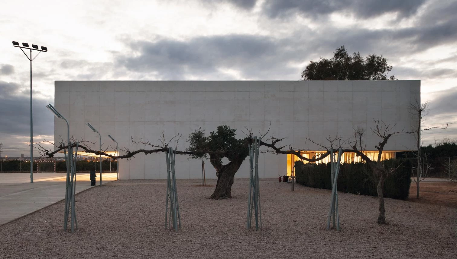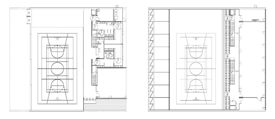 The extension is located in the free area of the plot to the west and, by redesigning the access and the circulations, the project manages to open up a new tree-filled central space between the original building and the new one: a rectangular prism of 33.35 x 29.50 meters, raised with white concrete walls built on site, and where the corners are left void to accommodate the accesses and light fittings of the different spaces: the main entrance to the east, the access to the sports fields to the south, and the dressing rooms and mechanical areas to the north. The west facade, due to climate imperatives, has no windows. The geometry of the roof structure generates a series of triangular skylights that favor cross ventilation inside the building.