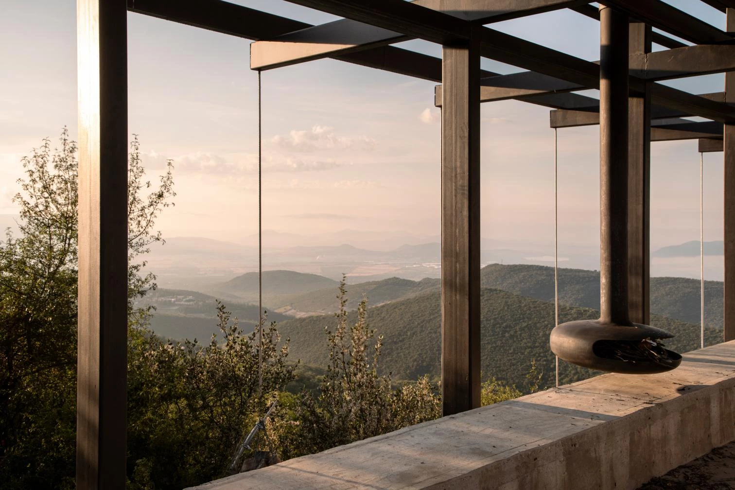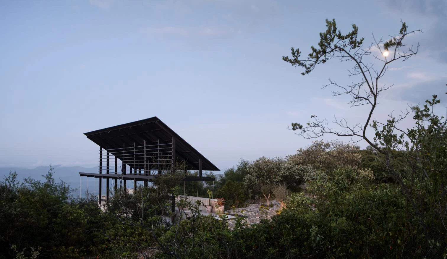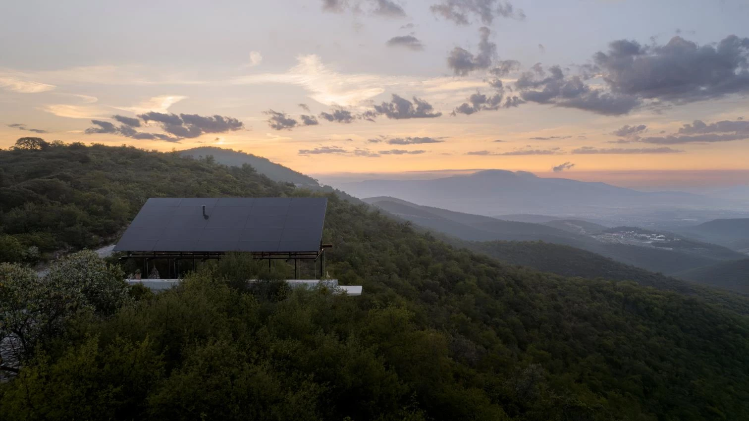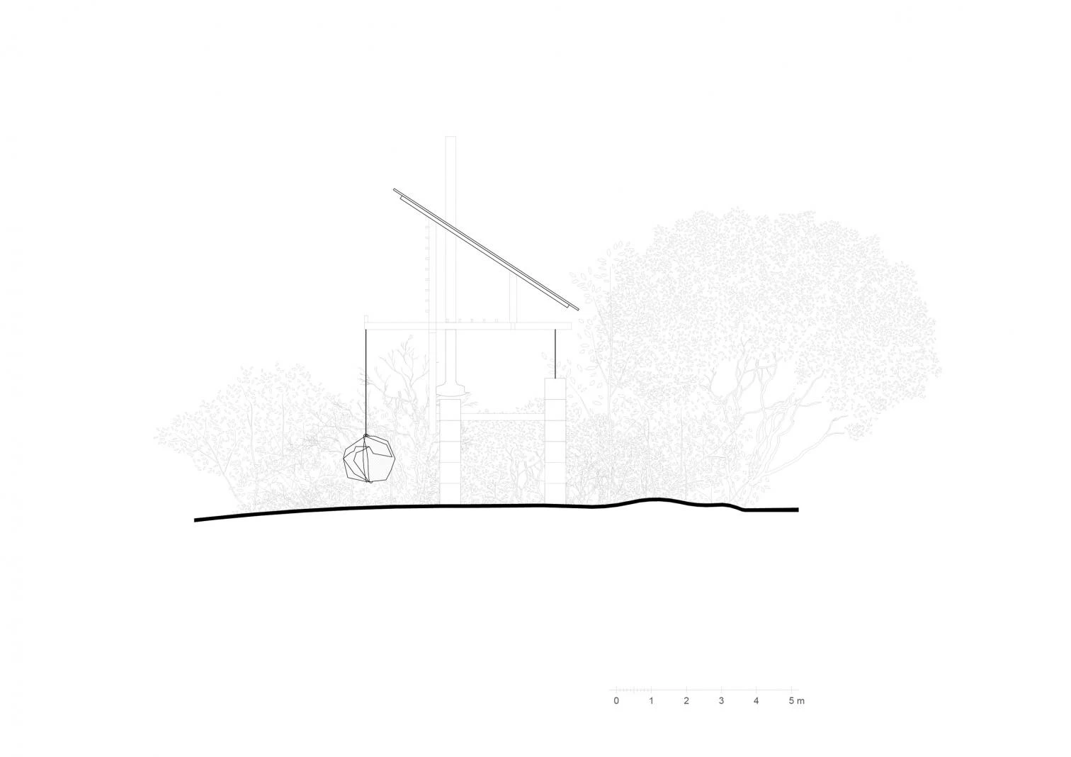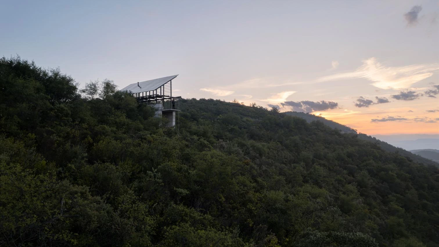 This 21-square-meter construction without an indeterminate program rises on an uneven landscape, providing shade and views of the horizon. It has a concrete base, a lightweight pitched roof, and a metal framework that acts as a spinal column, delimiting the zone of the lookout area, with supports on only one side. To free up the west facade, the other side of the structure is subjected to counterweights by means of gabion masses made of stone taken from the foundation, anchored by tensioning cords. Access to the place is limited, so the concrete is poured on the site and modular steel elements that are easy to assemble are used.