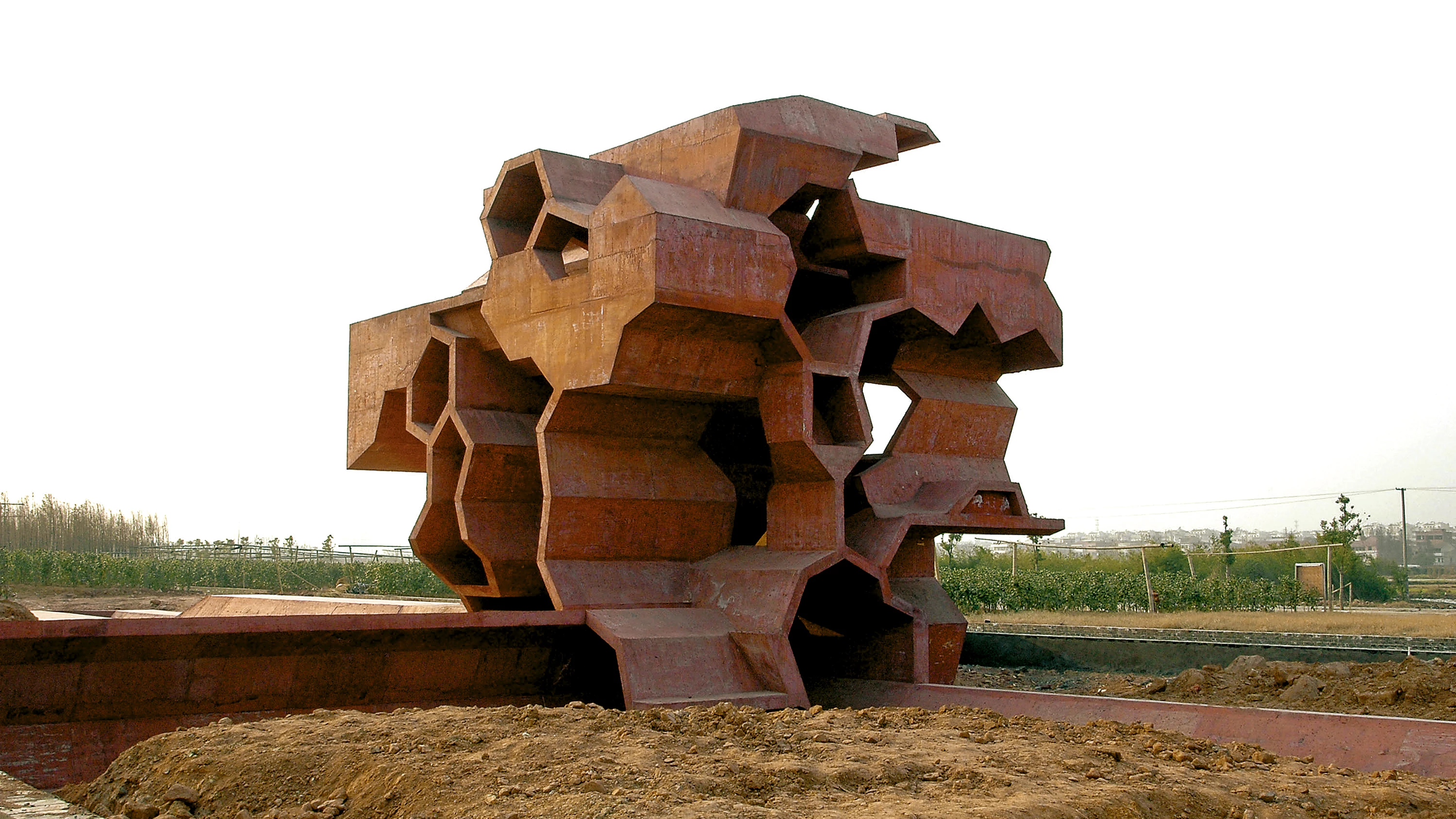A park comprising pavilions of widely differing forms, sizes, and functions is now under construction in Jinhua. The theme of each pavilion was chosen by the Chinese artist Ai Weiwei. The architectural concepts developed for the new city center of the Jindong District of Jinhua provided the guidelines. Everything appeared quite logical and simple: the pavilion would be a shell consisting of the same geometric pattern already designed.
