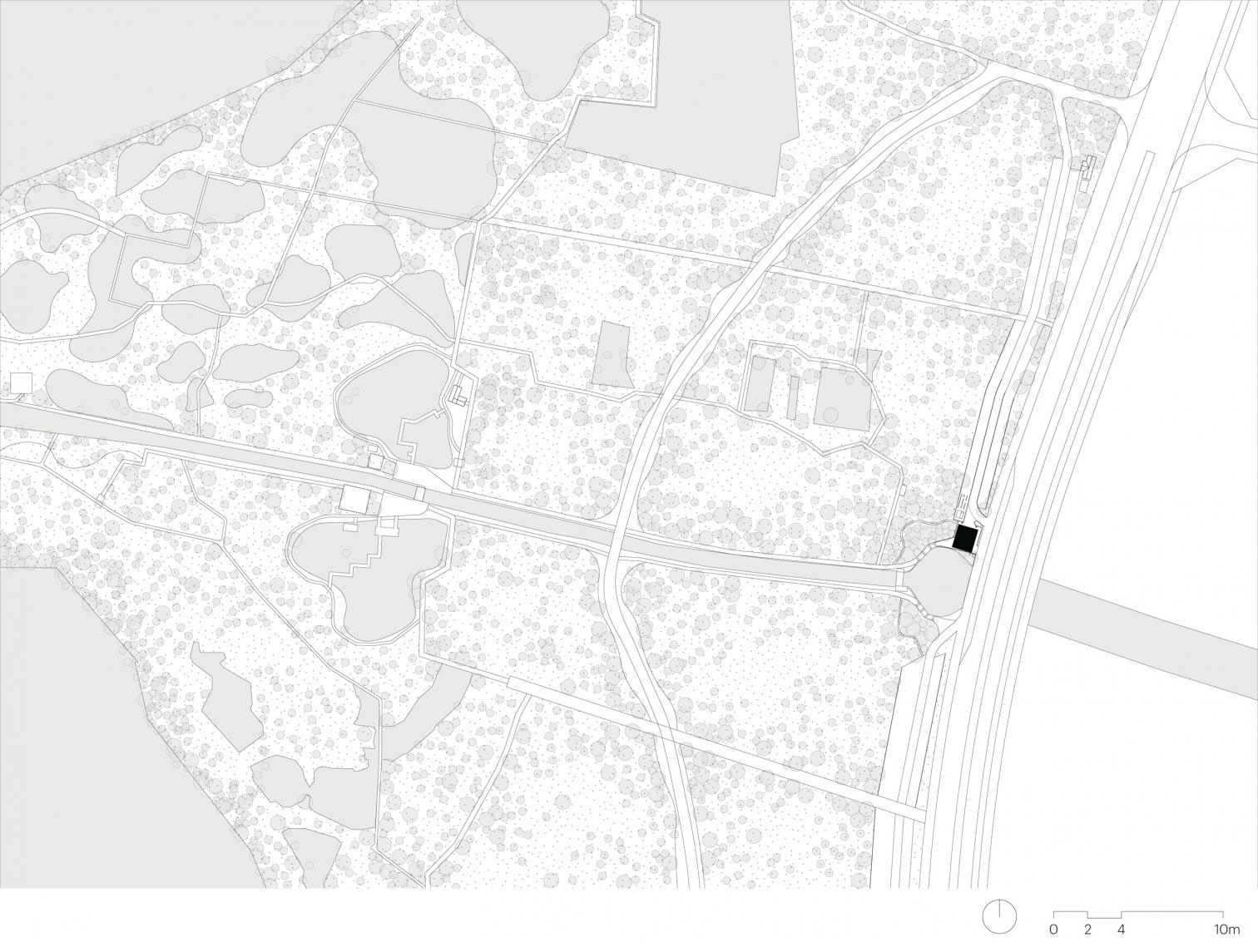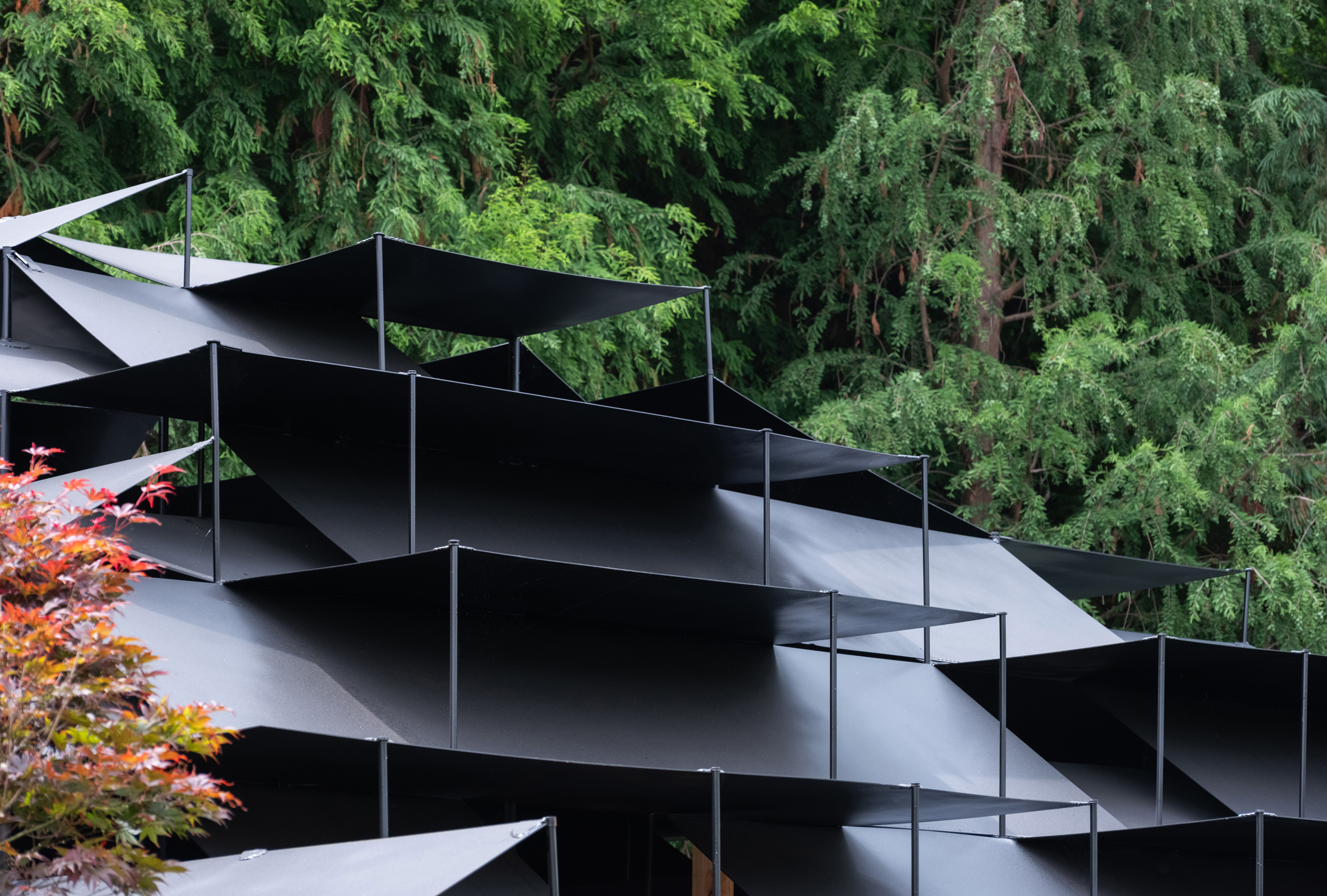With a surface area of 171 m², the building has a steel structure composed of slender columns – 40 mm in diameter – and a stepped roof. The roof lets light in, fragmented, and gives partial views of the sky and the treetops around. From a distance, its silhouette is reminiscent of the hipped roofs of traditional Chinese architecture, diluting the industrial look of steel while establishing a dialogue with the cultural and landscape context.