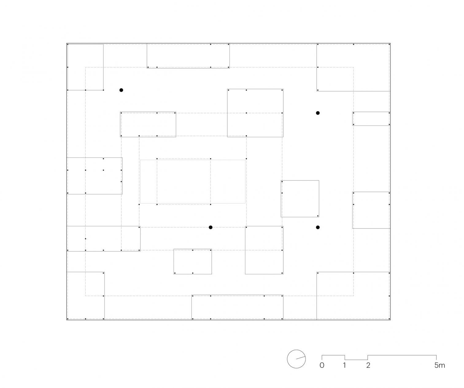 The pavilion is made up of repeated modules that combine six columns and flat or sloped steel plates. This configuration creates a variable spatial rhythm and different densities, achieved by overlapping elements. Loads are transmitted to the upper levels through smaller supports that hold up the roof layers.