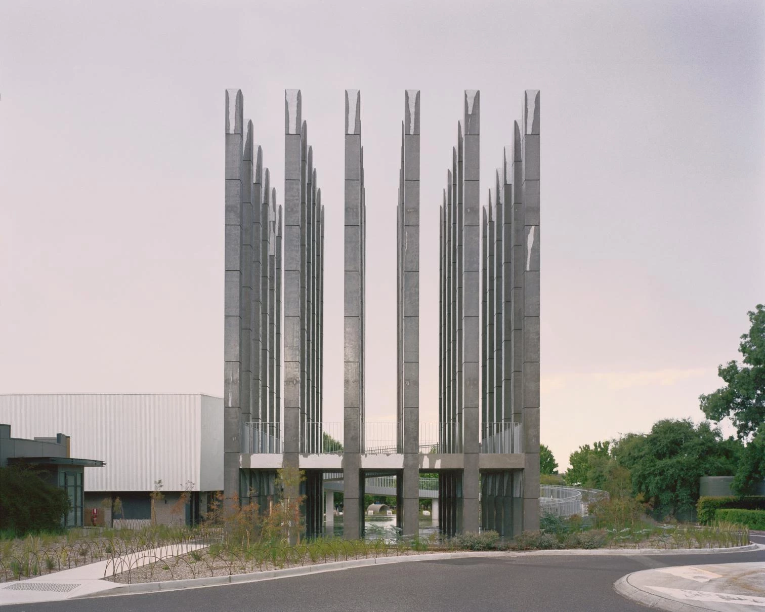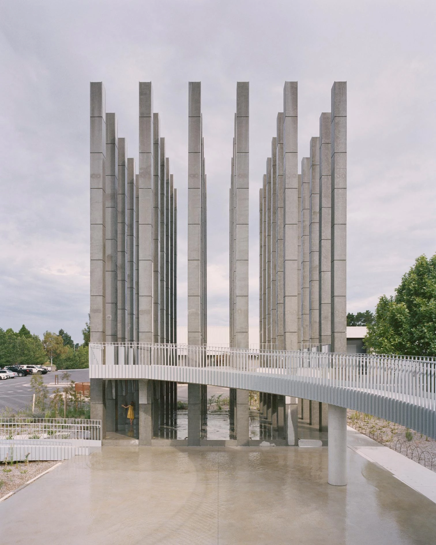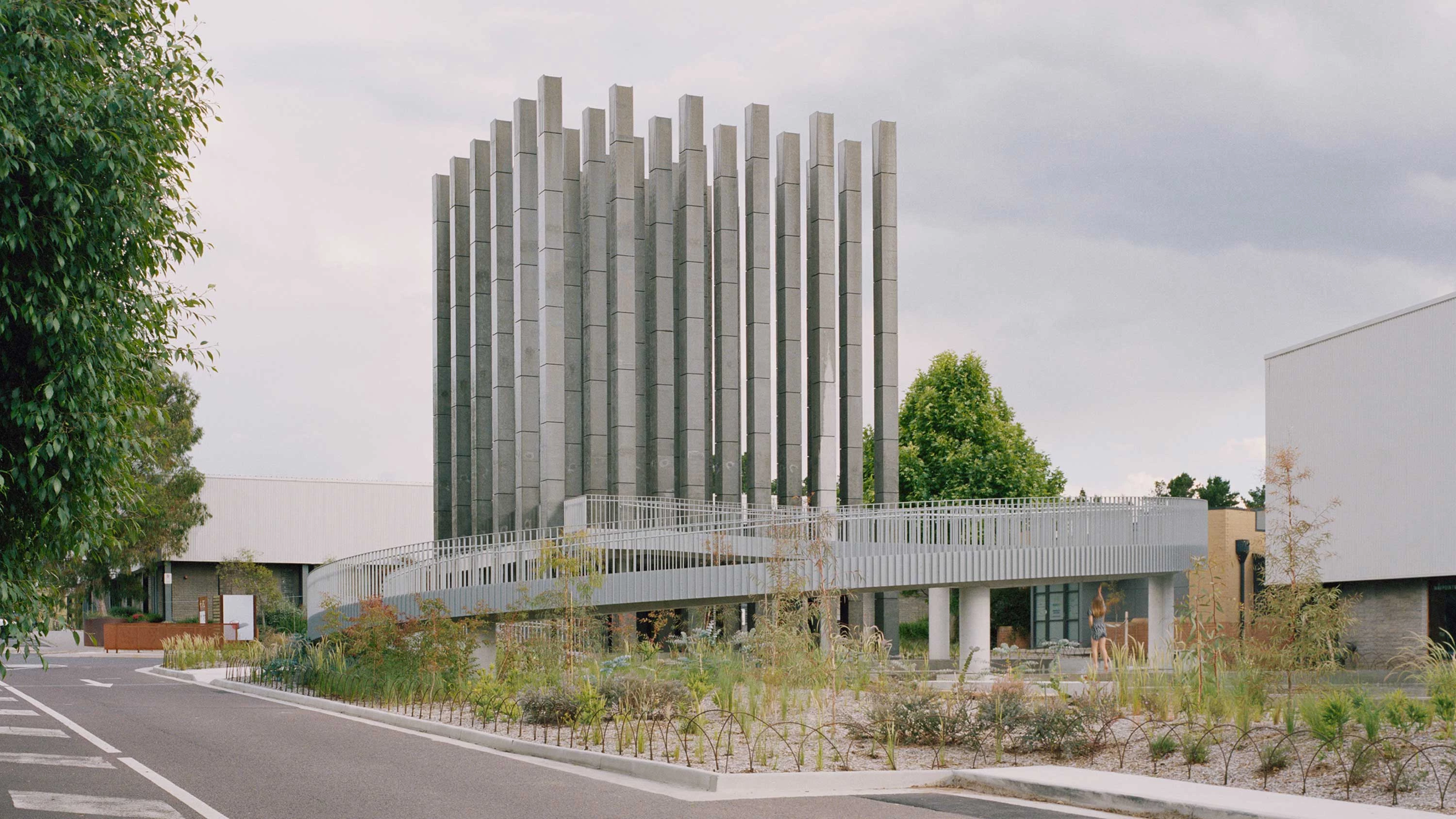 The Chilean firm headed by Mauricio Pezo and Sofia von Ellrichshausen built this stucture composed of 36 concrete columns and a circular ramp leading to a viewing deck. Named Less, the pavilion has a square plan and the columns are identical, arranged in a regular 6x6 grid. Pumped water spills down its outer sides to the base. Commissioned by the real estate developer Molonglo, this large installation invites the visitor to occupy and interact with its different spaces, which arouse sensations of stillness and movement at the same time. 6,000 specimens of 50 plant species grow around.