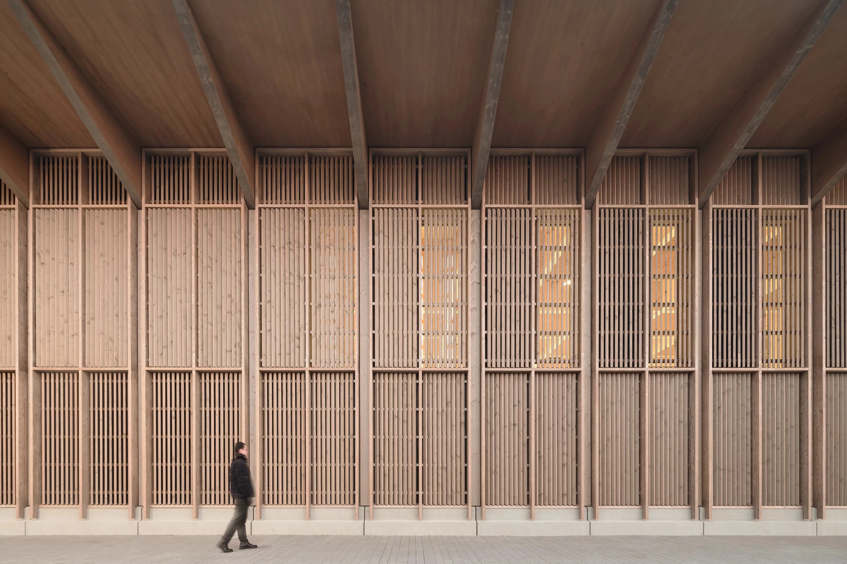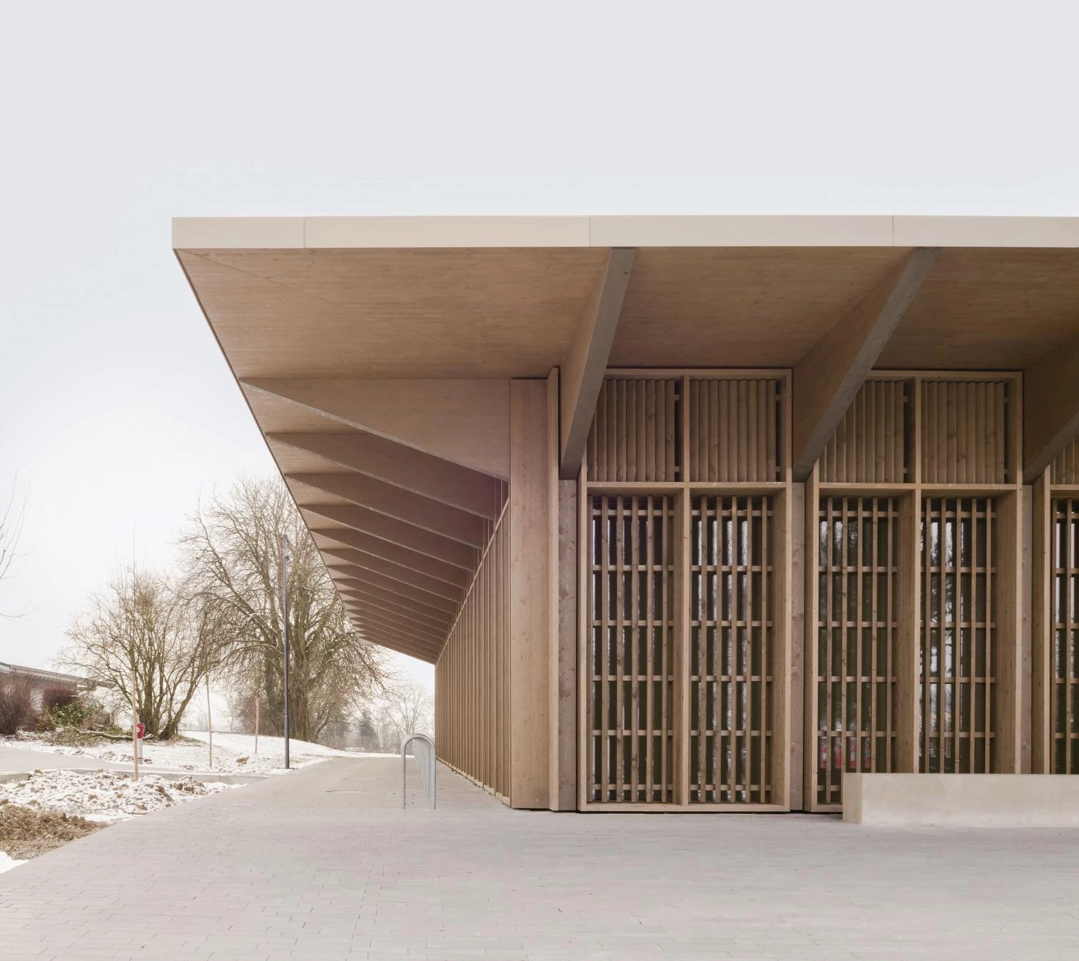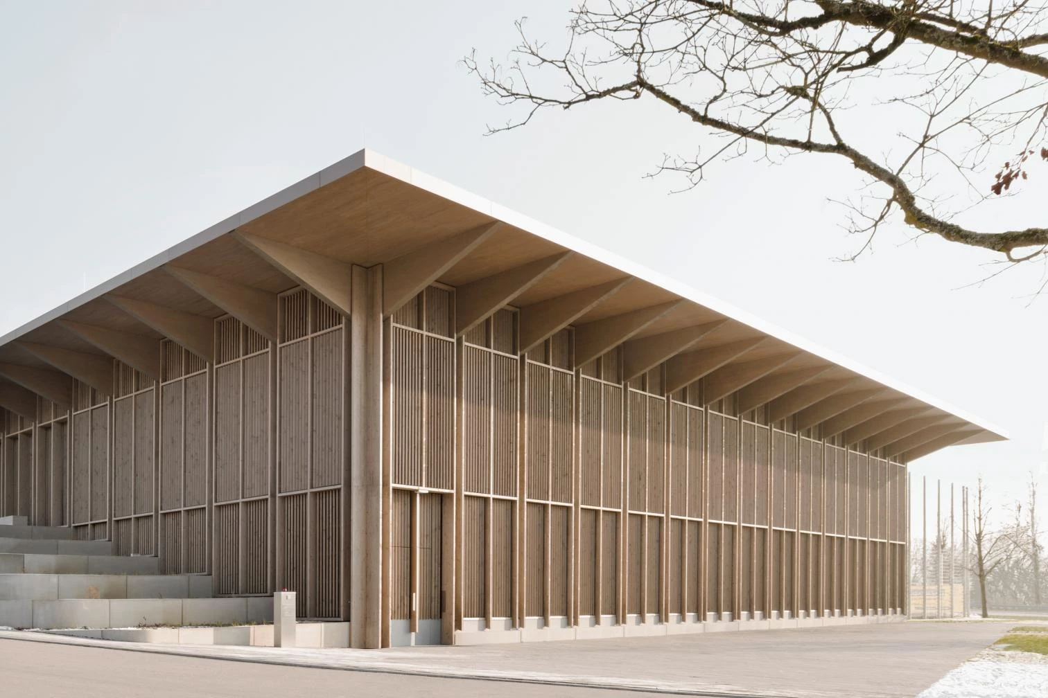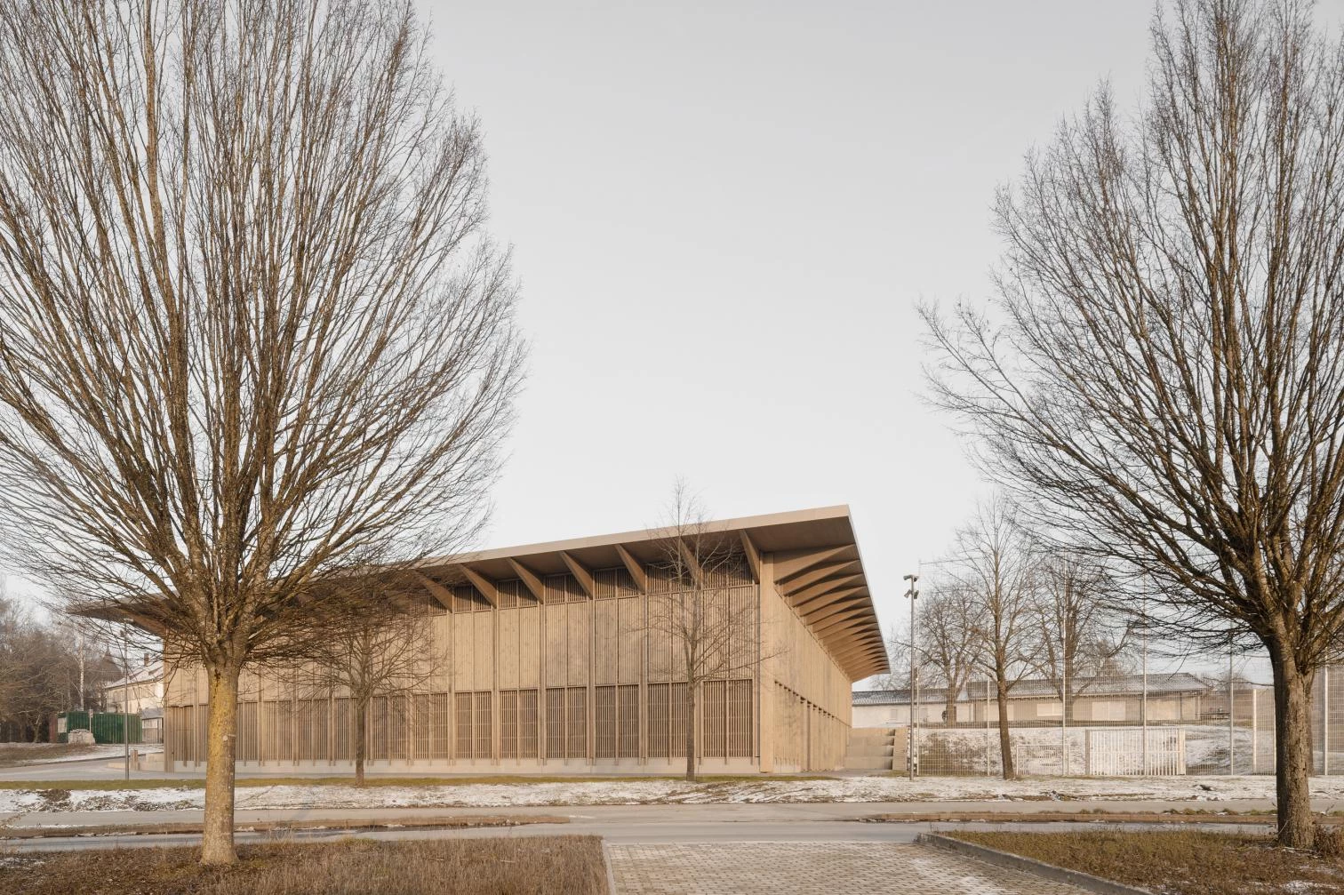 On the north shoe of Lake Constance – in Markelfingen, a district town of Radolfzell am Bodensee – stands this timber construction that is a hub of community life, providing sport facilities and event spaces. The project’s central defining feature both inside and out is its material makeup. The facade of vertical wooden slats gives the building a uniform look on all four sides, accentuated by a roof with a large overhang in all directions.