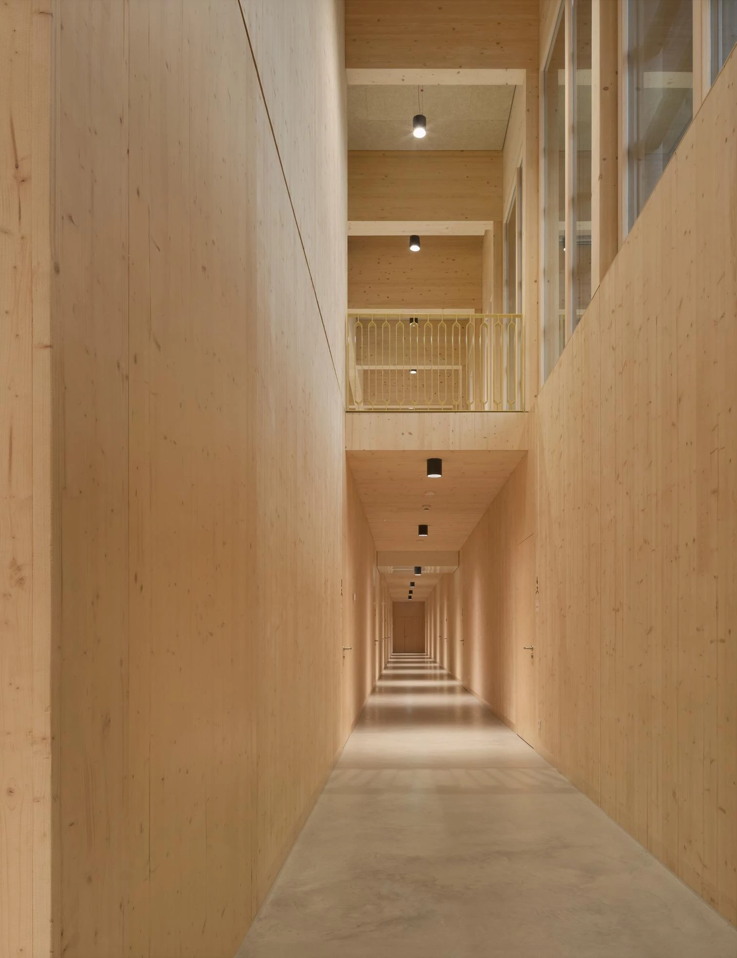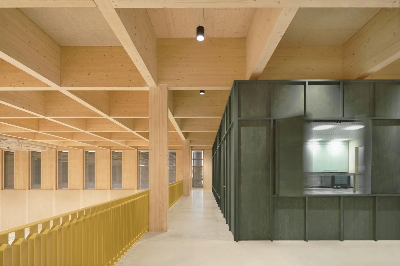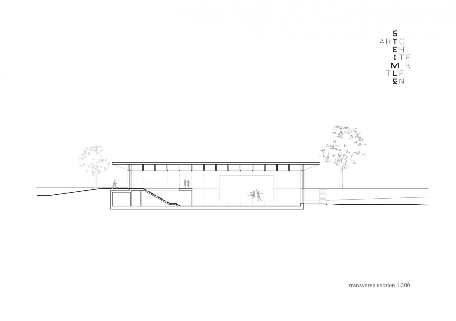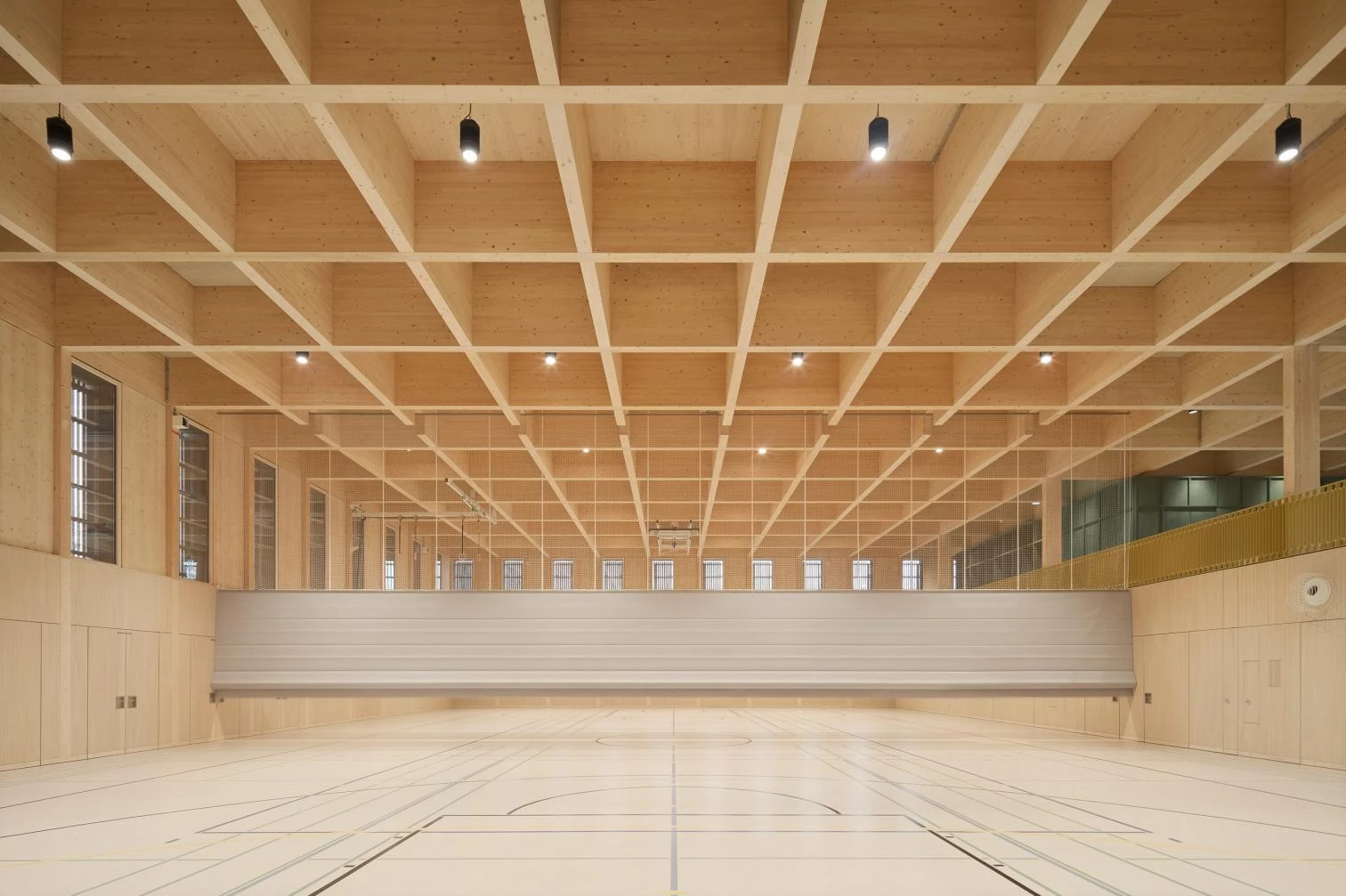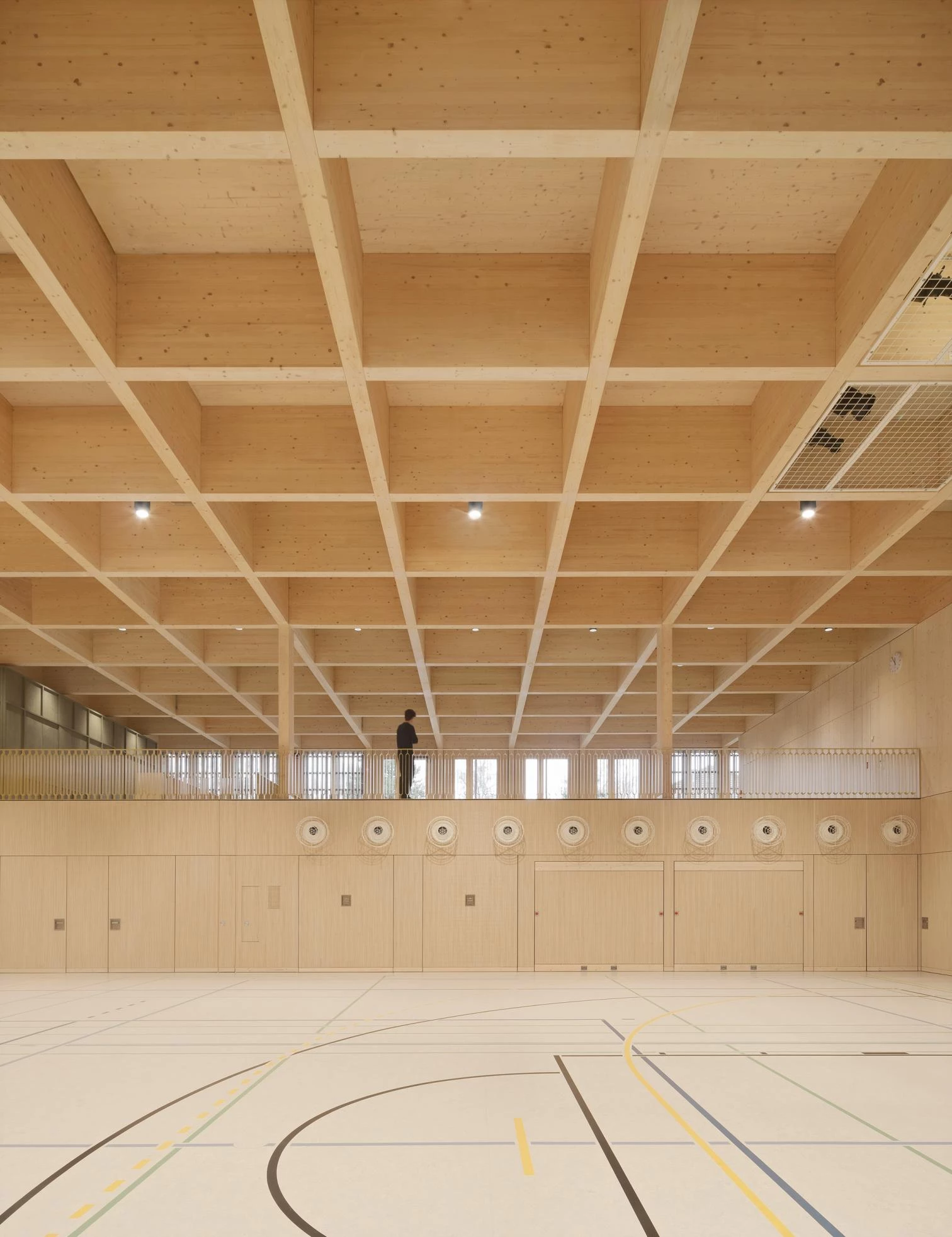 Taking advantage of the site’s slope, a staircase designed like a grandstand rises on the north. With an imposing coffered ceiling, the public part of the foyer and the playing field are separated from the non-public zone by a continuous wall, behind which several ancillary rooms are concealed. A stage embedded on the east side can be closed with mobile partitions to form an independent space.