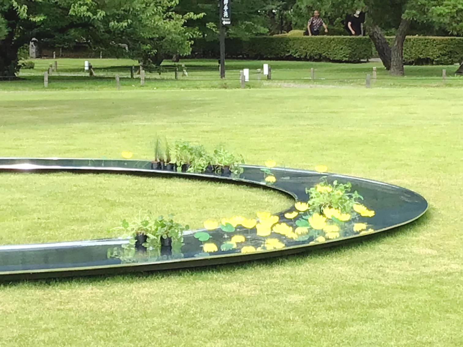 The location within the Hamarikyu Gardens – an estate owned by the imperial family for three centuries which was bequeathed to City Hall in the wake of World War II – is no coincidence. The mirrored ribbon winds its way on the exact spot where the first guesthouse for foreign dignitaries stood, thus embodying the hospitality of the people of Tokyo. On it flows a torrent of water that bathes small flower pots and evokes kyokusui no utage, a refined form of courtly entertainment that involved composing poems on the banks of a stream in the time it took for a small cup of sake floating on the current to complete the meandering course.