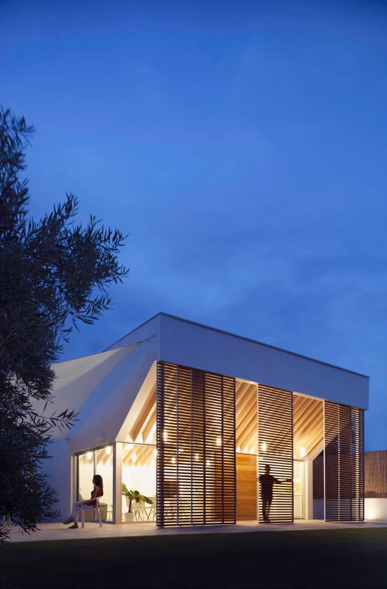 The local firm headed by Pablo Muñoz Payá renovated this single-family home in Petrer, a municipality located in the interior of Alicante province. The regulations did not allow enlarging the existing surface area of the one-level house – 138 square meters, 119 corresponding to living space and 19 to an exterior canopy – so the project kept within the rectangular perimeter while restructuring the residence in three longitudinal and three transversal bands. In making the bathrooms and kitchen furnishings central exempt rooms, the rest of the daytime area is formed, with the living room, dining room, and kitchen, opening on to the porch protected by mobile sun panels. The middle band contains baths and two bedrooms, and the last segment the master bedroom, a bathroom, and a study. The palette of colors and materials used inside is reduced to white and wood, unifying the house. There are two types of roofs: a gabled roof over the porch zone, and a sawtooth one over the bedrooms, optimizing the entry of light and the temperature of the rooms.