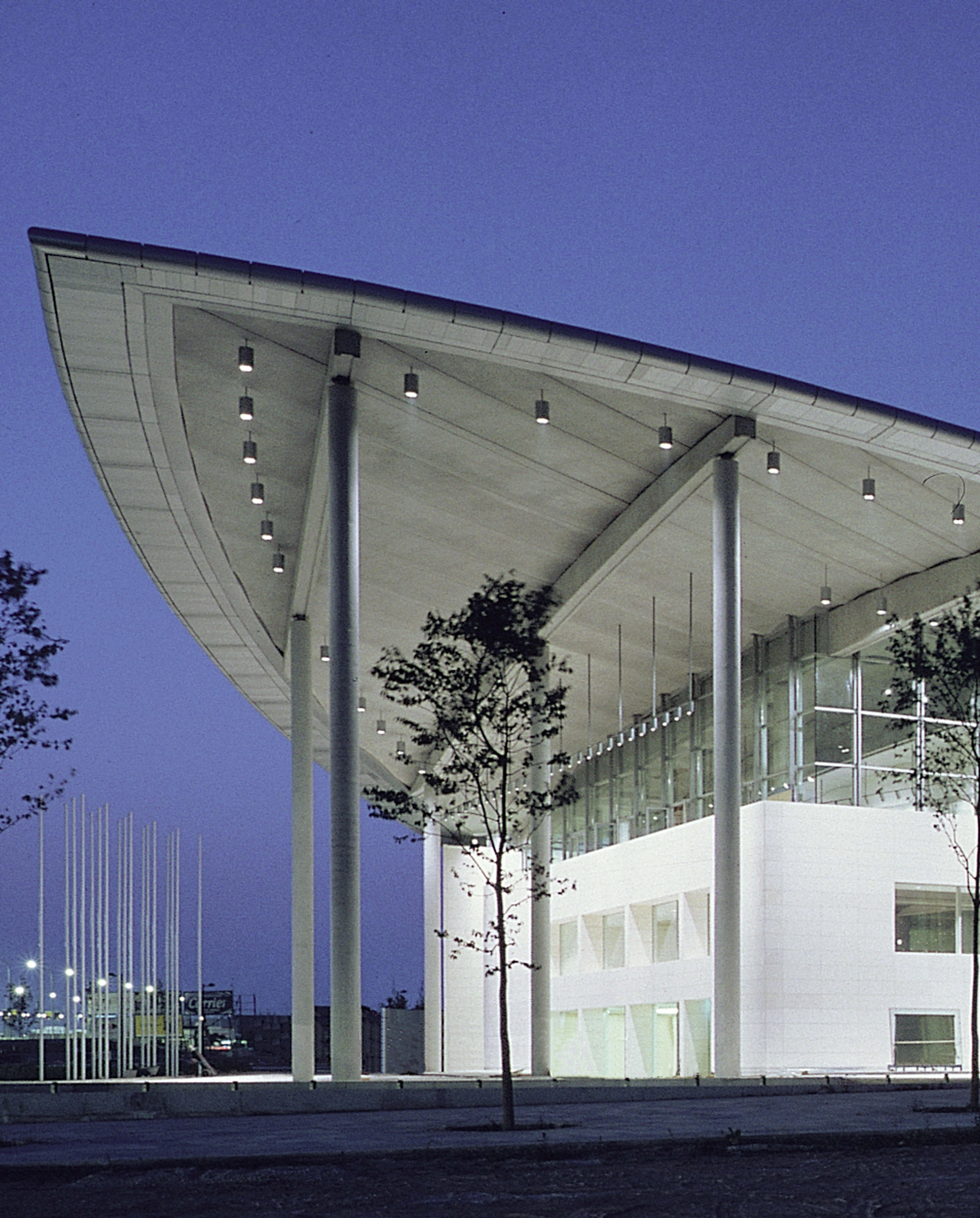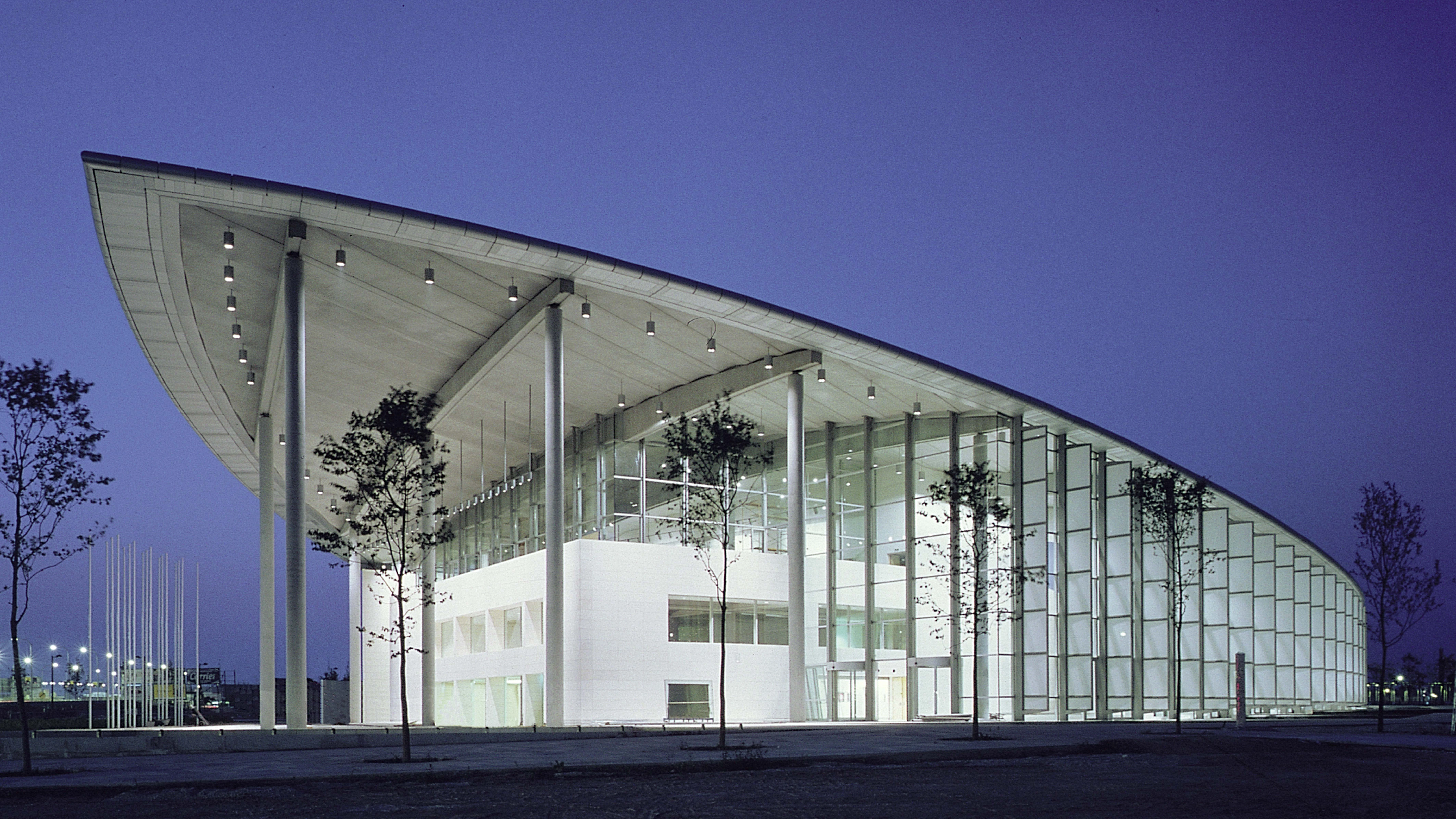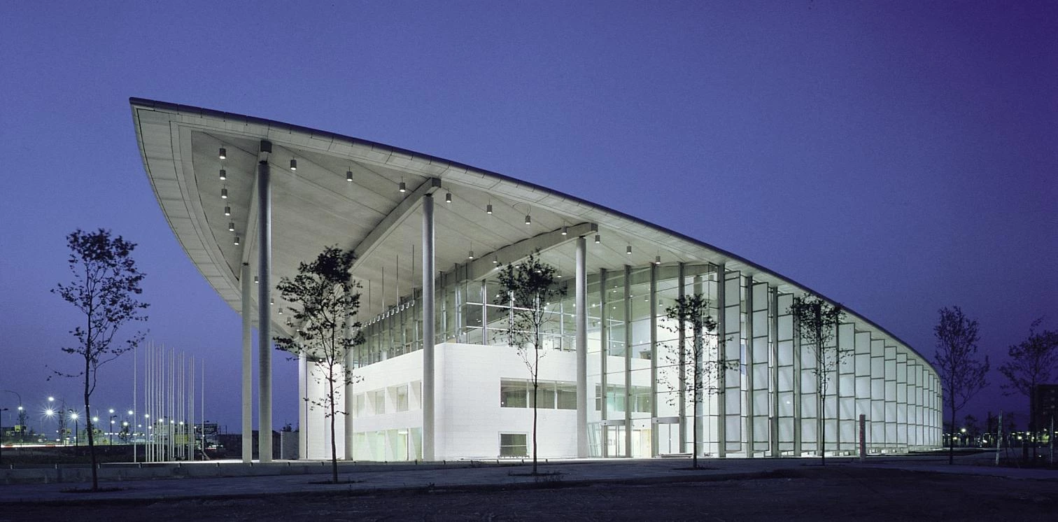 The project consists of two curved planes that intersect to generate a floor plan of optical references. The west wall, built in concrete and with a more closed curvature, contains the service areas, which succeed one another like the blades of a fan. To the north, this wall breaks up to create a passageway for the loading and unloading of industrial vehicles. The three auditoriums – which can seat 1,462, 468 and 250, respectively – are arranged in a longitudinal eastwest direction. The rest of the brief is housed in the spaces between them: nine seminar rooms, offices, press rooms, exhibition zones, lavatories, etc. The cafeteria is a white parallelepiped that protrudes from the glass plane of the far south end, beside the main entrance.