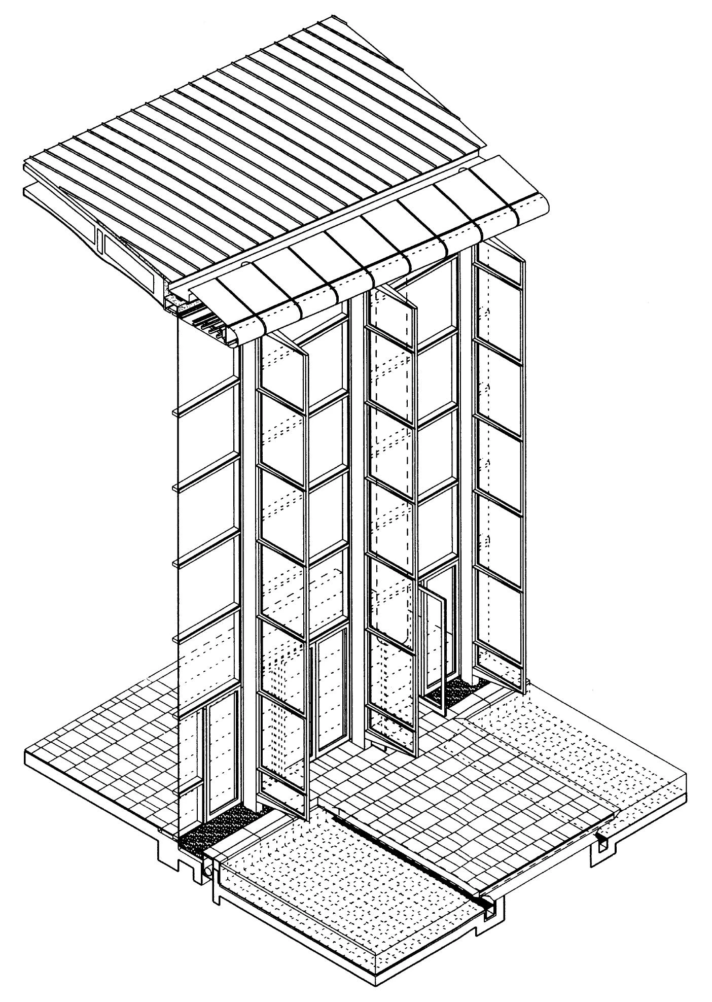 The western facade is a curtain wall that is slightly set back from the line of the roof ’s edge, and is responsible for the center’s open visual relationship with the exterior. All along behind it, and rising the entire height of the building, is the foyer-ambulatory. From here one proceeds to the auditoriums. Brise-soleils of translucent glass shield the huge glazed facade from oversunning and give a nuance to the intense Mediterranean light. The descending height of the roof and the use of horizontal modules for the frames of the facade’s parasols serve to emphasize the fore shortened perspective view of one approaching the building. The pools at the foot of the west facade have a cooling effect on the foyer when the wind blows over it, send reflections of the sun into the interior, and allow a reflected image of the building from the outside.