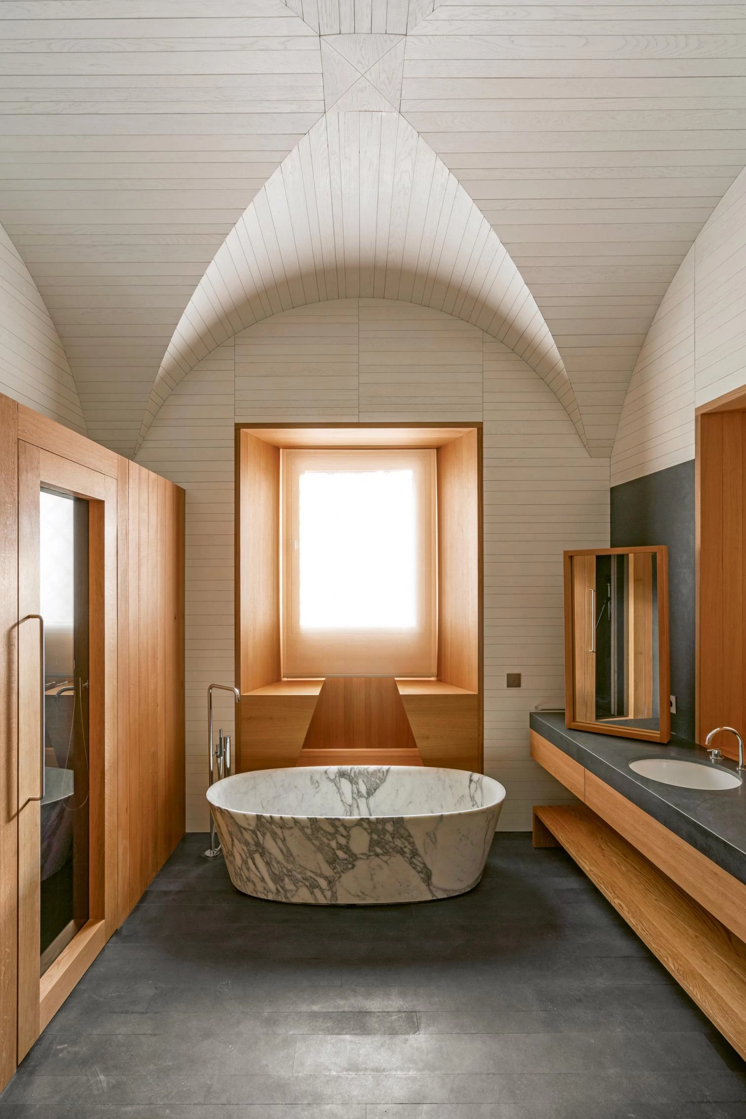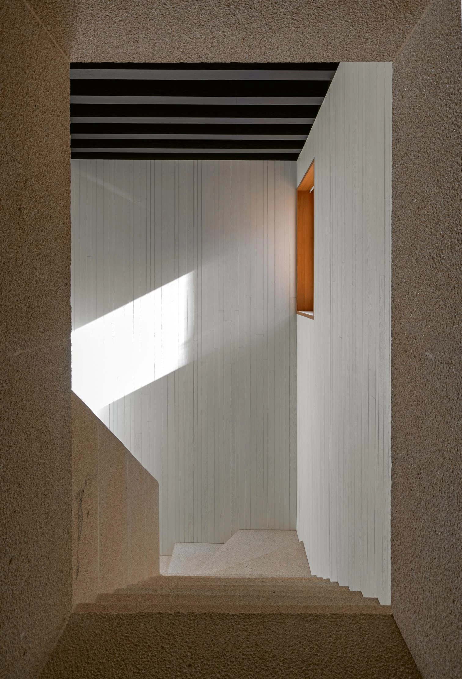 The intervention is based on the respect for the original structure of the historic building, with the incorporation of a contemporary architecture that, as if it were un undergarment, gradually lines the existing surfaces with timber vaults on the ground level, and coffered ceilings, also made of wood, on the two upper floors.