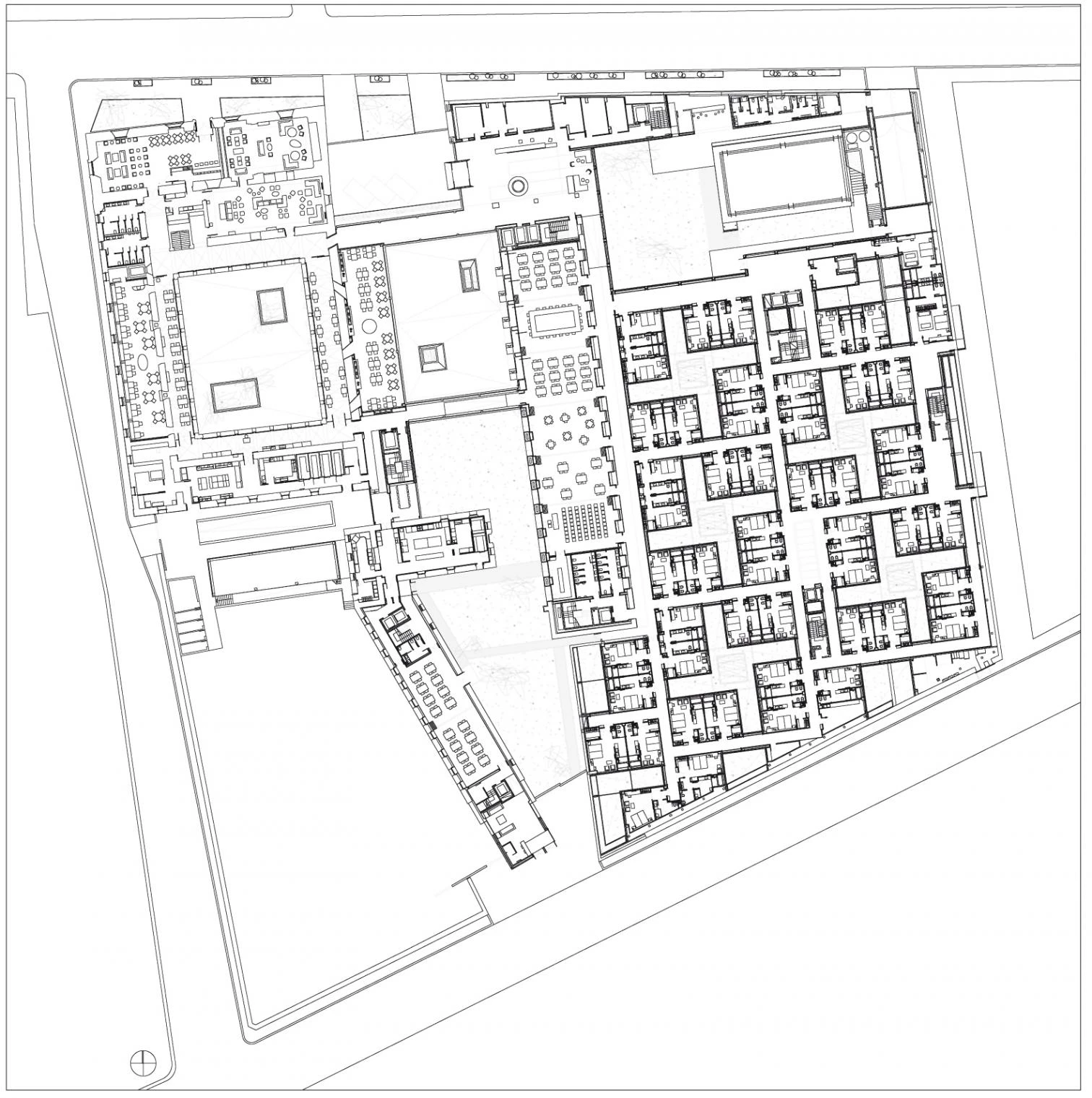 The arrangement of the hotel rooms is inspired by the layout of the old school of Santo Tomás, organized around patios and wrapped by the wall that delimited the garden of the convent, isolating it from the city activity.