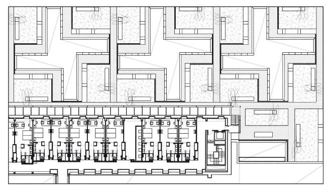 The project wishes to revitalize the cloister building and recover the landscaped space. To achieve this, the new hotel has been built under an extensive garden, perforating and carving several courtyards that generate an interesting variety of open areas between the rooms. These are concealed under the old orchard, so the height of the original wall has been maintained, respecting the historical context and the adjacent buildings.