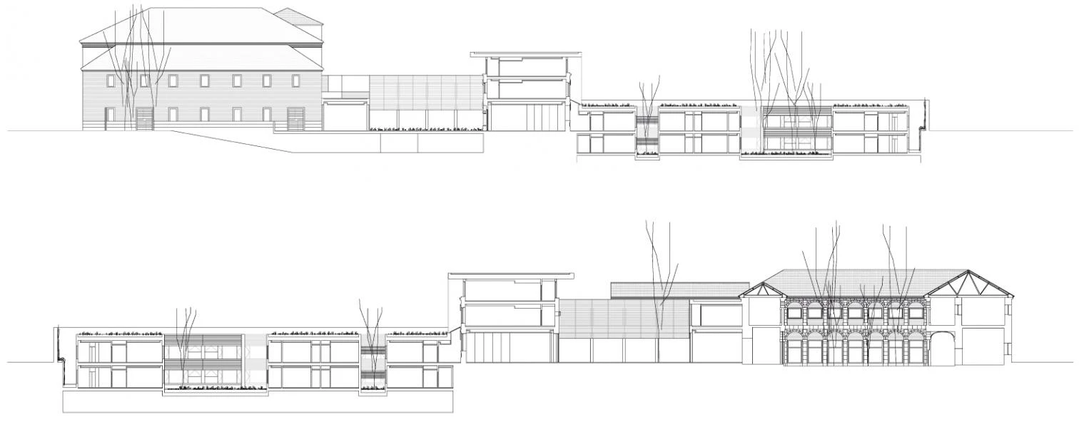 Furthermore, the need to devote a large amount of surface of the program to the lounges and dining rooms has encouraged to duplicate the current cloister with an analogue adjacent one. This new space has a series of metallic fronts made out of steel latticeworks that act as filters to the exterior. By this means the space generates a sequence of three large ambits with two intermediate cloisters that can be used during specific times of the year as an extension of the mentioned spaces.?The rear facade has a new neutral enclosure, using latticeworks housed in the inner side of the rooms to nuance the passage of natural light, generate an intimate atmosphere and, at the same time, offer views of the garden.