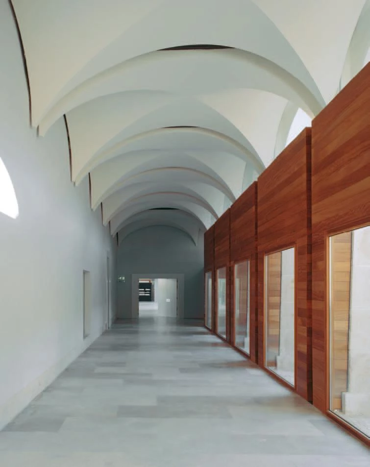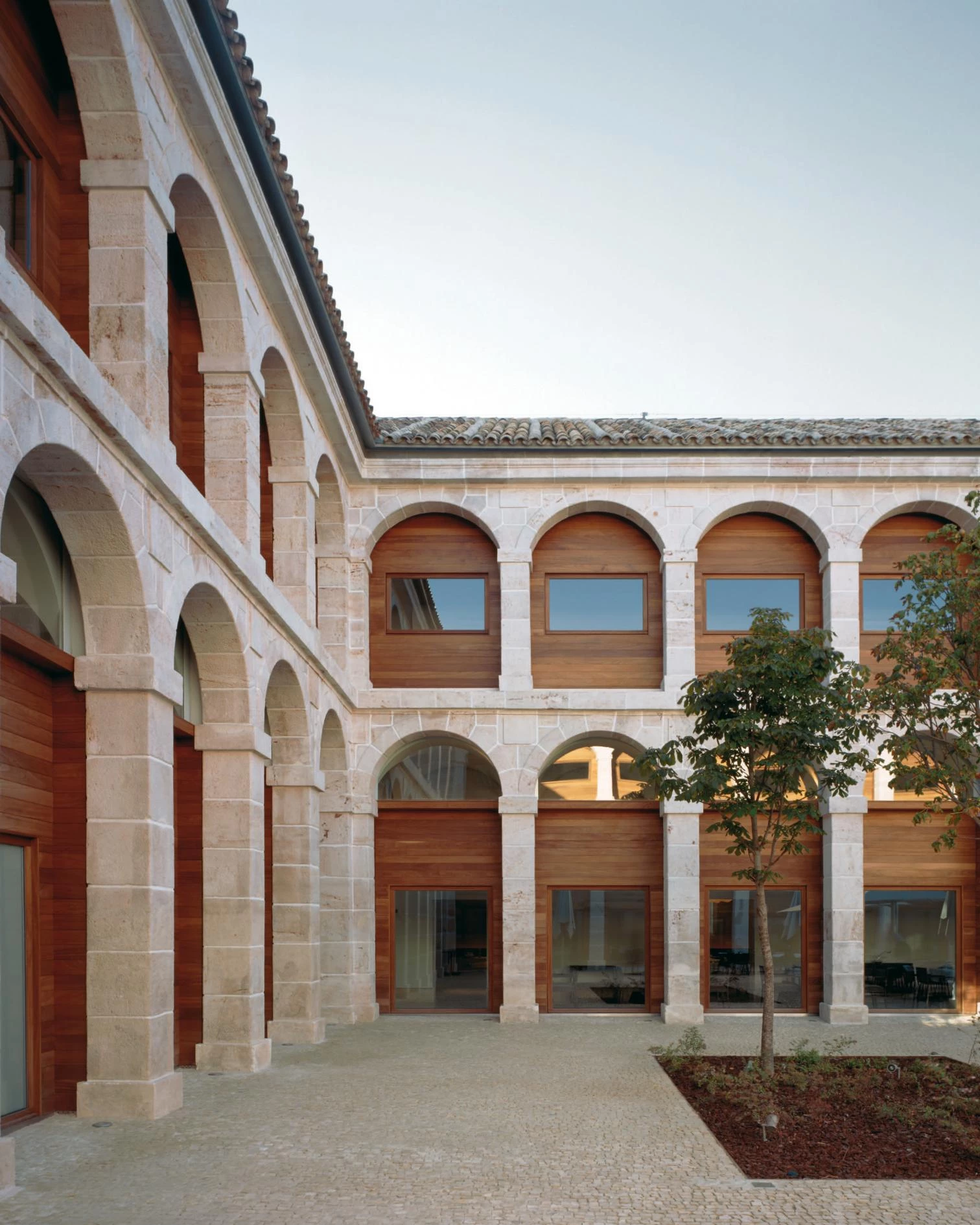 With the idea of restoring the medieval building, a series of interventions have been carried out to solve the building’s pathologies, and at the same time several new pieces have been raised to compact the fragmented group of buildings. In this way, the old cloister has been recovered closing the arcades with wood frameworks set back with respect to the ashlar fronts. For its part the deteriorated staircase connecting the two floors of the cloister has been renovated with the construction of a black metallic volume of cubic form that gives the whole space a new character.
