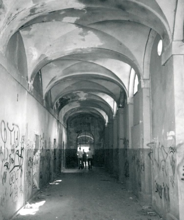 The old cloister has been remodelled by closing the arcades with wood frames that are set back with respect to the original stone wall, with the purpose of filtering light without interrupting the views of the garden.