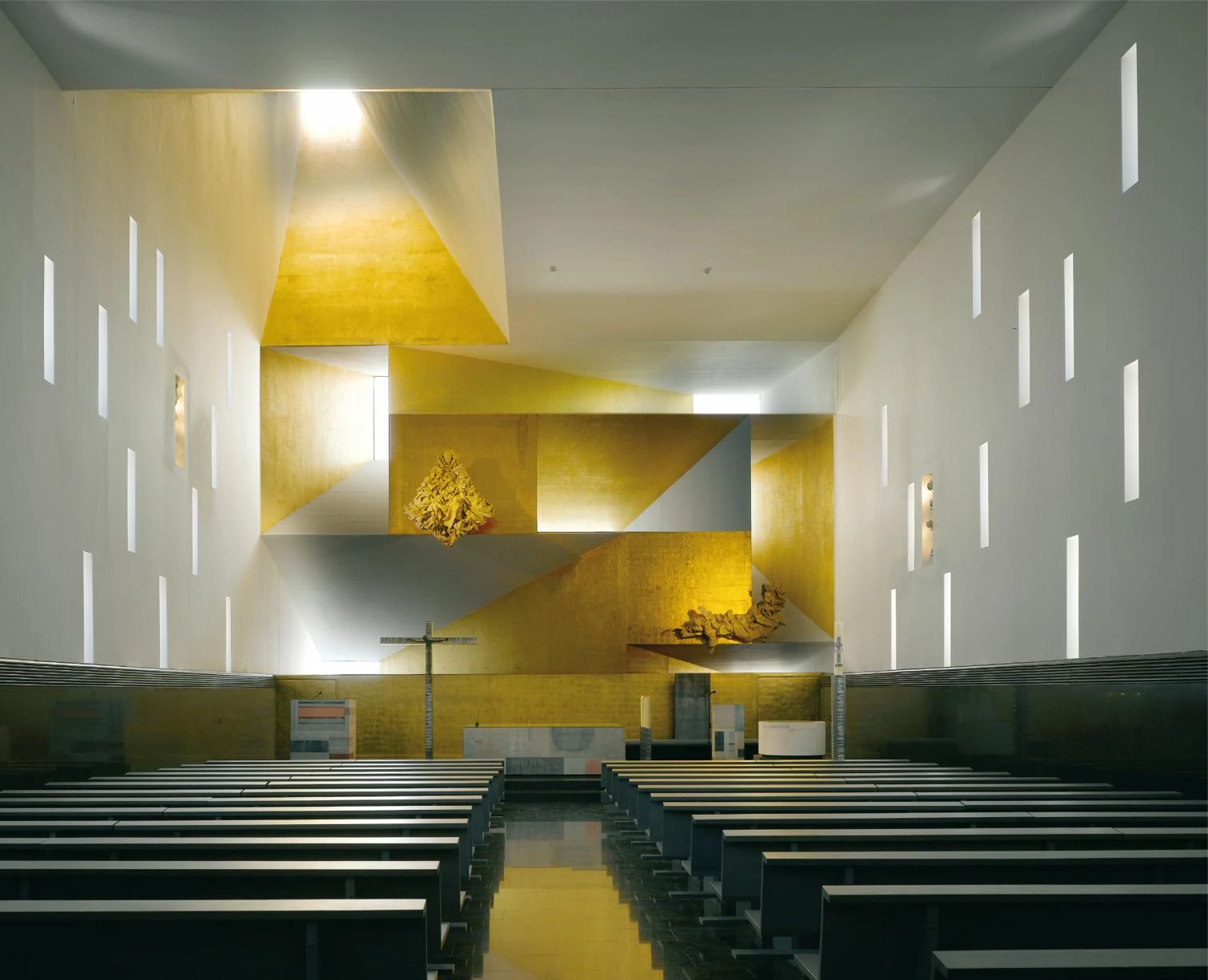 A single volume organizes the program – housing for priests, parish center and temple –, with a directional scheme. On one end, the skylights project outwardly creating a light-filled altarpiece in the temple’s interior.
