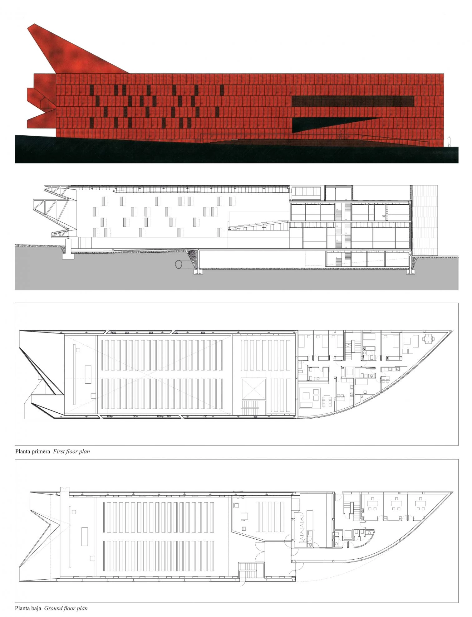 The new parish center of Santa Mónica, in the Madrid town of Rivas-Vaciamadrid – 15 kilometers south of the capital –, is located on a plot of complex features, long and narrow, adjacent to a future shopping center, on a piece of land that the town council ceded to the diocese. The new building materializes the third of the proposals presented. The first one, better adapted to the liturgical norms of the Second Vatican?Council, drew inspiration from Bernini’s plan for the Roman temple of Sant’Andrea al Quirinale, where the floor plan is an elliptical form with the transverse axis longer than the main one. In this way, the entry is through the short axis, on which the pulpit and altar were placed, concentrating the hierarchical density and placing parishioners on either side, along the main axis, the purpose being to offer a mass celebration in which participation follows centered, and not directional, schemes. With this layout the altar remains at the center, and parishioners have good views of the service and of one another. An elongated space was in this way transformed into a centralized one.