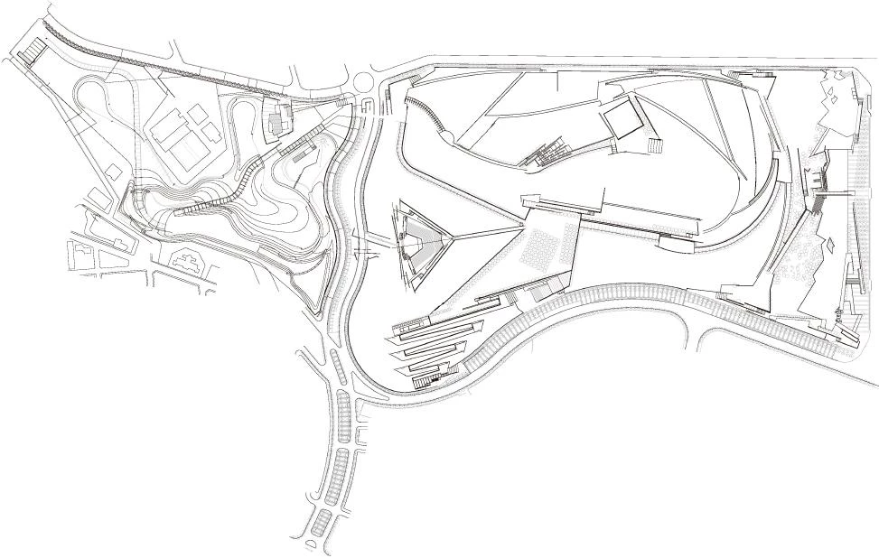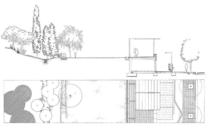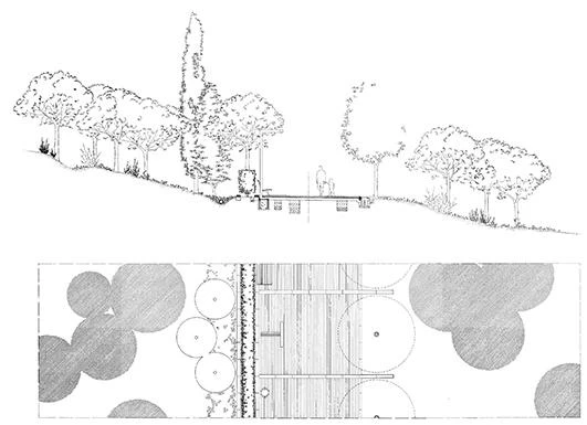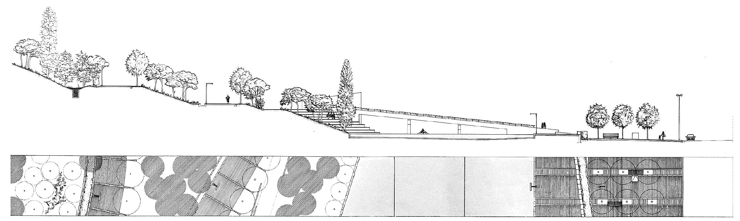 The boundaries of the park are marked by new perimeter paths that include parking areas and establish a clear relationship with the surrounding neighborhoods. A low wall and the service buildings at the different entrances physically configure the enclosure. For its shape and location, the park becomes a linear space connecting the city center with the landscape. A path goes through the whole space, linking the different spaces and facilities that have gradually fulfilled the process of building the park.