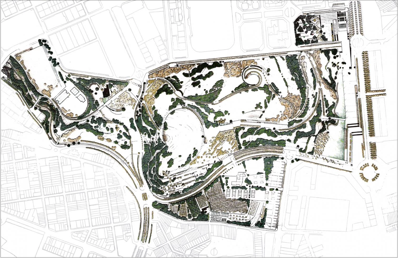 With an area of more than 40 hectares, and connected to a place that has become a new central space of the city, the park was maintained after a long battle during which neighbors fought to protect a green area outside the city, and that was used as an outdoor leisure area, from real estate speculation. From the beginning of the project, the aim set was to recover Catalunya Park as a natural space, both by preserving the landscape elements of woodland and meadows that already existed and by maintaining the peculiar topographical features of hills and hollows. Periodic popular tree-planting campaigns have reforested the area and contributed to its recovery by ensuring that it is considered a functional park.