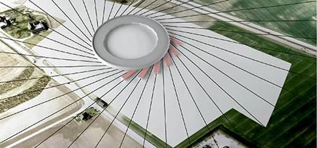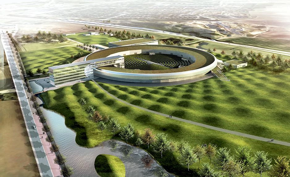 Max iv is a new synchrotron radiation facility at the University of Lund, in southern Sweden. Environmental factors such as thermal stability and minimizing ground vibrations were crucial for the performance of the new laboratory. In this location, the site’s existing sloping terrain and proximity to the adjacent highway were problematic, as ground vibrations from vehicular traffic that traveled through the landscape interfered with the laboratory’s particle accelerator built below ground. To mitigate ground vibrations, advanced parametric design systems were employed to create a landscape pattern based on wavelengths of the vibrations through the site. This solution also supports stormwater management by creating small valleys that collect stormwater, contributing to local agriculture. The final result is a wavy green landscape of mounds that combines meadowland grasses and plants developed in collaboration with specialists at the Swedish University of Agricultural Sciences in Alnarp. For construction, a 3D-model of the landscape was input directly into the GPS of the construction team’s bulldozers, using computer models to optimize the handling of the large ground masses and reduce storage to a minimum.