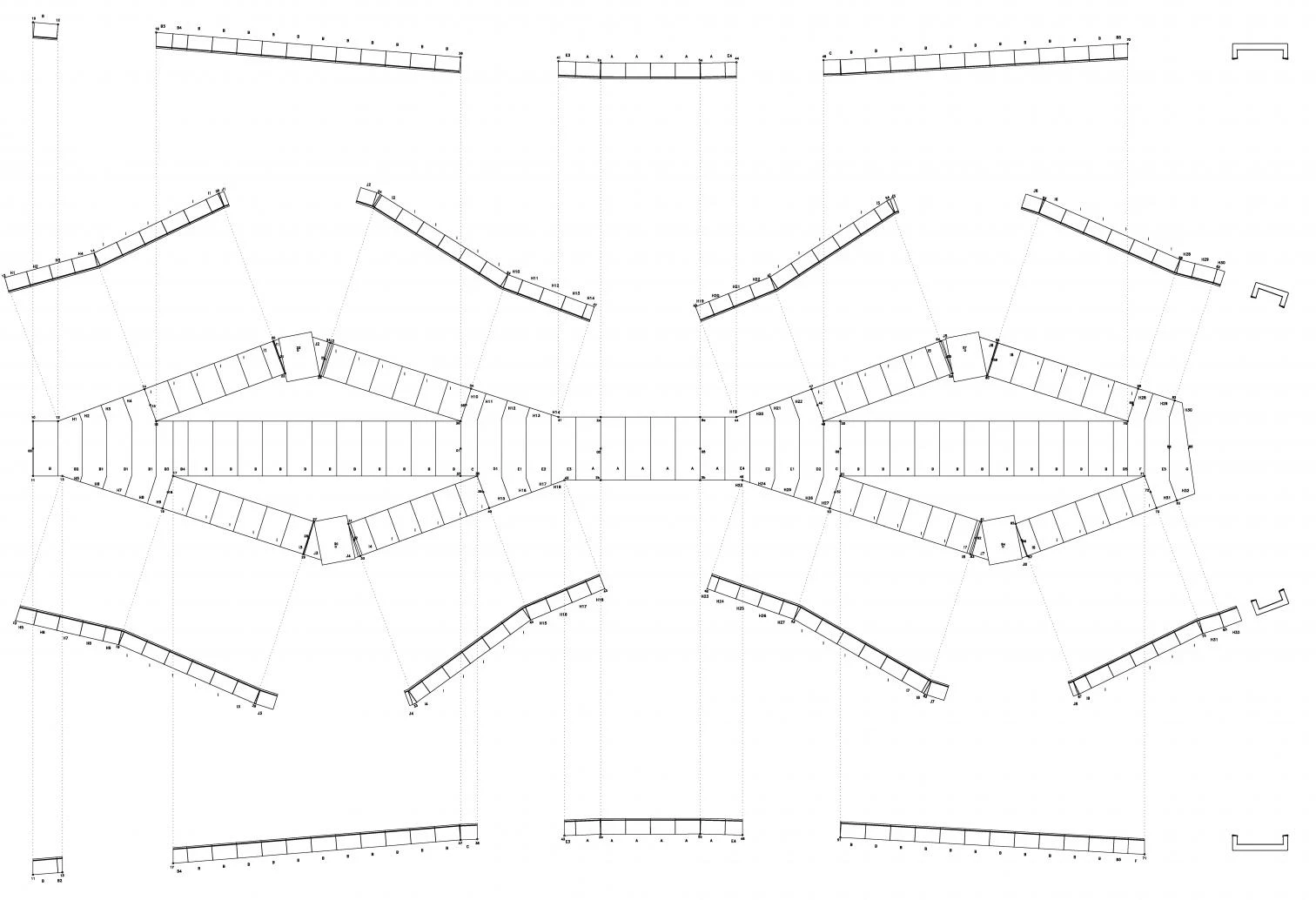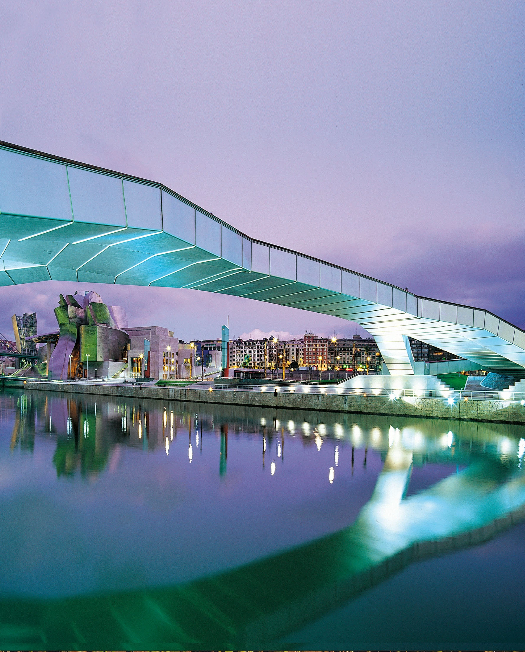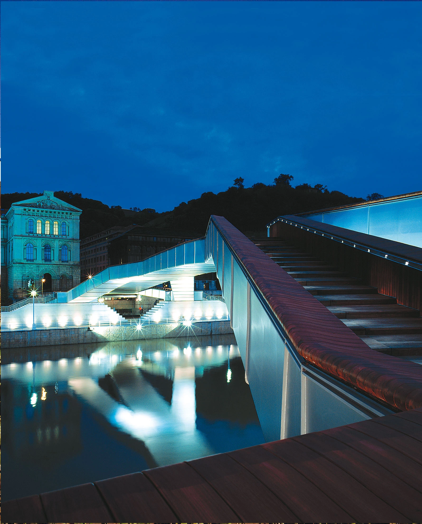 According to the guidelines of the competition – called in 1995 –, the footbridge had to connect the riverside promenades, on the lower level, and also the University of Deusto and Abandoibarra square, on the upper level. The search for a continuous element that could solve the tensions of the site – with the strong architectural imprint of the museum and the palace – and the circulations at different heights led to a single-span solution with six supports at different height, formed by a structural sheet of constant thickness and with two different skins, one of stainless steel and one of wood, that folds as origami to form the pads and the ramps.