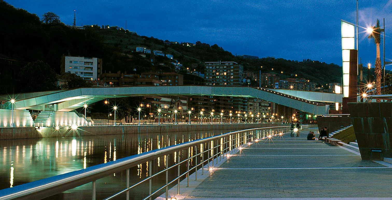 Raised on ramps and stone steps, the folded metallic piece looks like a dragonfly alighting on the dark mirror of the waters. A sculpture by Eduardo Chillida, made of Cor-Ten steel and entitled Begirari IV (The Watchtower), is a vertical contrast to the footbridge on its arrival at the Abandoibarra platform. Neither the engineer Fernández Ordoñez nor the Basque artist, friends and collaborators, saw their works completed.