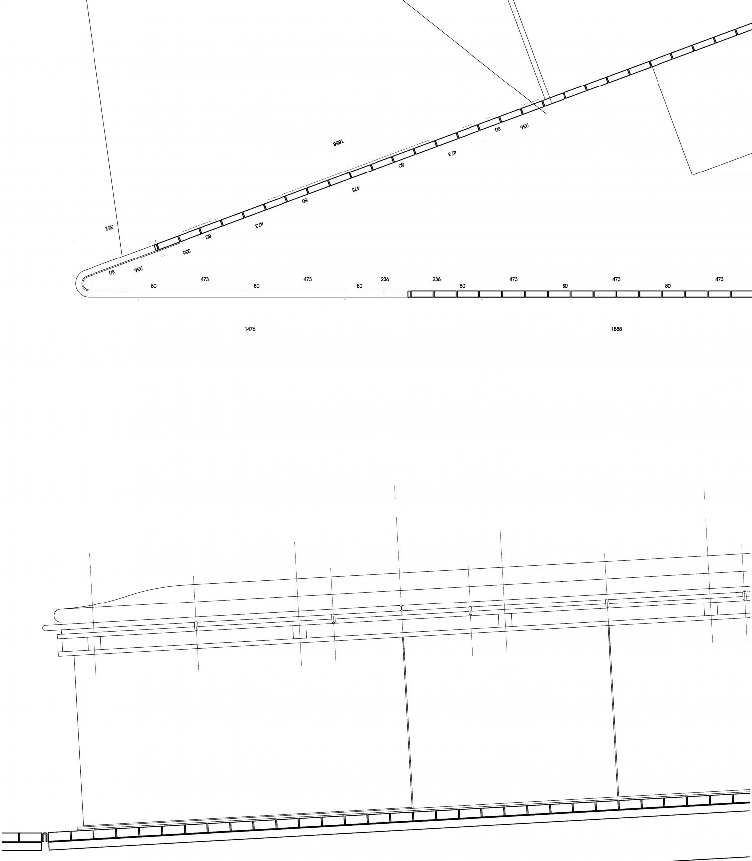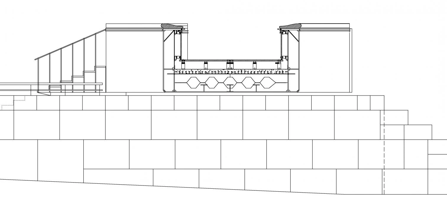 The exterior metallic skin is made of a series of prefabricated 20 mm thick steel sheets that are welded to one another and take on the load-bearing function of the footbridge. The welding joint is concealed below a steel overhang to produce a continuous skin effect. The interior of the footbridge, that is over six meters on its widest part, is clad in thin lapacho wood strips, giving it a warm appearance to contrast with the cold exterior steel enclosure. Sealing the encounter of both skins, thick wood boards act as sills of the side parapets of each stretch of the footbridge, and also as banisters and support. The structure within this double shell is made of a series of perforated steel ribs that distribute the load while allowing for the installations to run through their honeycomb holes.
