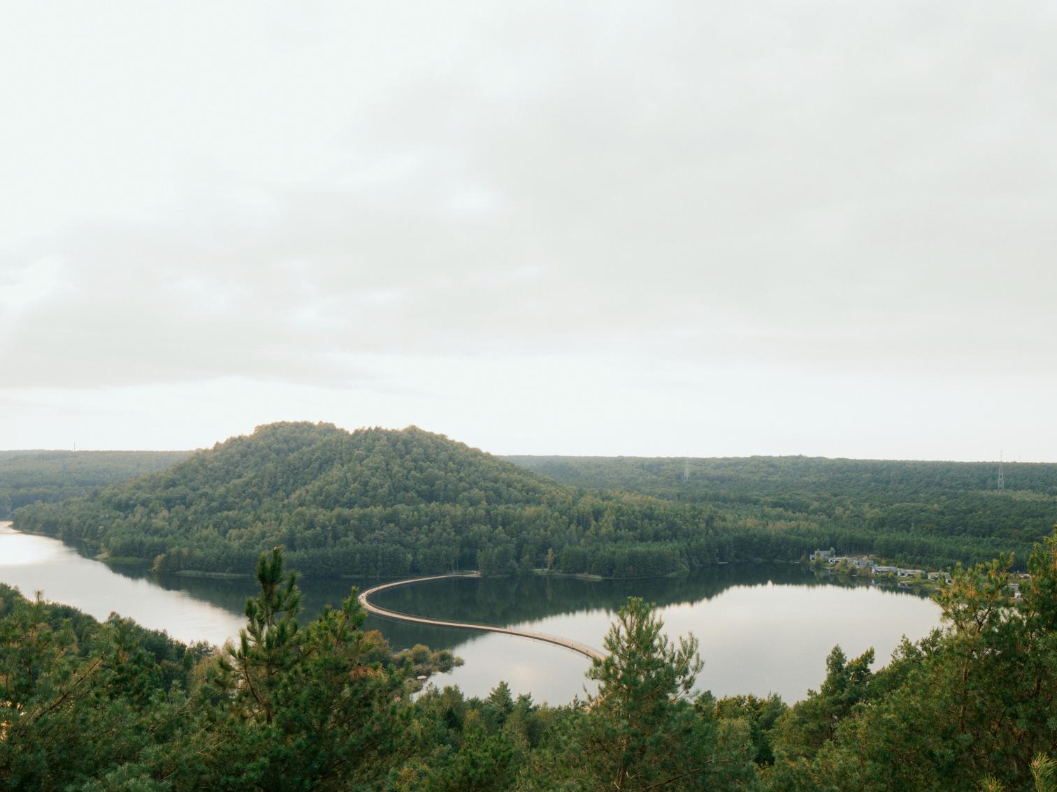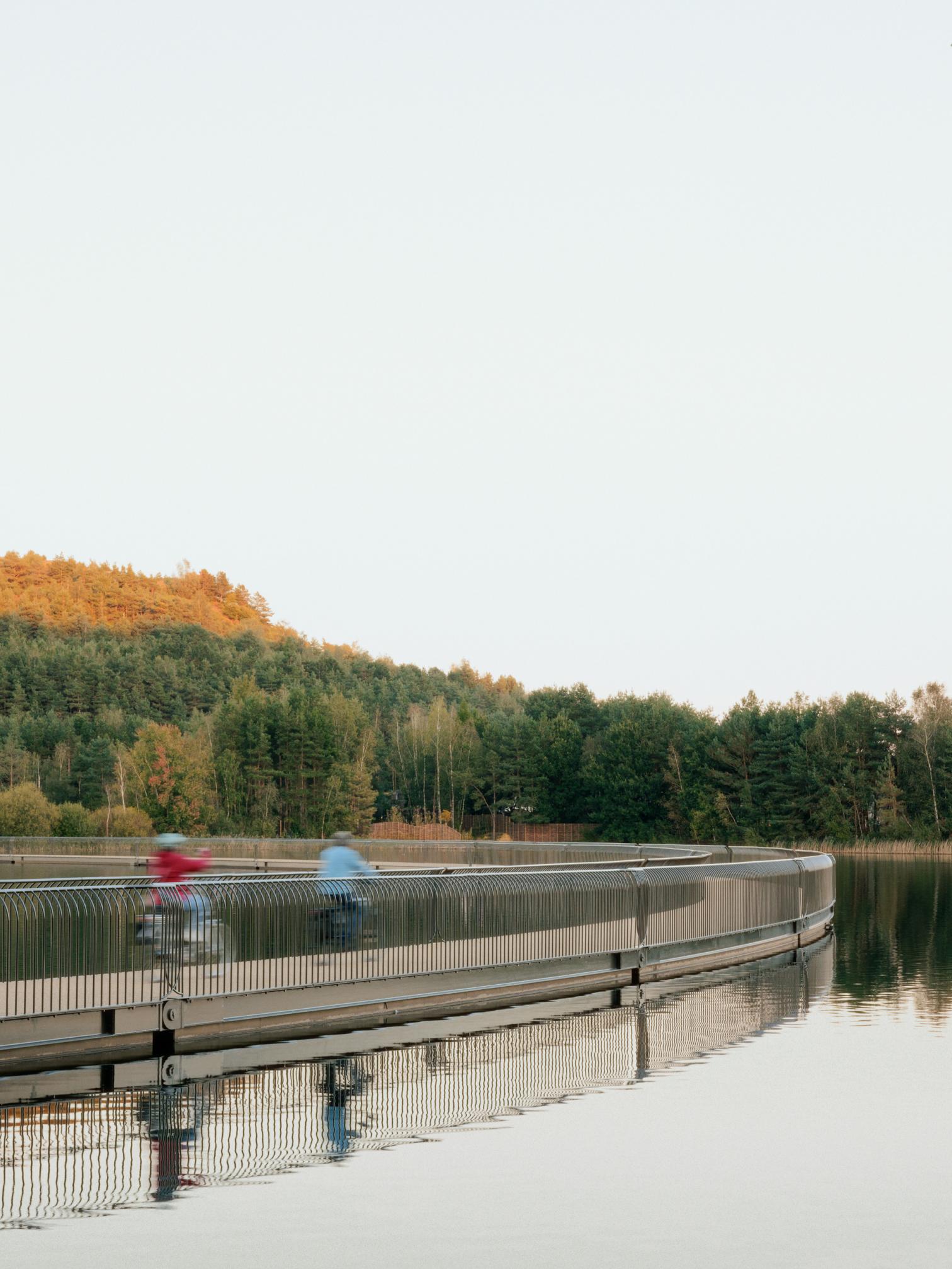 In the Belgian province of Limburg, Cycling Between Terrils is a 400-meter floating bridge that snakes its way between two imposing terrils, heaps of waste resulting from old coal mining activity, now transformed into natural spaces. This unique passageway for cyclists and walkers connects the municipalities of Dilsen-Stokkem and Maasmechelen, crossing an artificial lake formed by gravel extraction.
