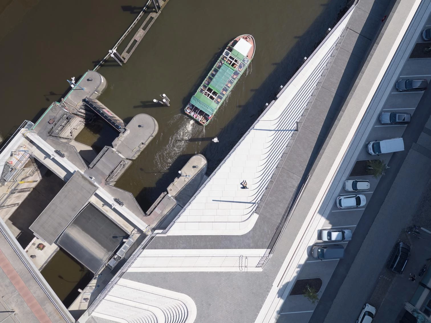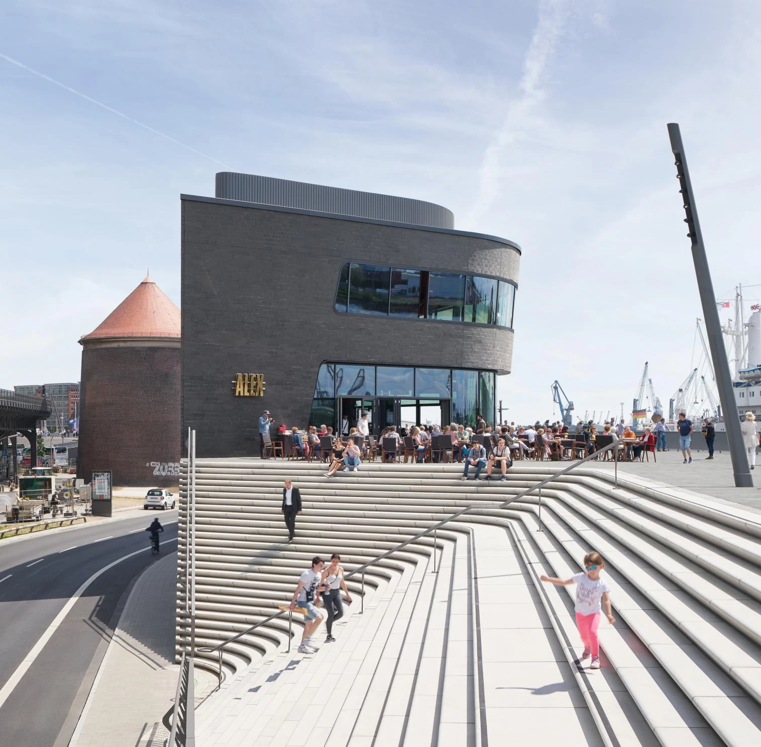 At the Niederhafen port area on the banks of the Elbe River, the British firm Zaha Hadid Architects has upgraded and reinforced the flood protection system of the northern German city of Hamburg. Resulting from a 2006 competition, the operation reconstructs the existing barrier, increasing its height. The linear structure is 8.6 meters above sea level in its eastern section and 8.9 in its western section. Stretching on top of the floor protection barrier, the riverside promenade links up adjacent neighborhoods, and with a mínimum width of 10 meters offers generous public spaces, providing bike lanes and wide ramps. The oscillating walkway is carved with stairs that become small amphitheaters. The pedestrian areas are clad in a dark, anthracite-colored granite that contrasts with the light gray granite of the stairs.