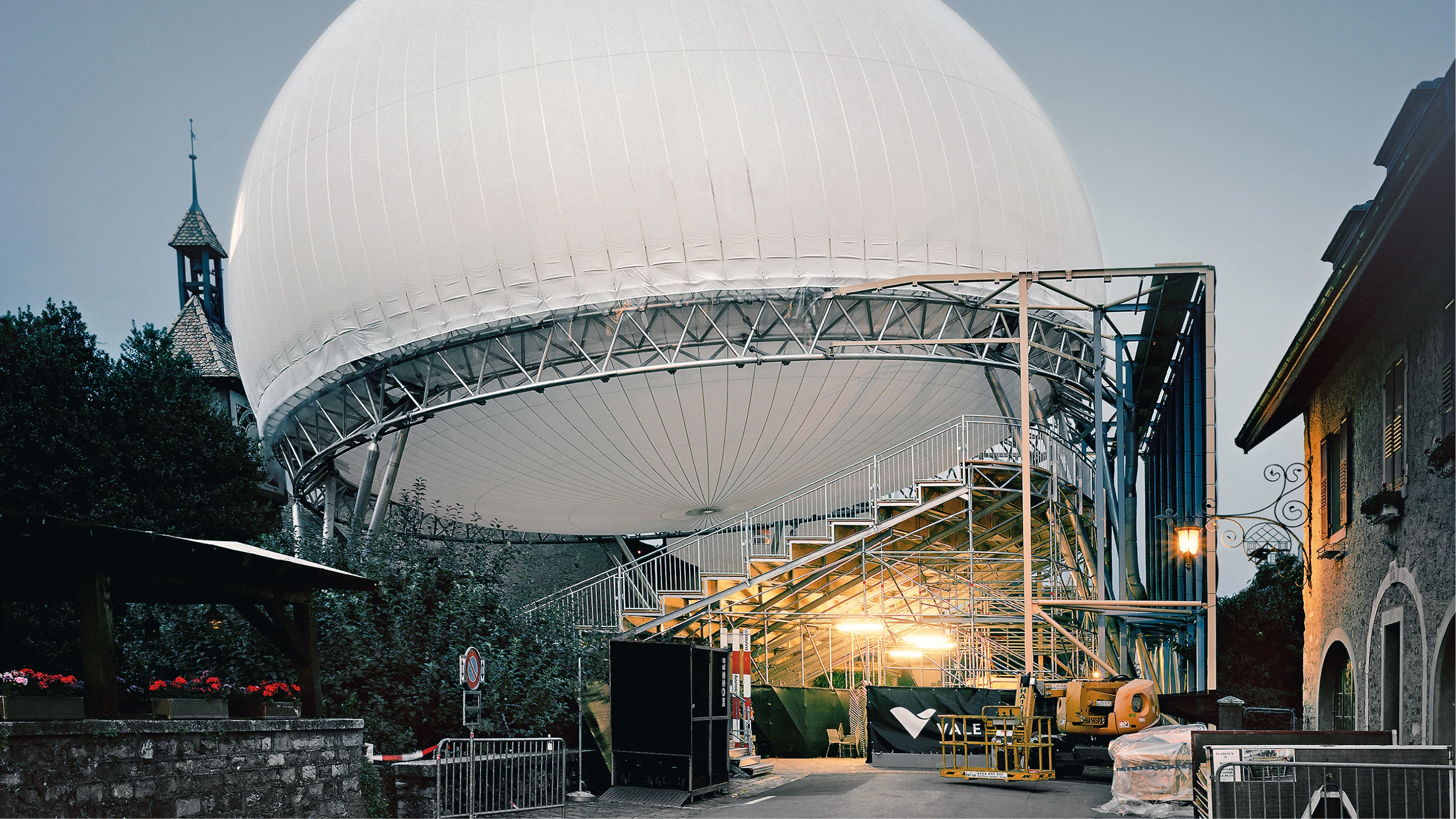 The most unique constructive aspect is the dome, measuring 25 meters in diameter, and made out of a membrane of polyamide fibers that is inflated with helium, so that the vast hemisphere, rotated 90º, floats above the stage, and at a certain distance from it, just as if it were a hot air balloon that becomes a visual landmark gently posed on the town’s silhouette. The surface of this hemisphere is reflective, and this feature inspired the project’s name: Luna (moon).