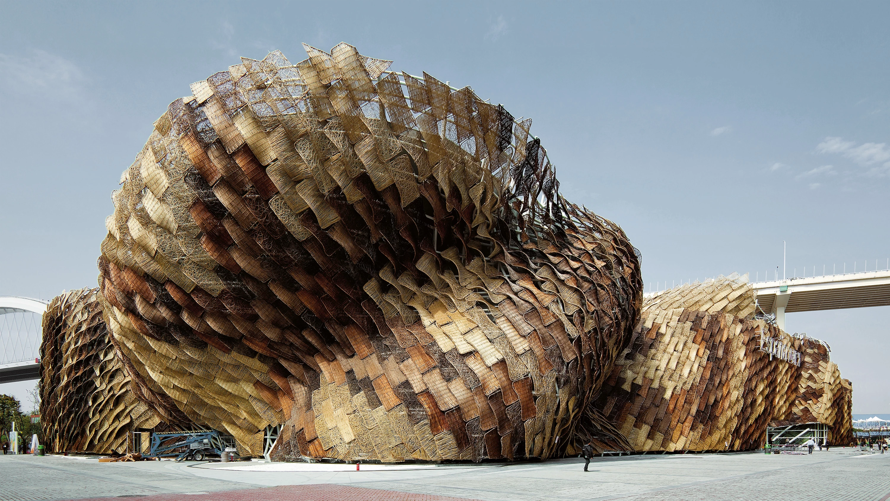 Para realizar el proyecto del Pabellón de España en la Exposición Universal Shanghái 2010, la SEEI organizó en 2007 un concurso público de ideas al que se presentaron 18 de los estudios españoles de mayor proyección internacional. El jurado eligió el proyecto del Estudio Miralles Tagliabue, una construcción de aspecto orgánico, con fachadas onduladas resueltas con un material insólito: el mimbre. Las técnicas de la cestería, del trabajo manual con fibras vegetales, son una tradición ‘global’ que comparten todas las culturas y todos los tiempos. Aunque cuenta con variaciones específicas según las zonas, se utiliza casi de la misma forma en Oriente y en Occidente; en este sentido, la elección del material del pabellón sirve para tender un puente entre dos culturas, la española (visitante) y la china (anfitriona).