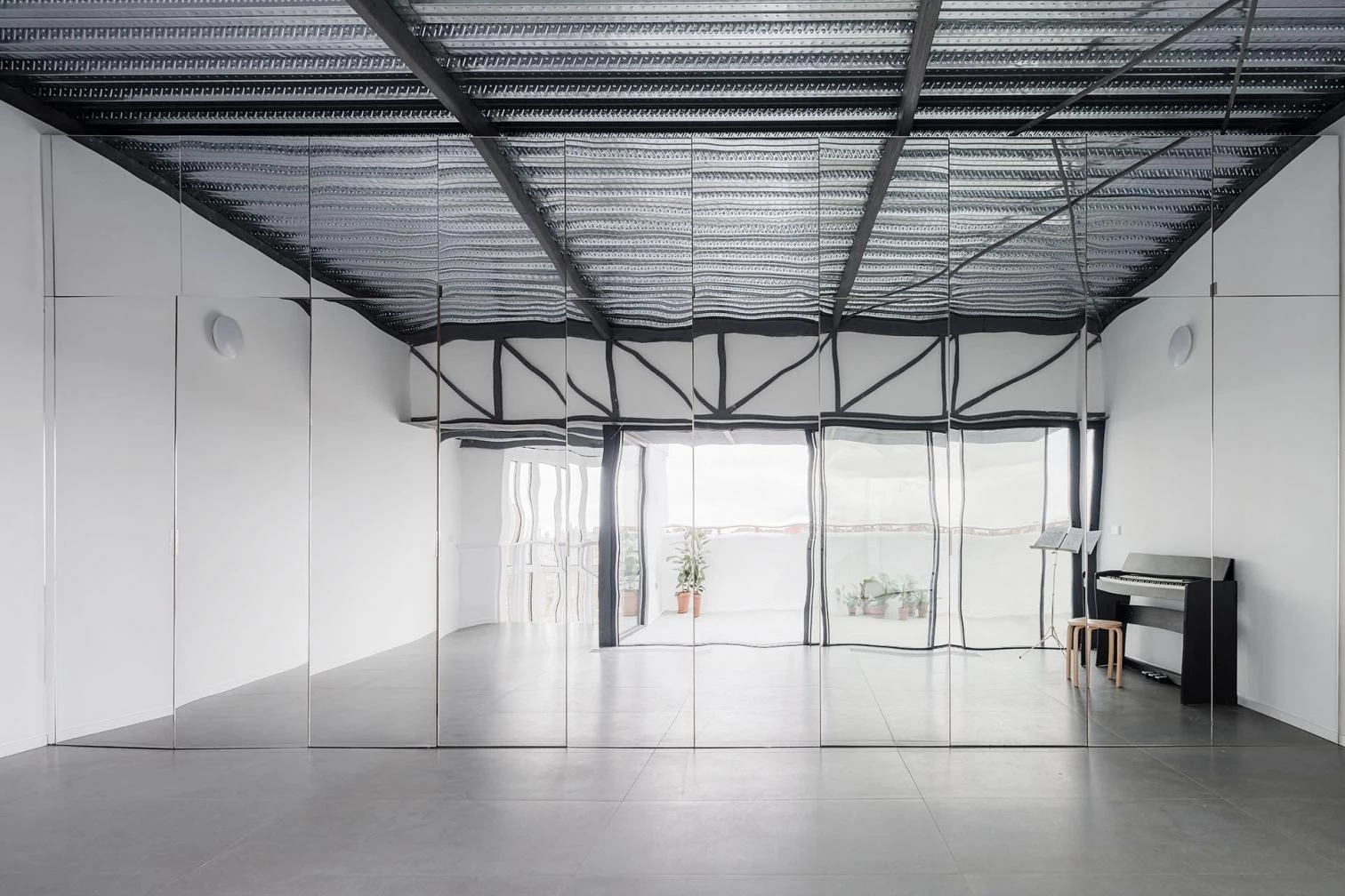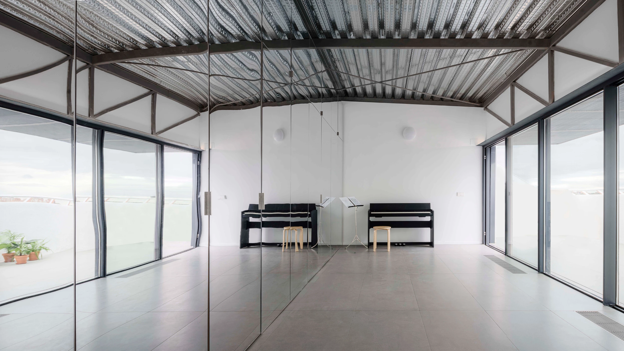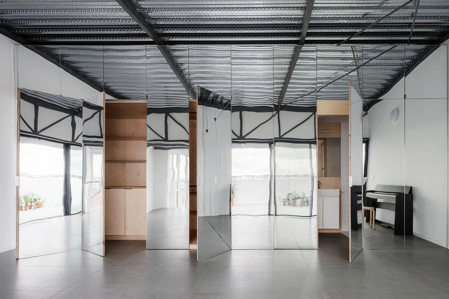 Finally, the nature of the artist’s work requires a spacious and versatile interior, one which can provide all that the different disciplines converging in his creations call for, not to mention the changing everyday needs of his family. In response to these conditions, the support program—a kitchen, a bathroom, and storage—is fitted into a 1.1-meter band, allowing for a single large workspace—6.5 x 3.5 x 3.5 meters—that is autonomous, flexible, indeterminate, and open to a generous terrace. Perception of size and scale is altered by the mirror cladding of the ‘equipment wall.’ With its reflections of the structure and the city’s horizon, the space changes over the course of the day.