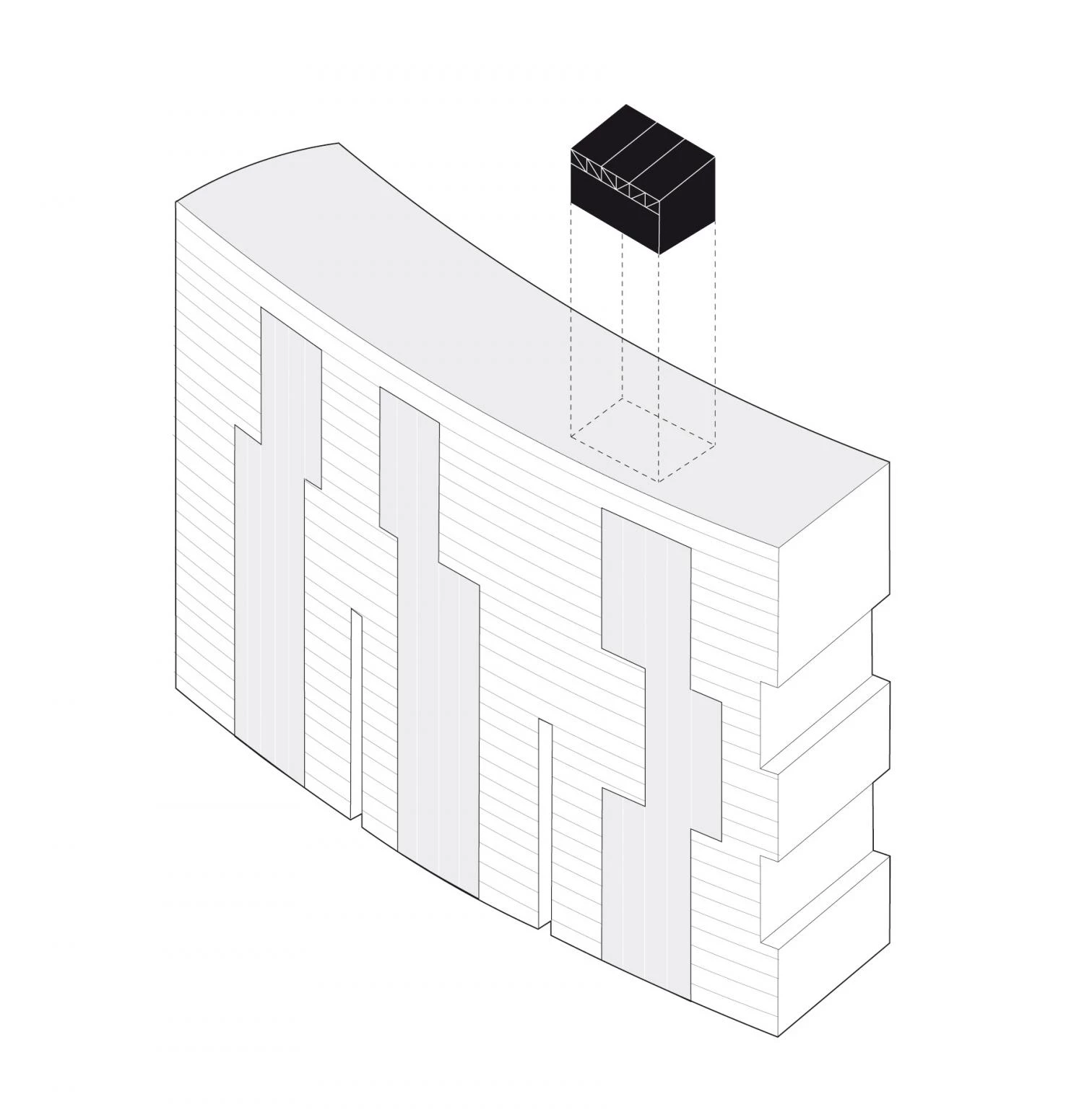 The second concept addresses the logistical complications of the pavilion’s site: a 15-floor building equipped with a small freight elevator (just 1.3 x 1.1 x 2.15 meters) is the only means of transporting material up and down. With this in mind, we opt for a construction system based on an assemblage of small steel elements: a framework of pillars, beams, and a truss. This results in a spatial structure that shapes the external volume and frees the interior of supports. In addition to solving the initial problem, the system allows possible dismantling and subsequent reuse of all elements, reducing the complex’s final carbon footprint.