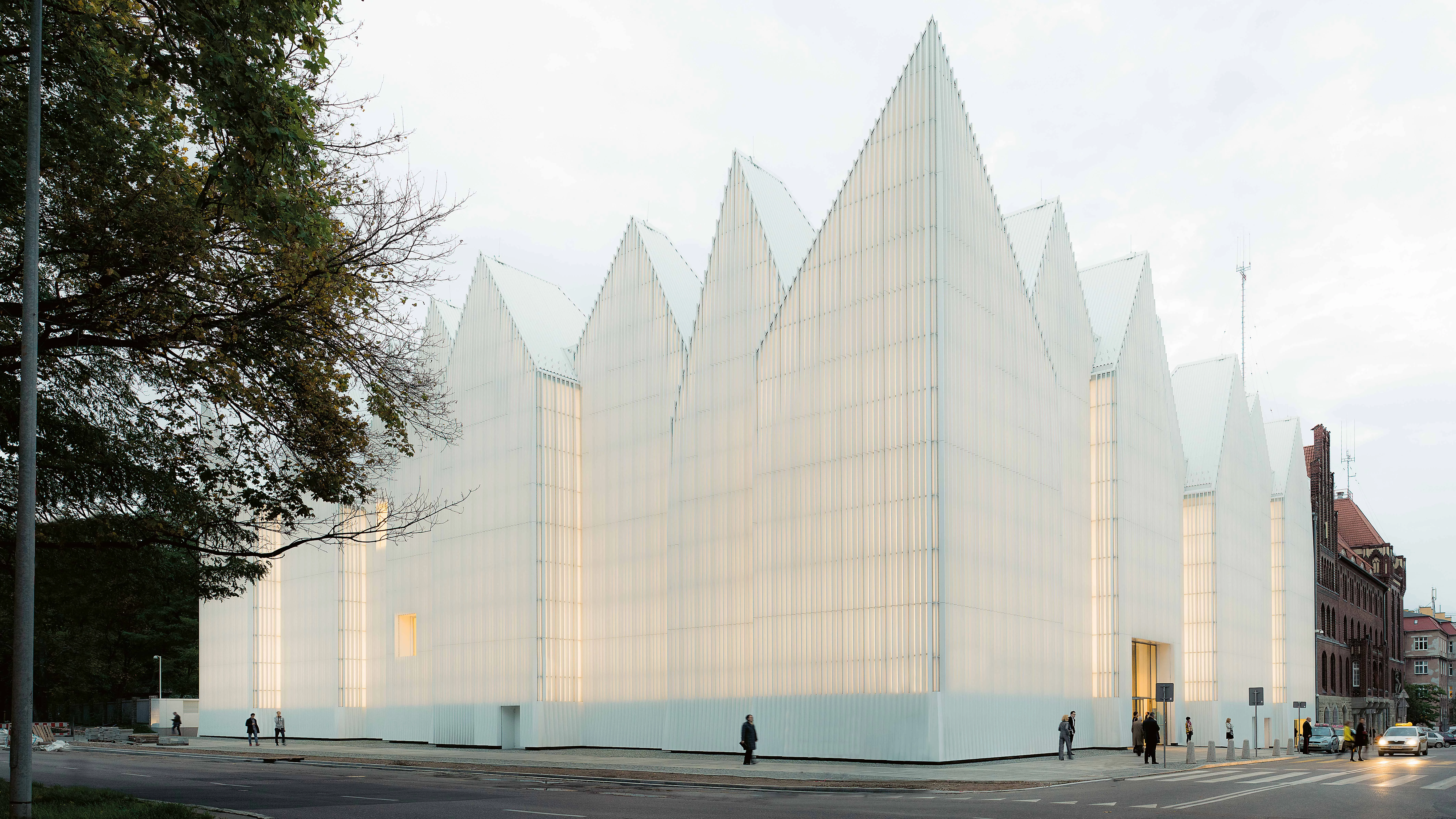 A German territory from 1919 to 1945, the city of Szczecin suffered heavy Allied bombings during World War II, and lost much of its urban heritage. The new Philharmonic Hall reconstructs the corner on which the Konzerthaus (the old auditorium) used to stand until it was reached by a bomb. The new building takes from its predecessor in the geometry of its roofs and the predominance of the vertical form, but distances itself from the past with a luminous glass and aluminum skin. Inside, the existence of a perimeter ring accommodating all the service spaces made it possible to create a large void for a symphonic hall seating an audience of 1,000, a chamber music hall for 200, a multipurpose space for exhibitions and conferences, and a huge foyer. The circulations are resolved through the formation of a continuous promenade connecting functions and levels. From a compositional point of view, the dominant formal purity is broken by the explosion of expressivity that defines the main hall, where a motif based on the Fibonacci sequence and whose fragmentation increases the distance from the stage gives shape to an ornamented space which, with its gold leaf coating, recalls classical tradition...[+][+]