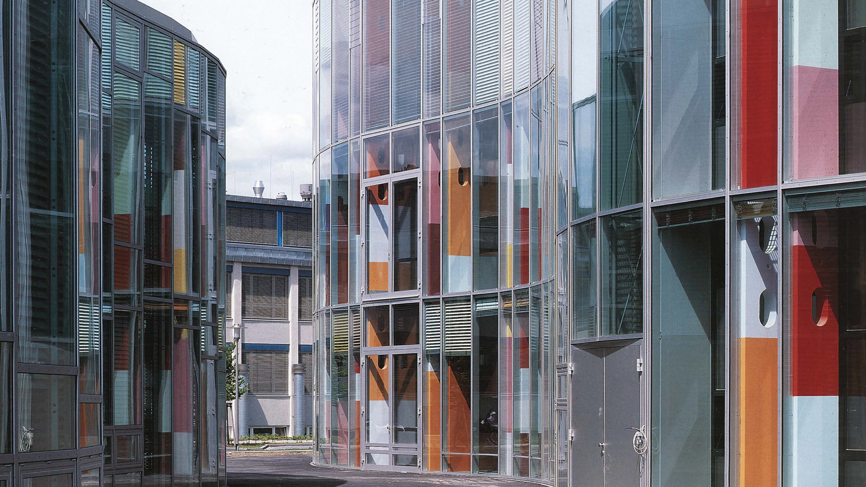 The Adlershof district, in the southeast of Berlin, was the center of aeronautical research in East Germany after World War II, and after the reunification it has become a technological hotspot. In contrast to the austerity of the surrounding structures and the orthogonal logic of a program devoted to research, the sinuous and colorful boundaries of the two buildings react to a group of mature trees to the east and create a winding passage between them. The double glazing of the facade integrates the building’s structure with the system for natural ventilation: paired columns divide the perimeter into alternating sections of fresh and exhaust air. The spaces between the columns function as solar flues enabling natural convection, as air is drawn into the cavity on each floor through low-level openings in the outer skin. Exhaust air leaves through the upper opening of the sash windows and passes, via holes in the concrete columns, up to the roof level. Together with effective solar shading, this concept minimizes energy demand. The facade makes reference to the laboratories, devoted to photonic sciences, by applying the full range of spectral colors on its undulating surface...[+][+]