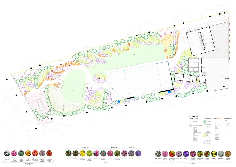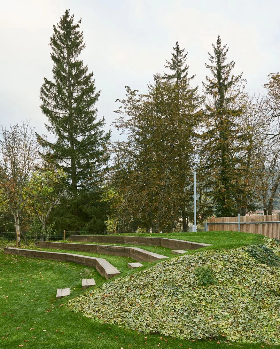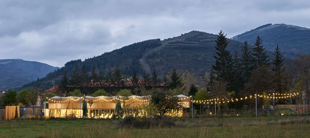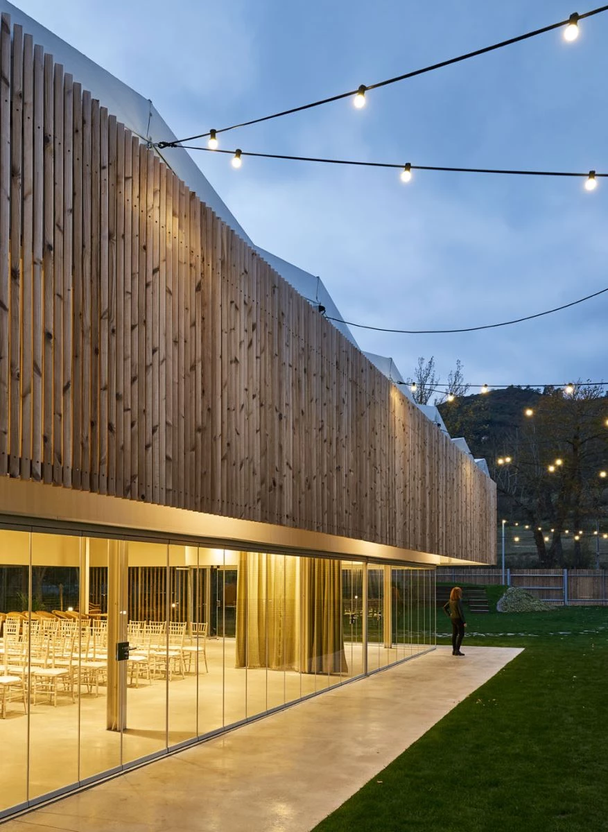 A work of the Madrid practice of Rubén Picado and María José de Blas, this venue for banquets and other events in Hotel Echaurren, in the La Rioja town of Ezcaray, takes its name from the grove (arboleda) where it is located. The design addresses the sporadic use of the building while complying with regulations and a tight deadline: four months for execution. Thus the choice of a construction system that can be taken apart, with lightweight, self-supporting Purever panels resistant to the inclement climate conditions of the area: strong winds, plenty of snow, intense cold. To integrate itself into the place, the complex reduces its scale and fragments into small auxiliary blocks containing the kitchen, refrigeration chambers, dressing rooms, and bathrooms. The largest space, measuring 325 square meters, is diaphanous and opens on to the exterior. Including elements of local crafts, the event space is wrapped with curtains designed by the Madrid architects and made in an old blanket factory, while the ceiling is clad with screens of pressed cotton. To reduce the visual impact of the complex, the vegetation placed in it will grow on superposed metal structures and wooden lattices covering the south and west facades. Picado de Blas Eugeni Pons